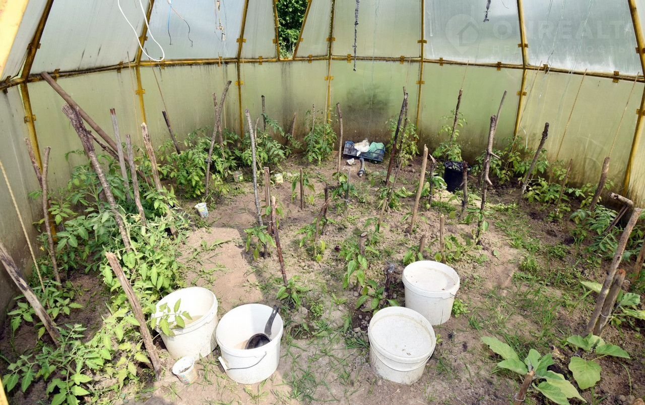 • Участок: 25 соток плодородной, ровной земли прямоугольной формы с забором по периметру, плодовыми деревьями, кустарниками и цветами. Есть парник из поликарбоната для выращивания овощей и зелени, а также возможность установить бассейн (сейчас разобран).