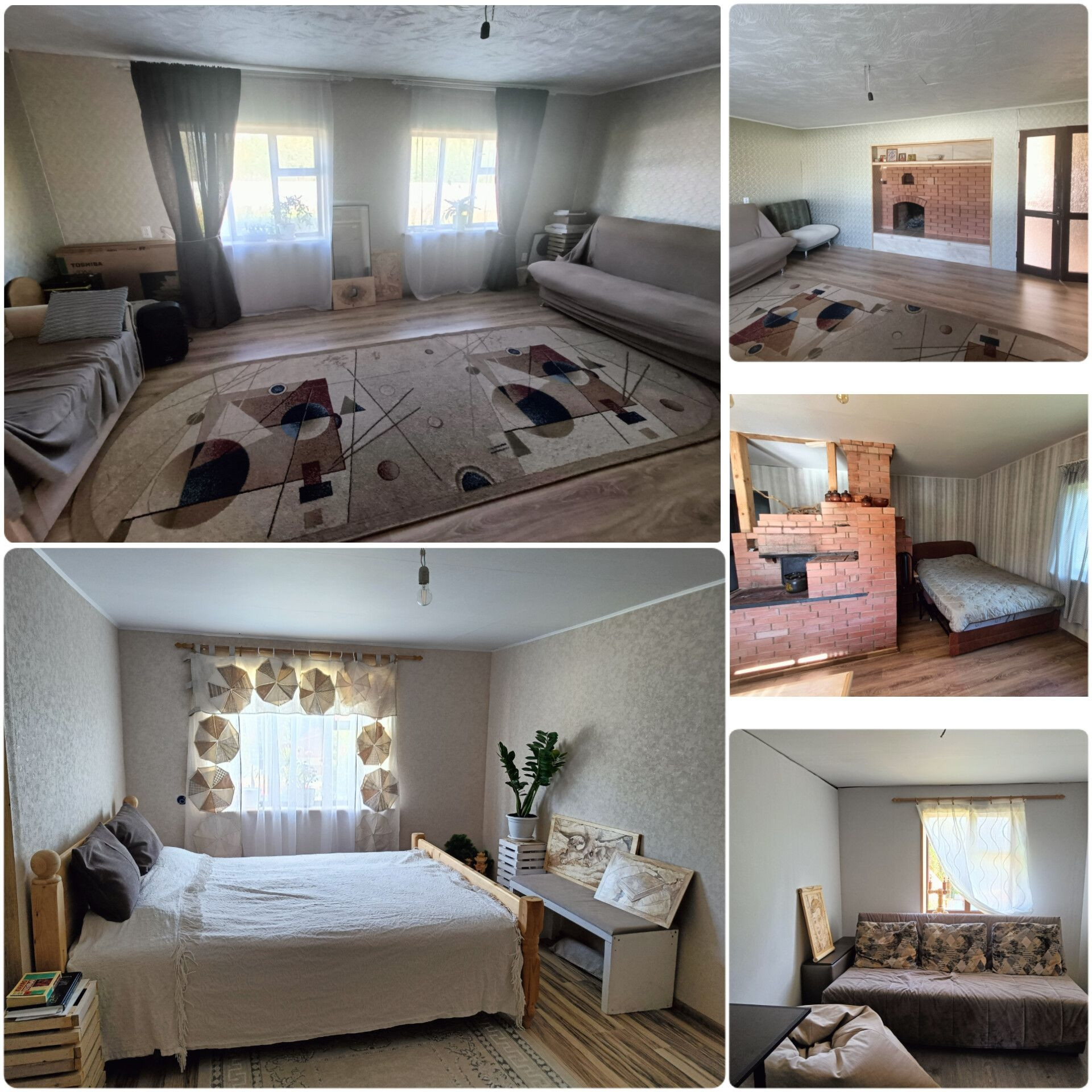 1 этаж: гостиная, 1 с/у (заведена холодная вода), кухня и обеденная (где очень красивая и функциональная русская печка), там же есть спальное место, которое можно превратить в отдельную комнату при желании;
