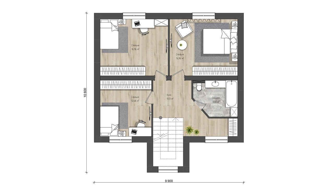 - на втором этаже три спальни, холл, также огромный санузел;