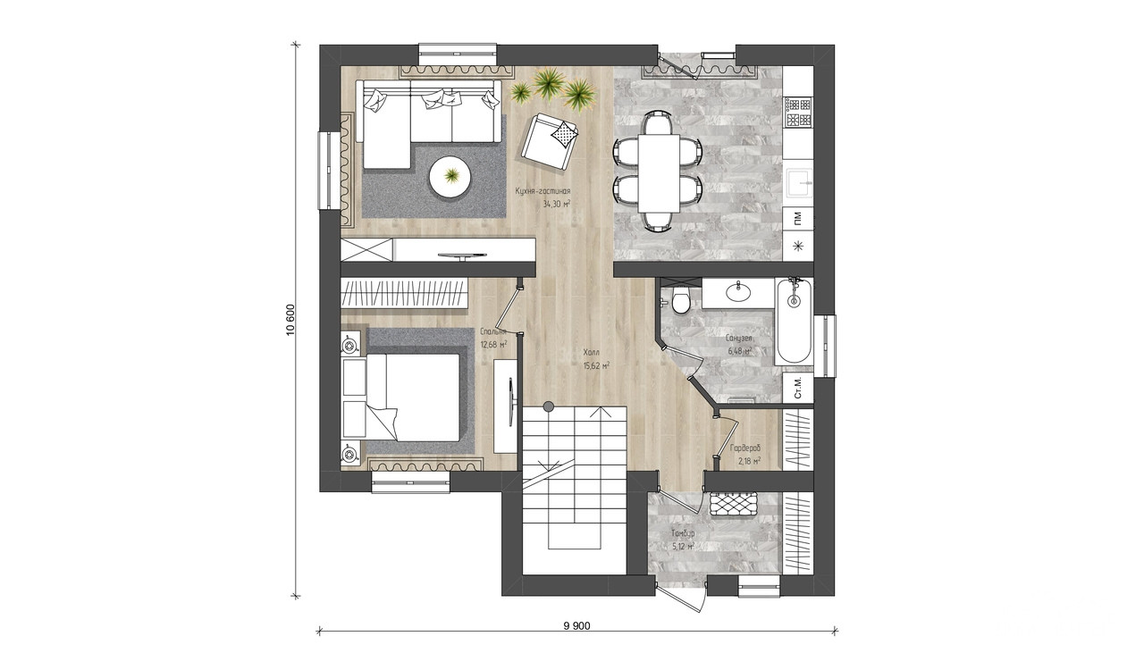 - на первом этаже большая кухня-гостиная (32 кв.м.), тамбур, холл, спальня, гпрдеробная и огромный санузел;