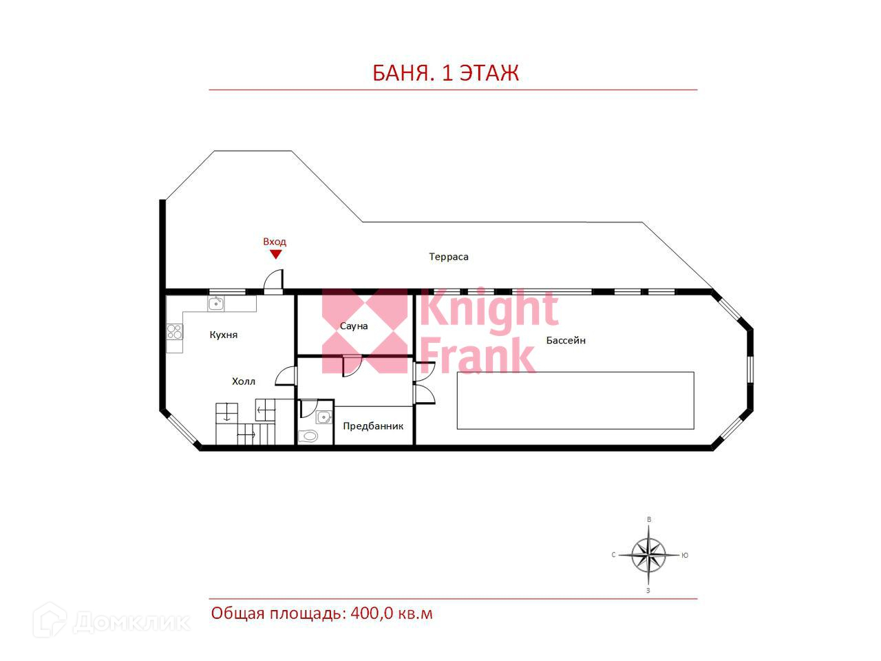 1 этаж: каминный зал с кухней и столовой зоной 36 кв.м, с/у, предбанник, душевая комната 13 кв.м, парная 12 кв.м, помещение бассейна 122 кв.м, чаша бассейна 36 кв.м (проект бассейна с противотоком, водопадами, подсветкой и детской зоной под ключ прилагается), открытая терраса под общей крышей здания 1007 кв.м;