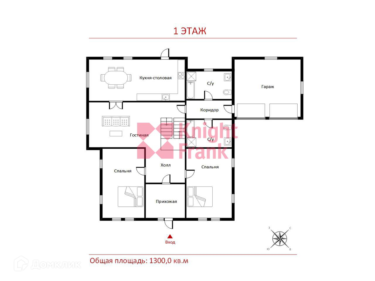 1 этаж: просторный холл, большая гостиная, 2 гостевые спальни, 2 с/у (ванная, душевая), кухня с обеденной зоной и выходом на террасу, выход в теплый гараж на 2 м/м,
