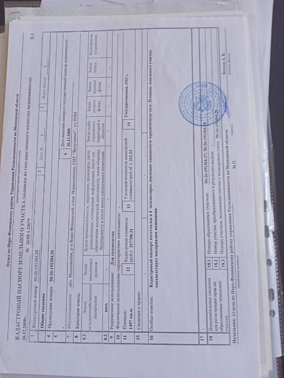 Московская область, Наро-Фоминский район, Сельское поселение Перврмайское, СНТ "Ватутинки" , участок №284. Кадастровый номер земли 50:26:191304:28.