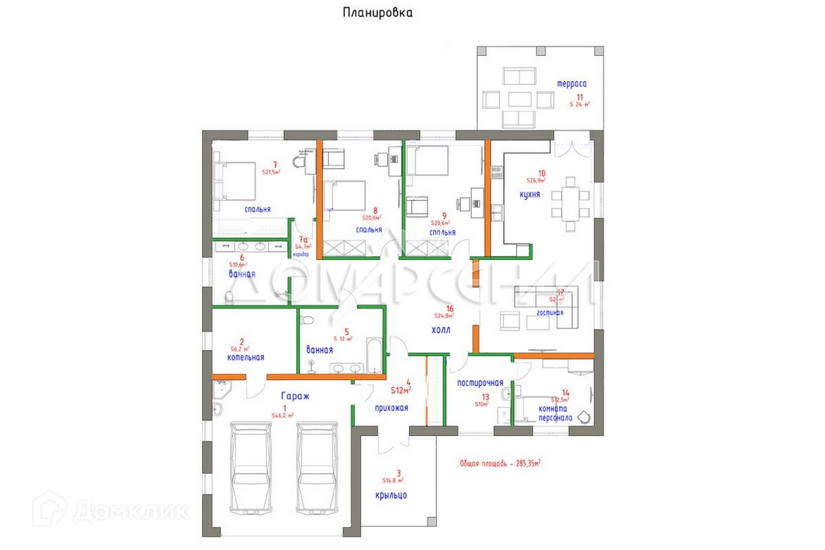 Планировкой предусмотрено: 1 этаж: Объединенная гостиная с кухней с выходом на открытую веранду, 4 спальни (21 м, 20м, 20м, 12,5 м), 2 с/у, постирочная, котельная, гараж на 2 а/м.