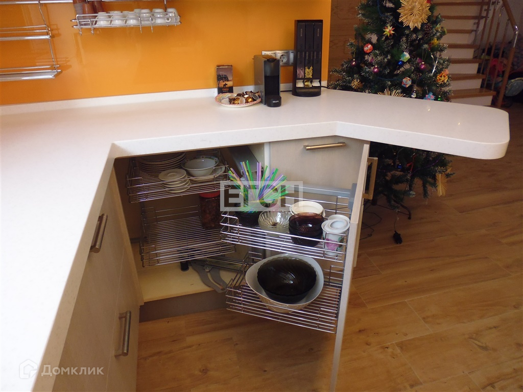 На 1-м этаже просторная кухня-гостиная, прихожая, бойлерная, санузел. Пол с подогревом, керамогранит. Из гостиной есть второй выход на участок для барбекю, перед домом- участок для парковки на 2 м/м. Кухонная мебель фабрики ZETTA(Италия), столешница из искусственного камня, делали под заказ, фартук из закаленного стекла, дверцы с доводчиками, угловые шкафы с выдвижными механизмами. Встроенная техника Bosch: газовая плита,вытяжка, духовой шкаф, посудомоечная машина. Лестница монолит бетон, ступени- дерево, дуб.
