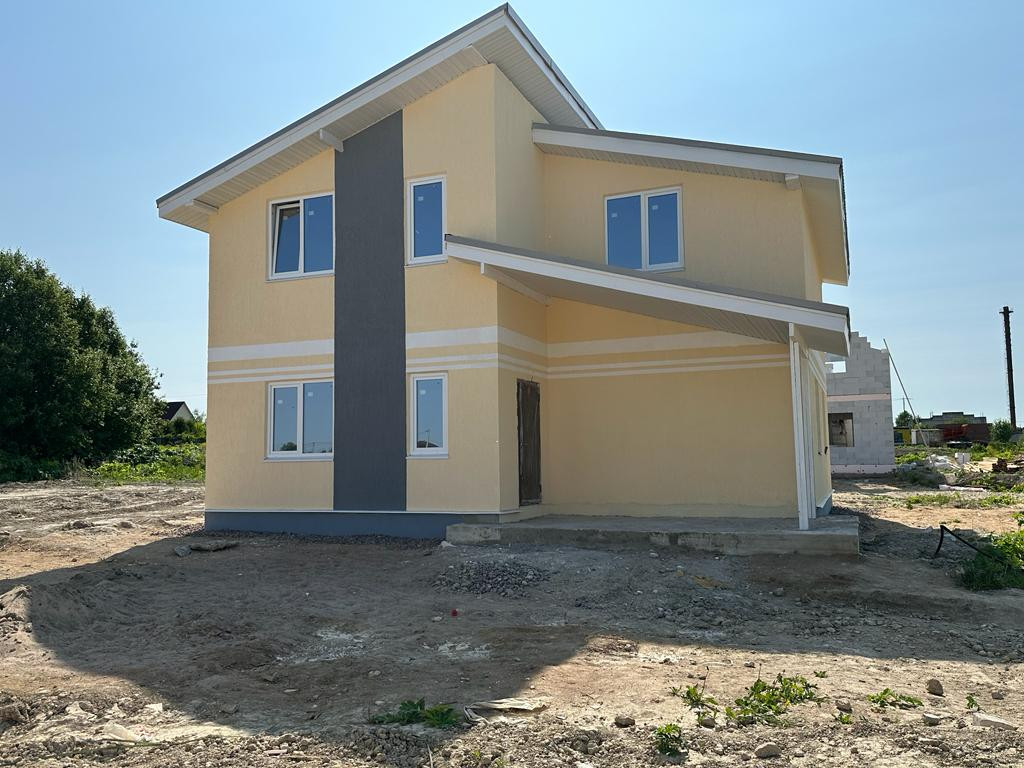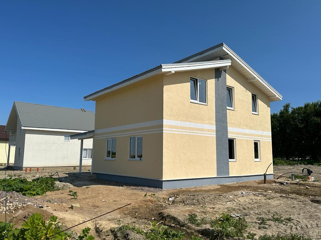 Фундамент - бетонная плита, сделана разводка по дому воды и электричества (выделено 15 кВт). Крыша - металлочерепица. Фасад покрыт декоративной штукатуркой КОРОЕД и окрашен.