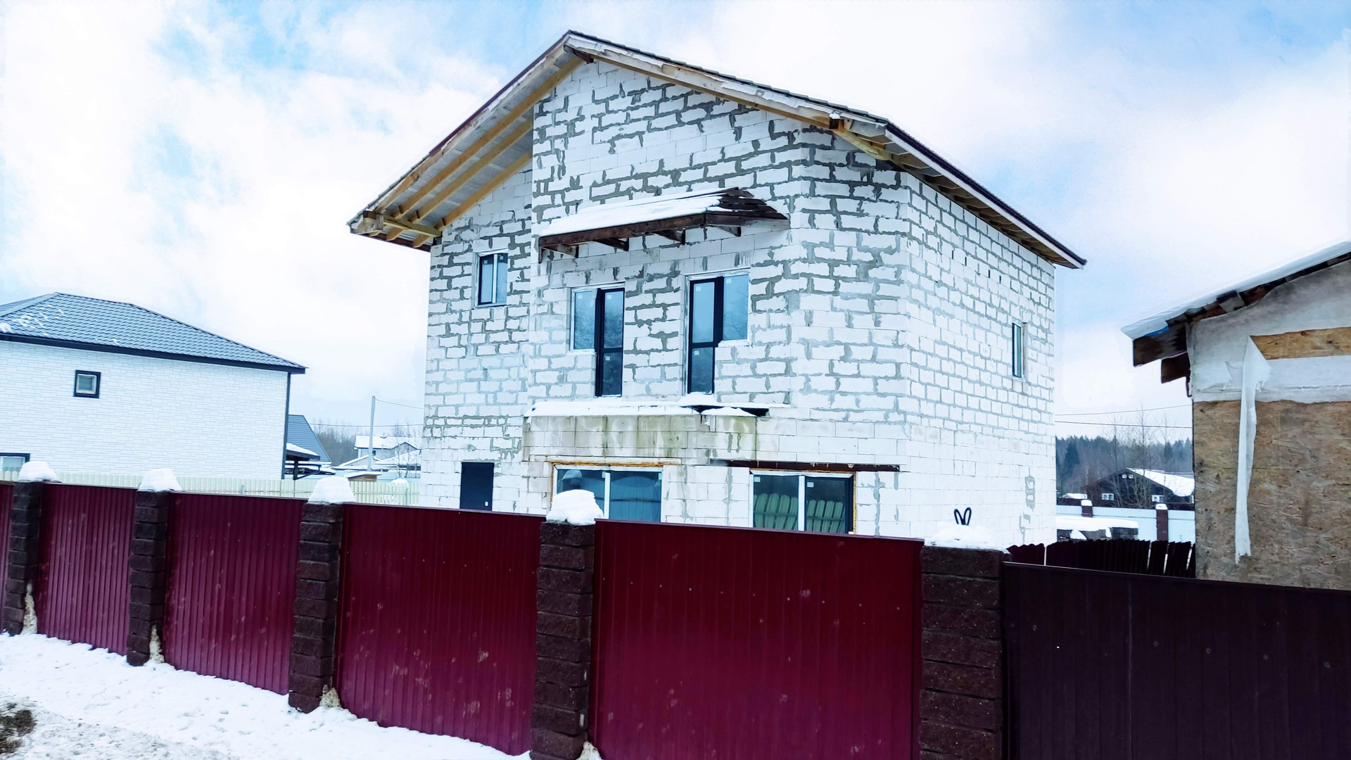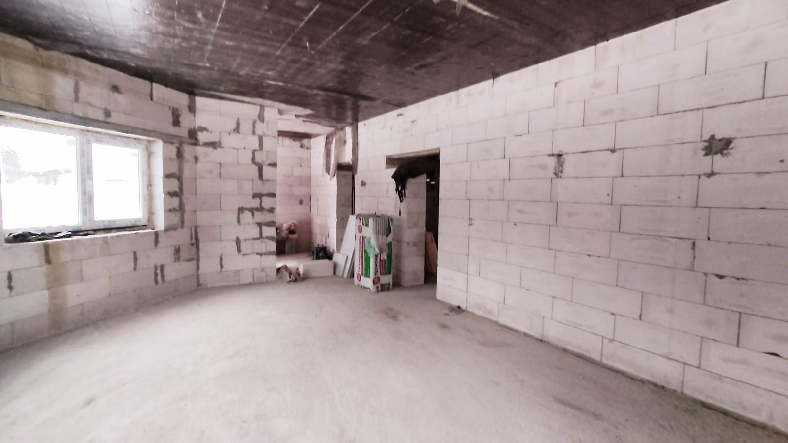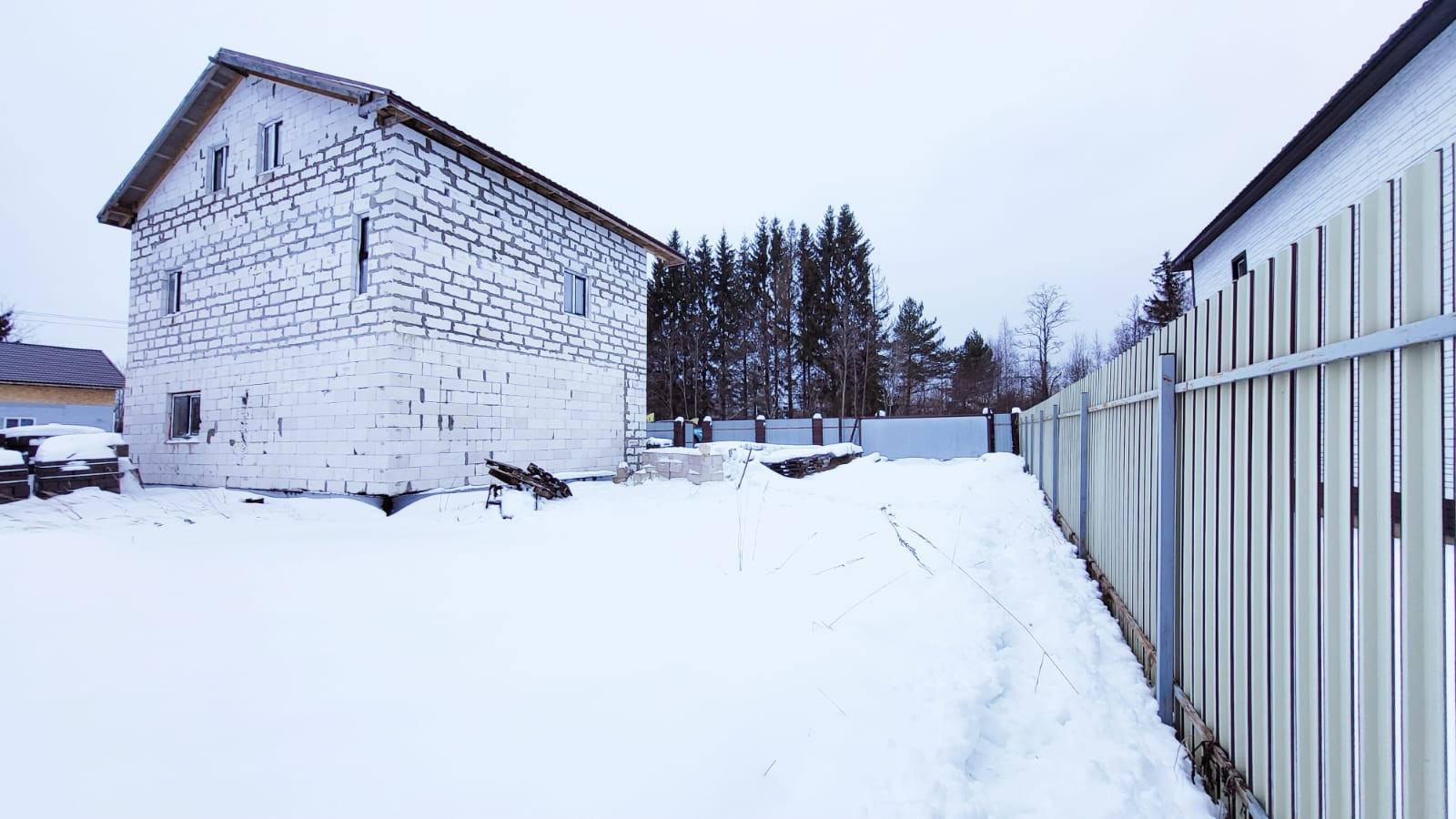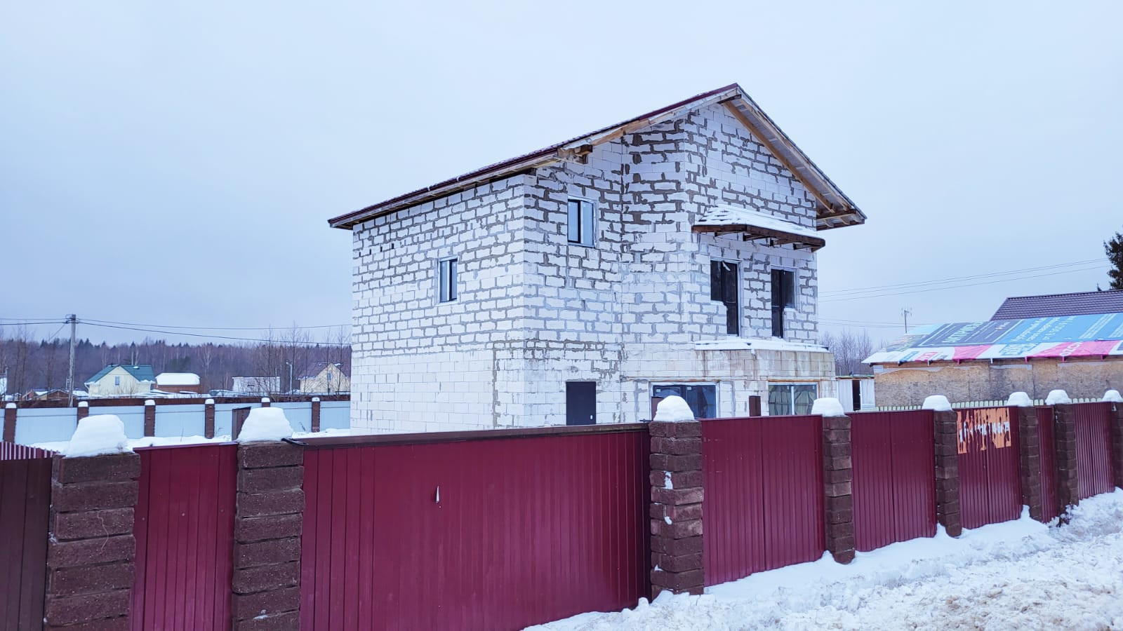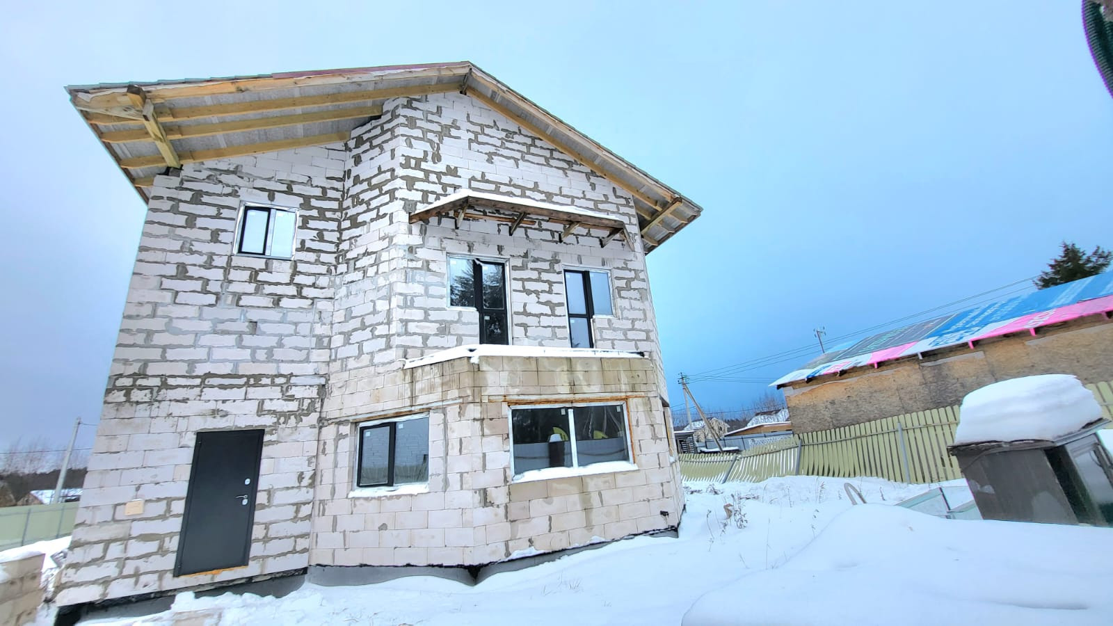 Дом построен в 2022 году из газобетона, толщина стен 40 см. Фундамент -монолитная плита, утеплена снизу пеноплексом. Между 1 и 2 этажами - монолитное ж/б перекрытие, между 2 и 3 этажами - деревянное перекрытие. Установлены двухкамерные стеклопакеты, дверь с терморазрывом. Крыша - металлочерепица. Электричество - 15 кВт заведено в дом.