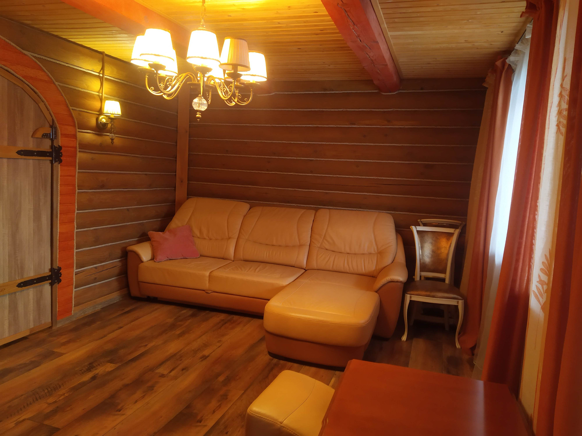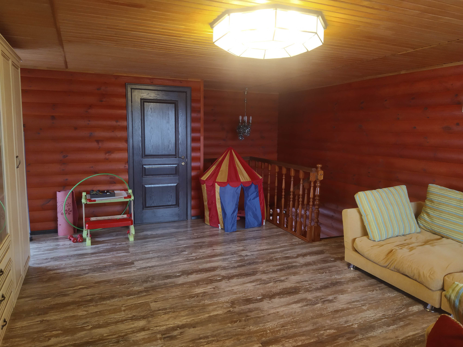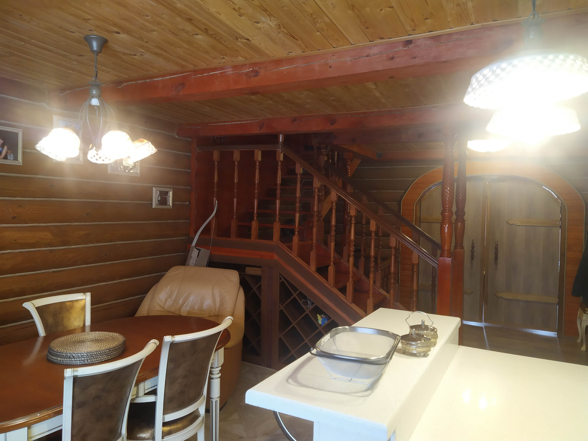 Отдельно стоящая 2х этажная баня (материал постройки - бревно), с парной, небольшим бассейном, душевой, зоной отдыха на первом этаже и полноценной спальной комнатой на втором.