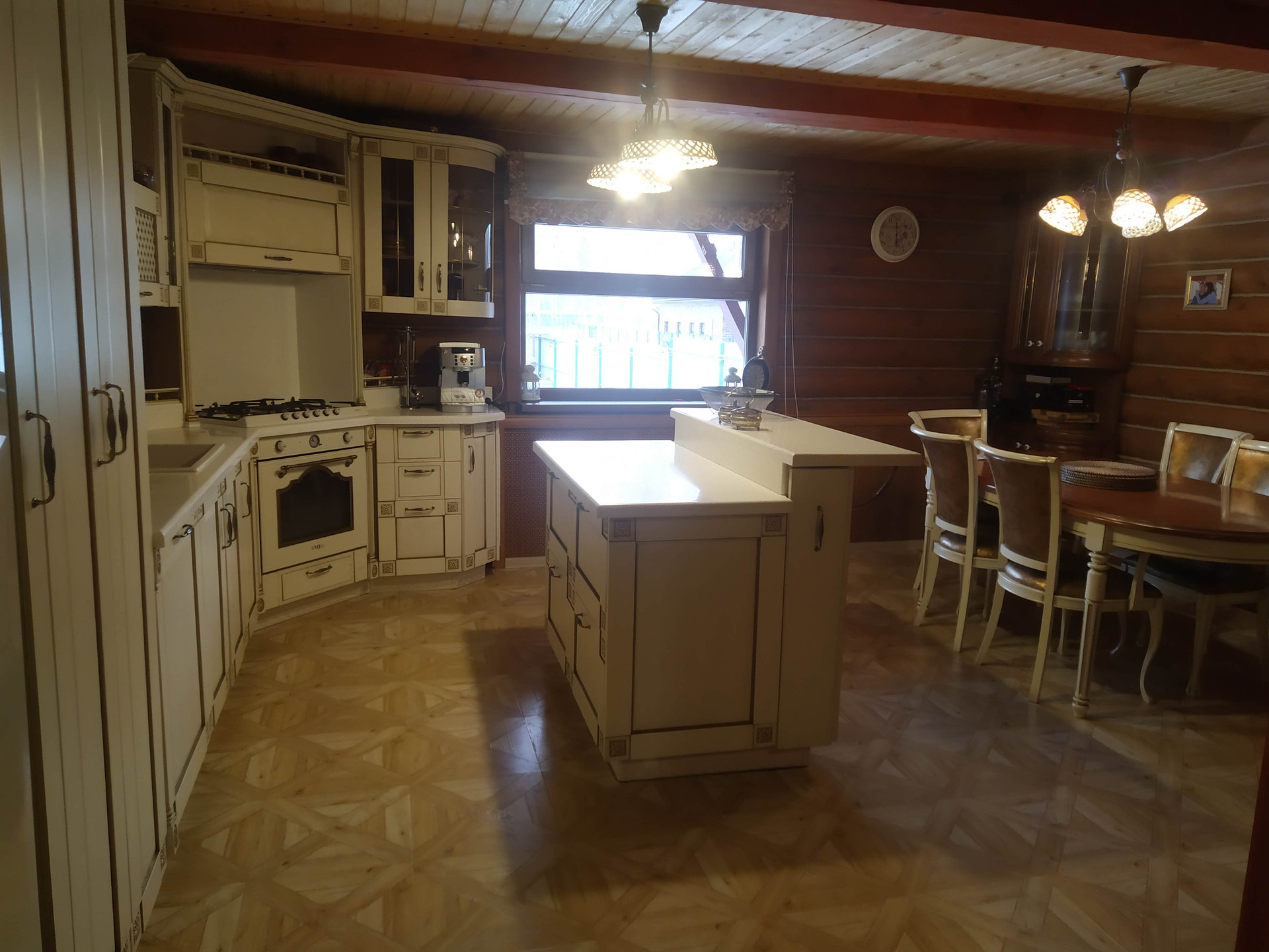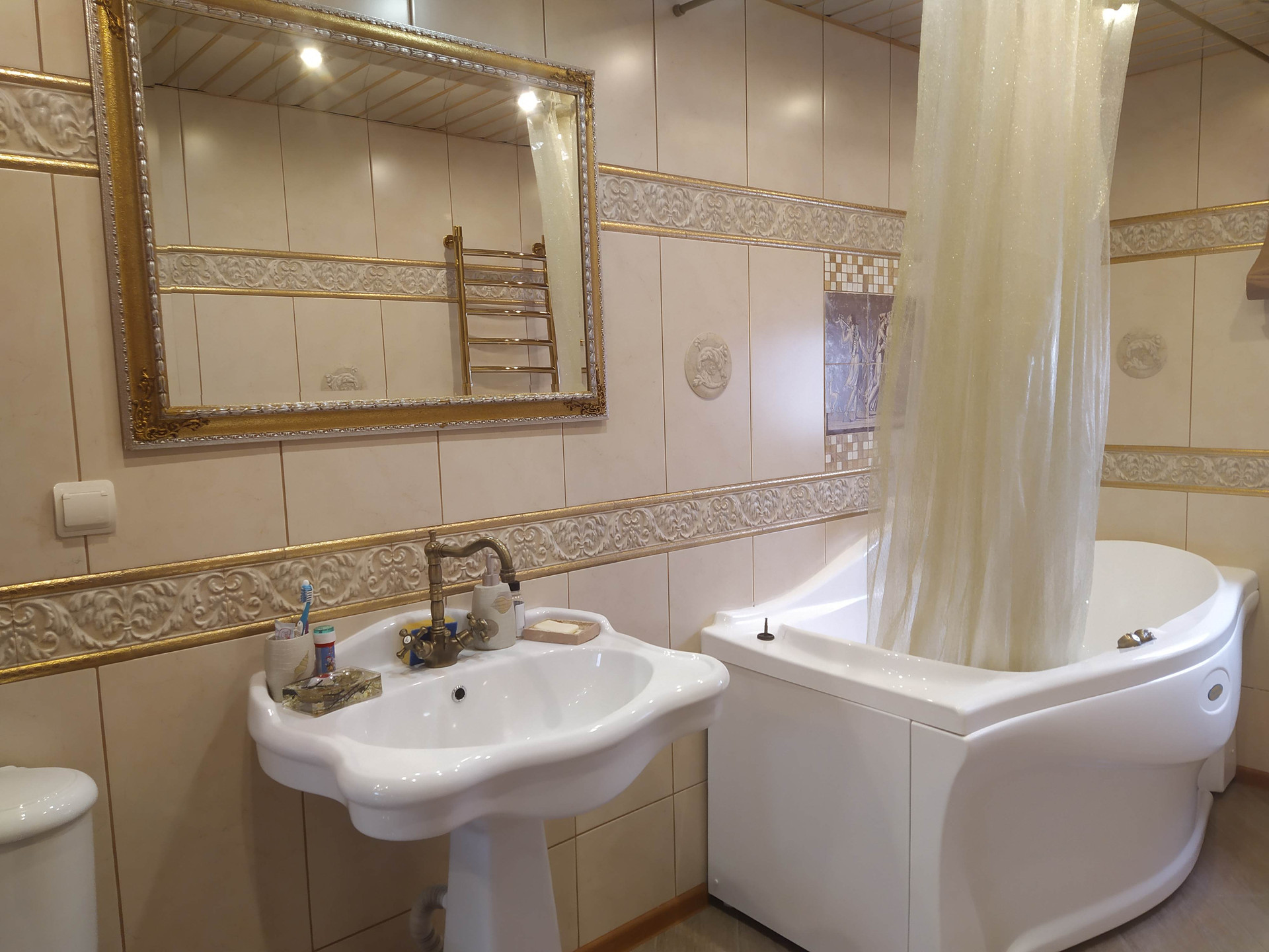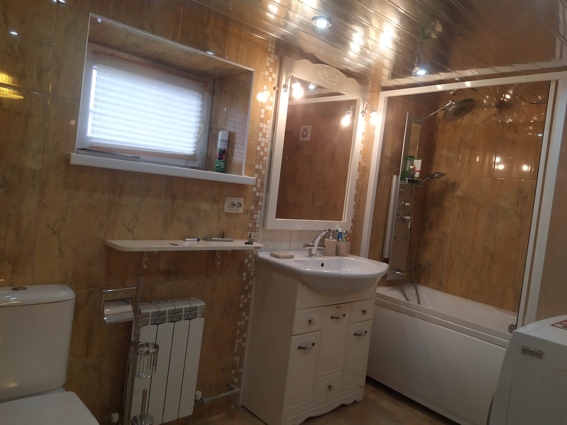 Большой гараж на две машины, ворота - автоматические, внутри отделан кафелем.