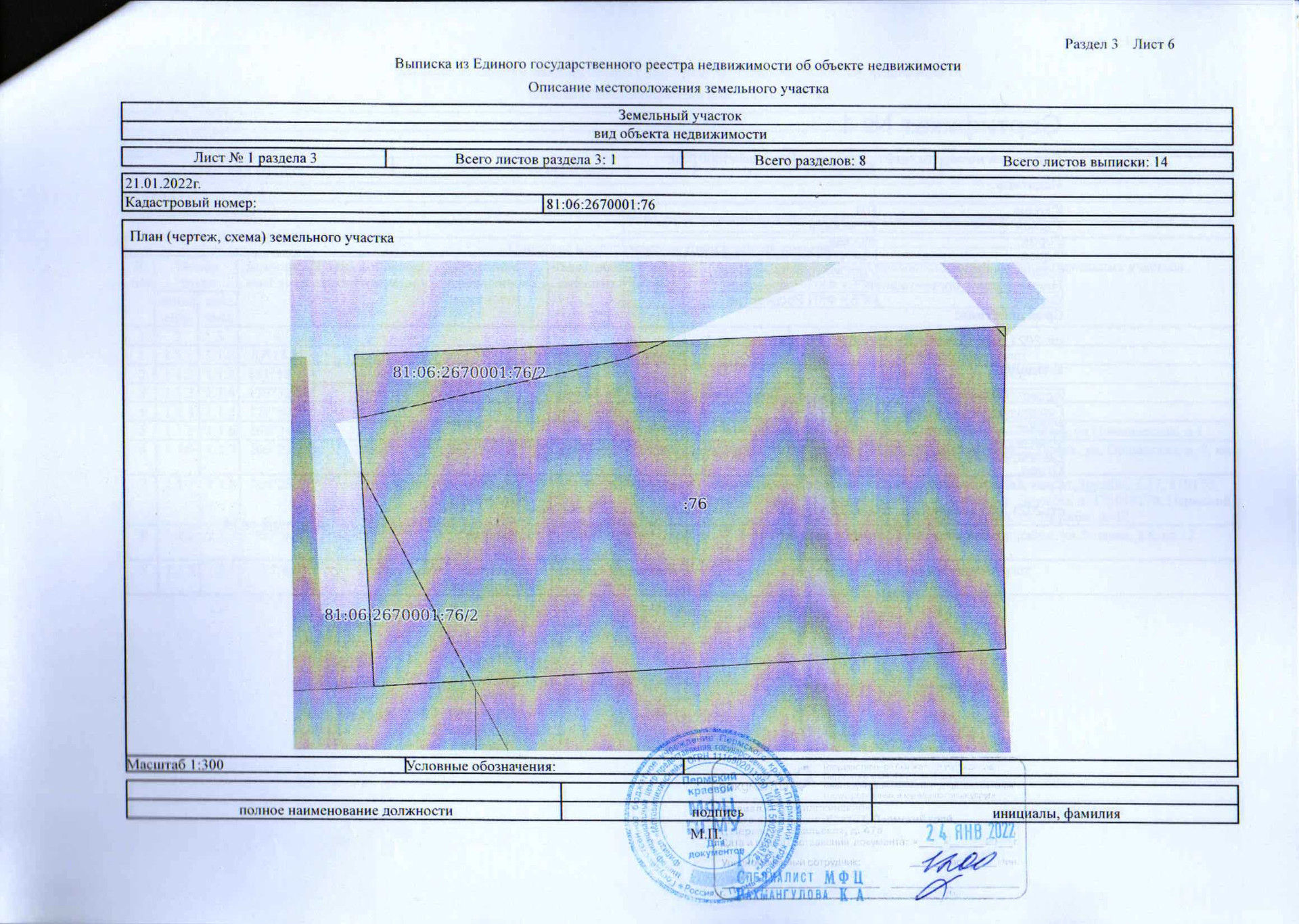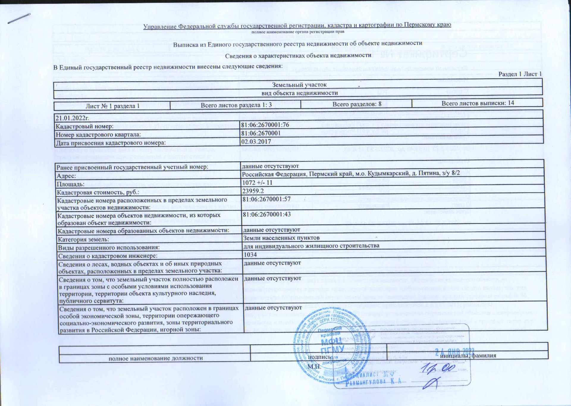 Земельный участок 1072 м2, кадастровый номер 81:06:2670001:76, вид разрешенного использования – для индивидуального жилищного строительства.