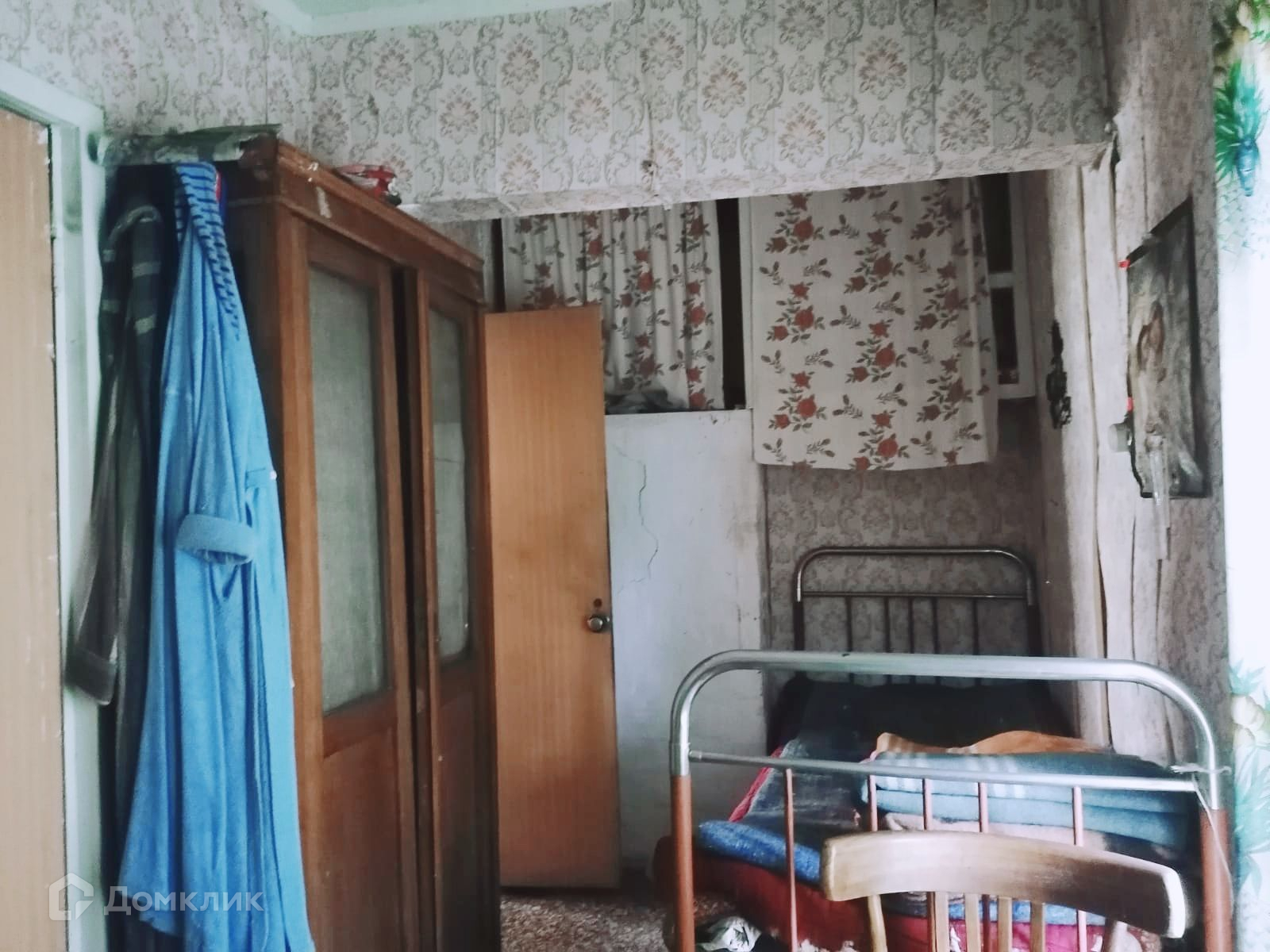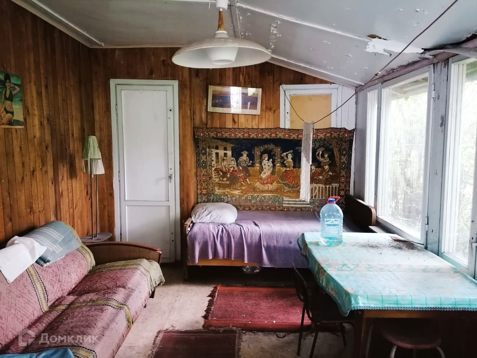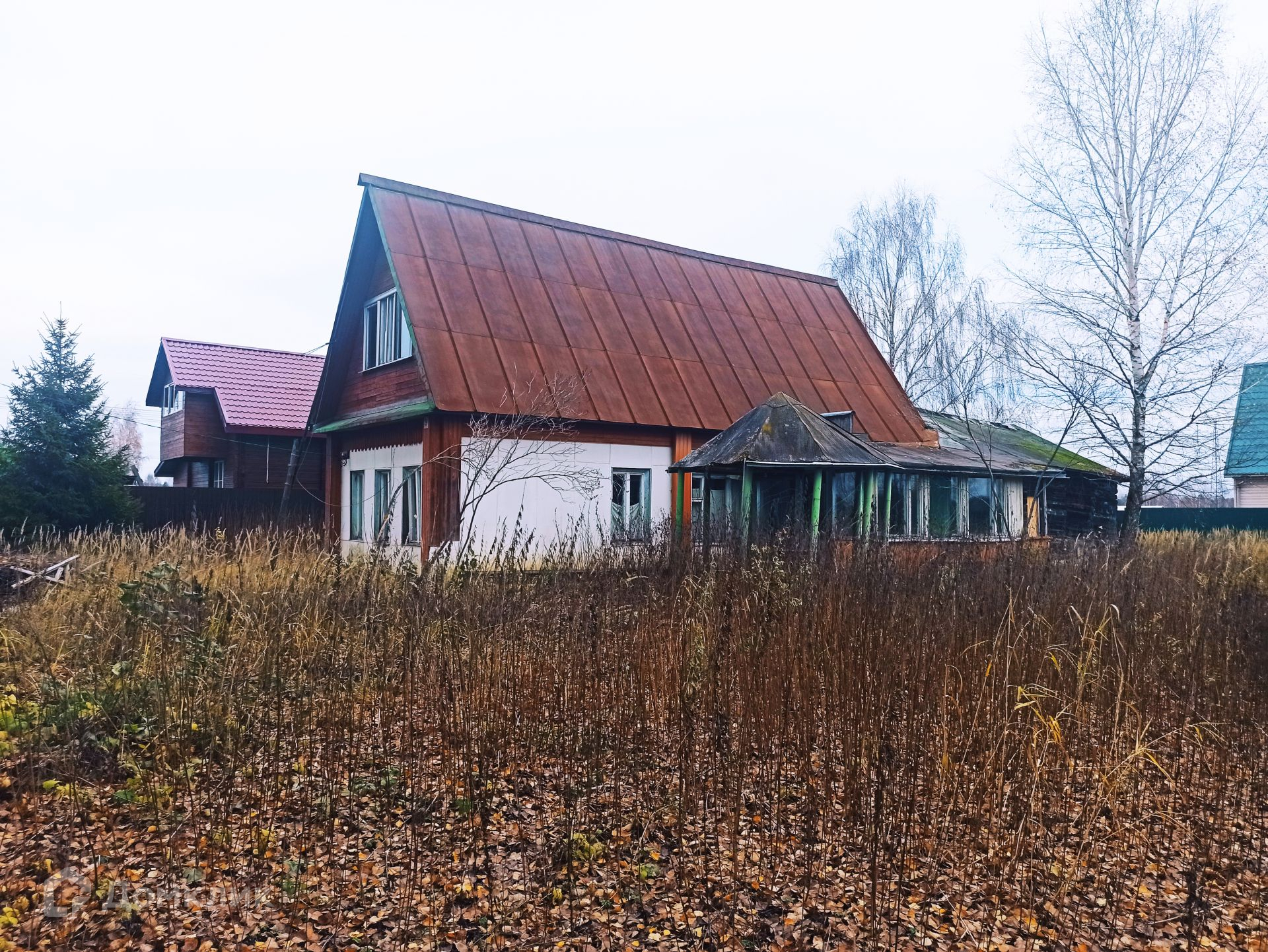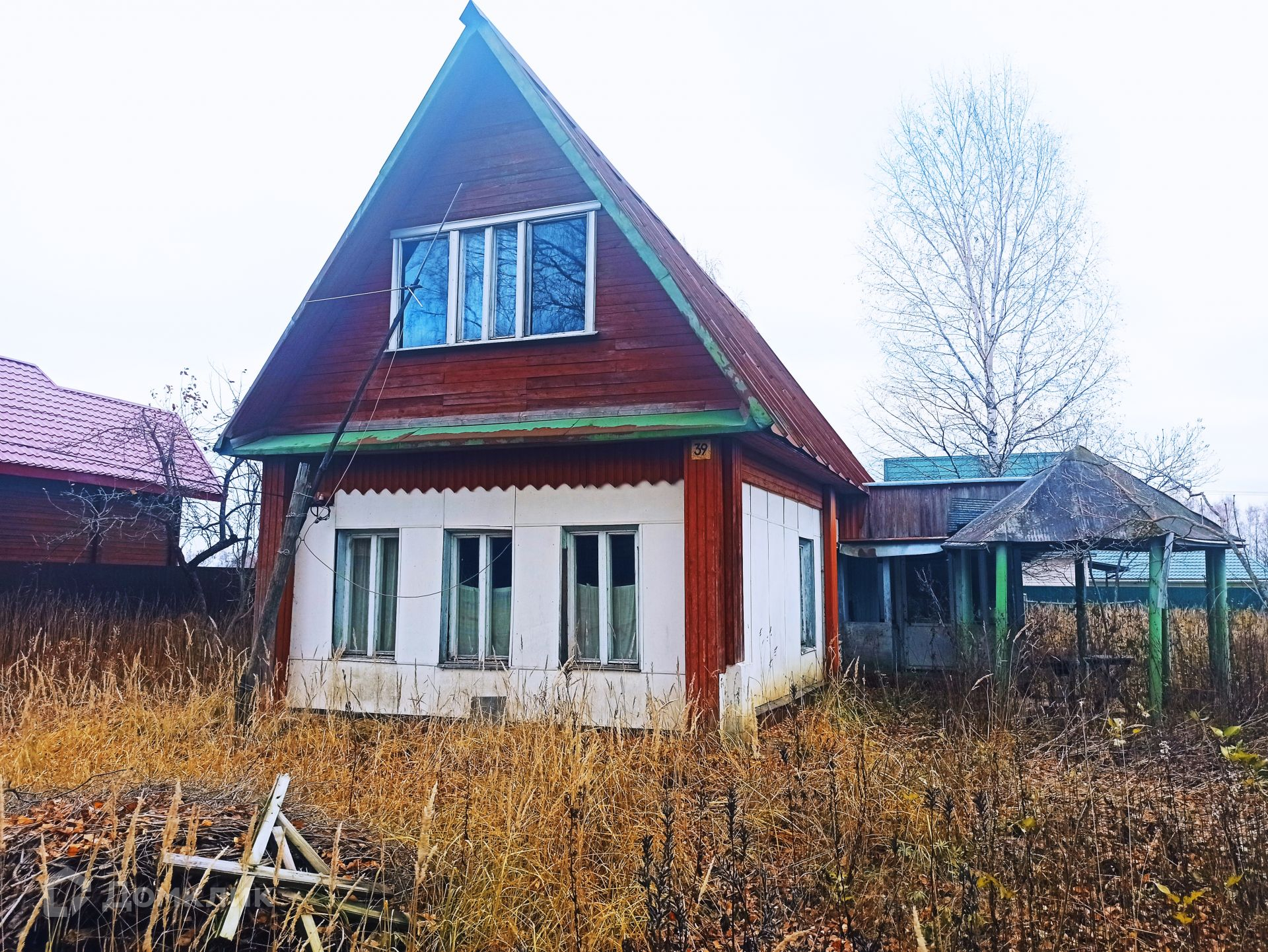 Дом из бревна, пятистенок, пригоден для проживания, в доме большая русская печь с лежанкой, две жилых комнаты, техническое помещение, кухня. К дому пристроена терраса, сзади большой хоз. блок с гаражом и туалетом. Фундамент дома ленточный, от земли до полов 70 см. К дому подведен свет, водопровод из собственной скважины, по границе участка газ.  В собственности более 30 лет.
