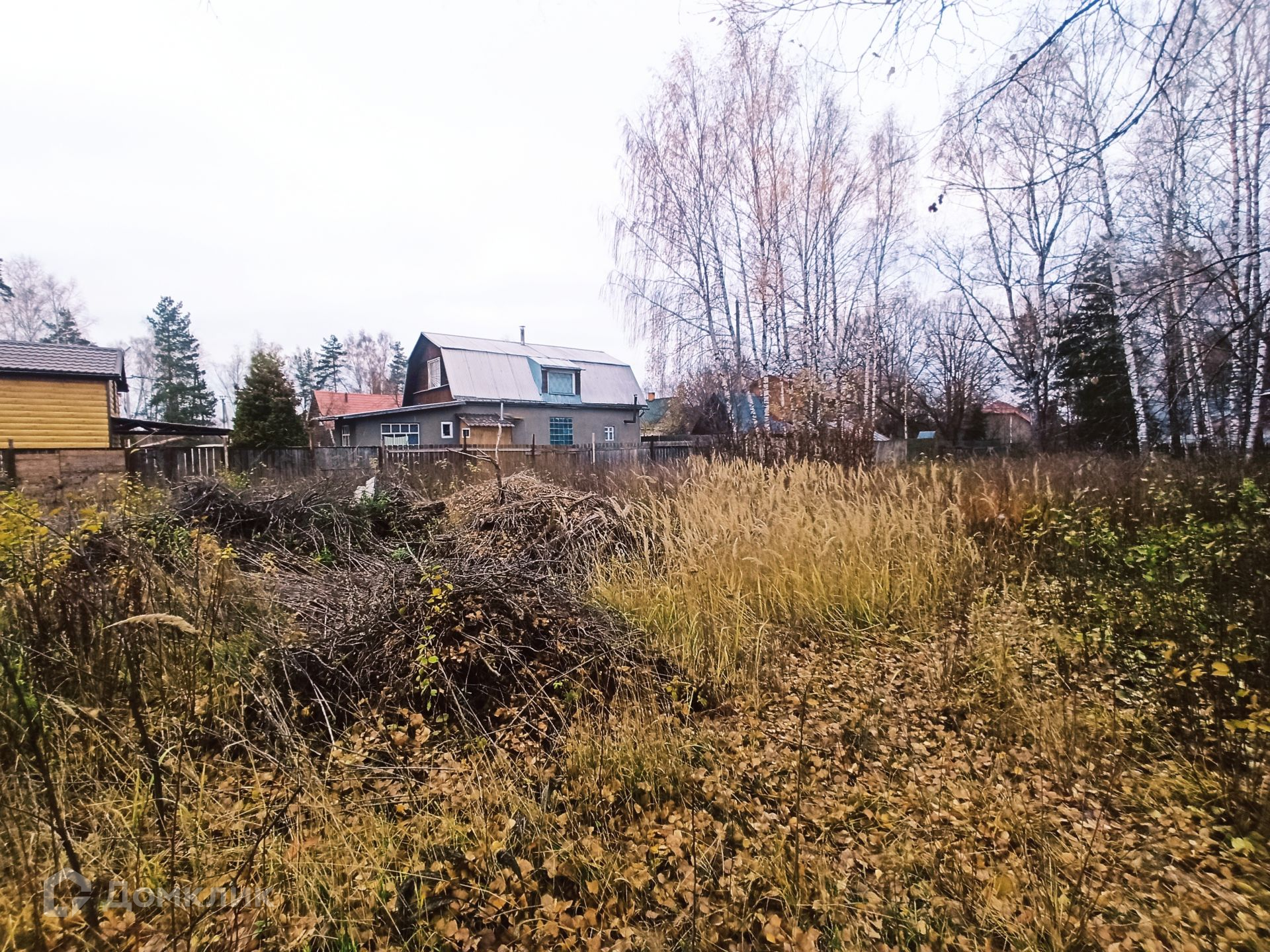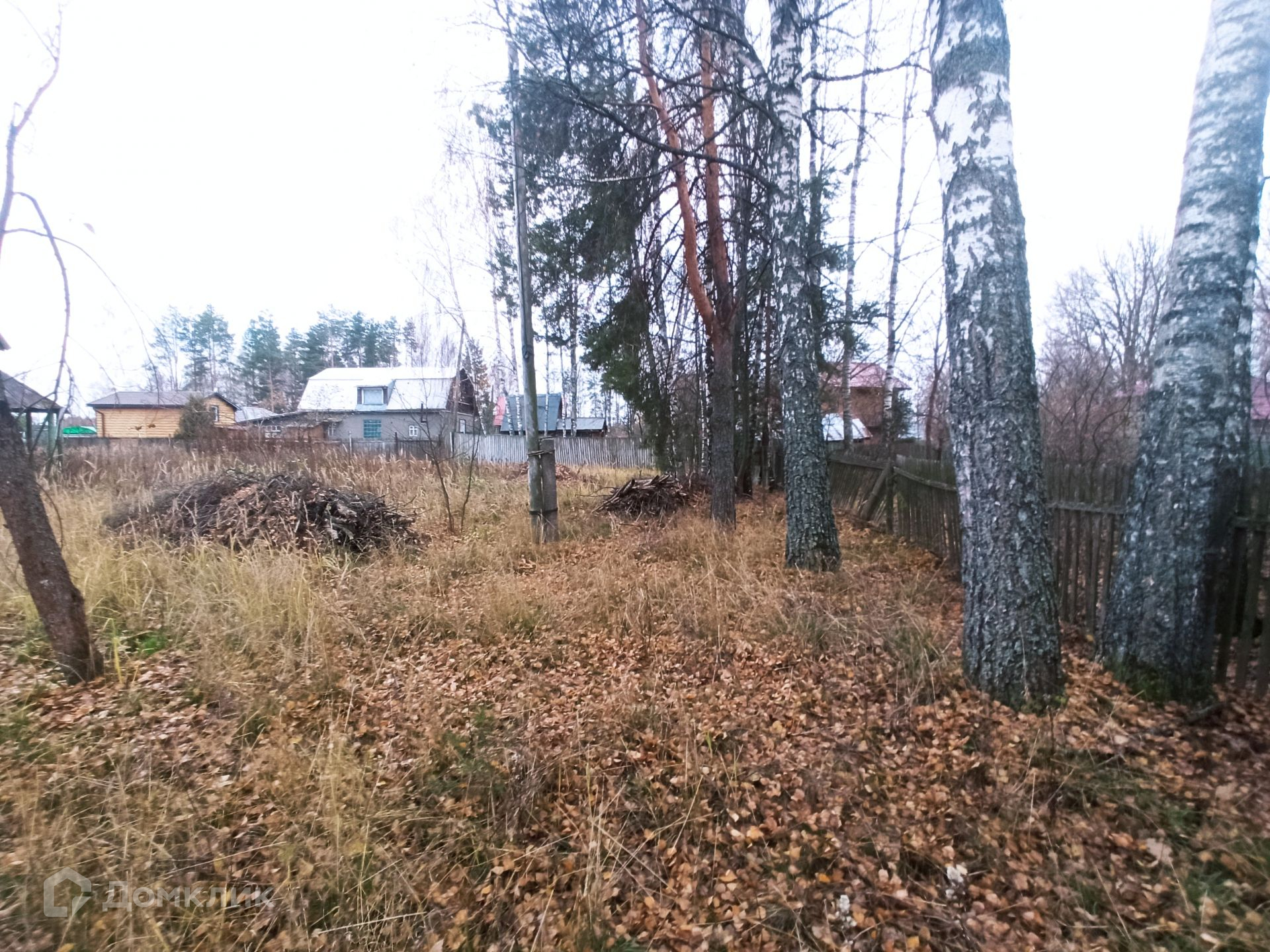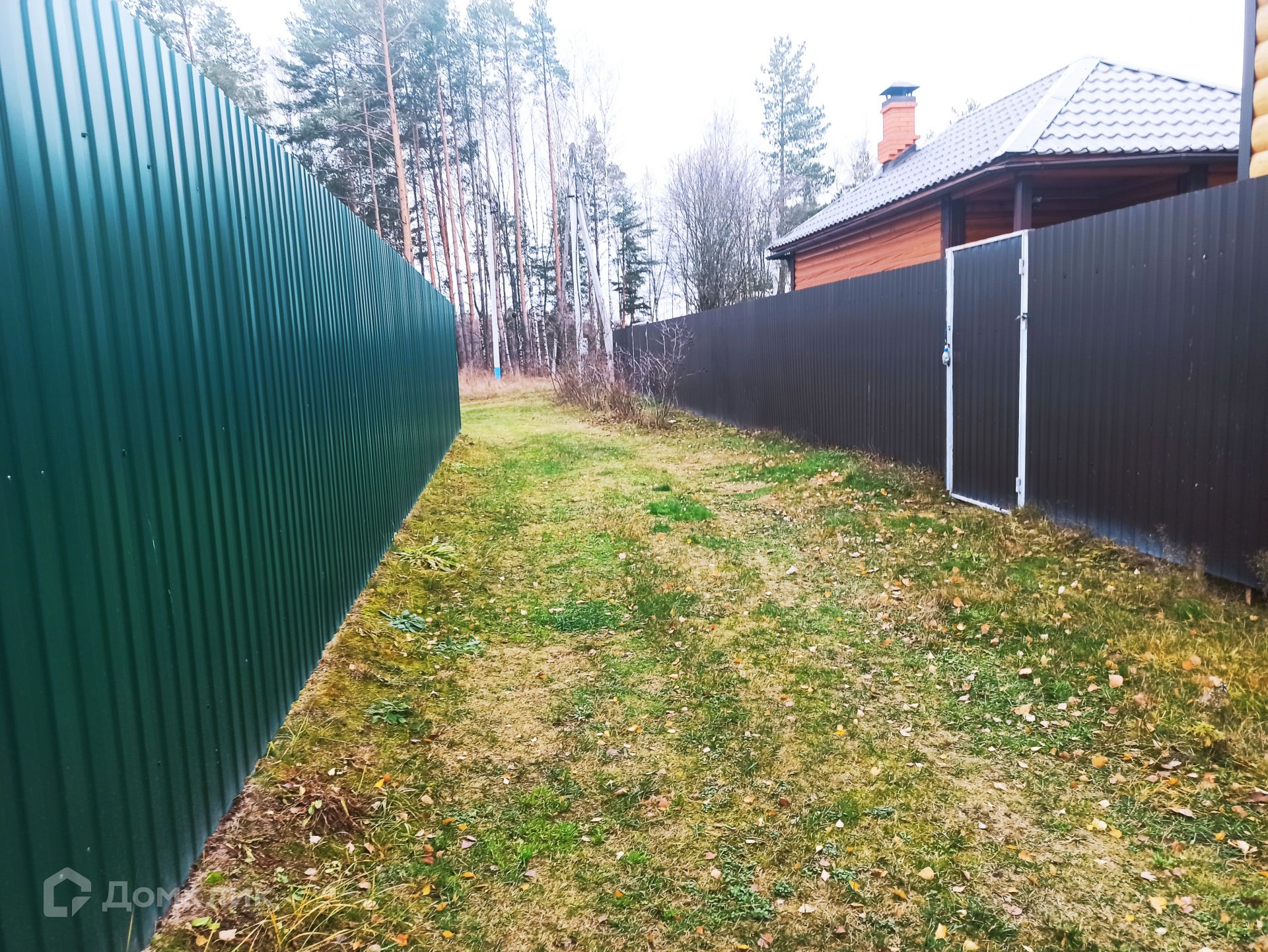 Участок правильной формы огорожен забором, на участке много деревьев и кустарников, расположен в глубине от дороги. Дорога до участка асфальтирована.
