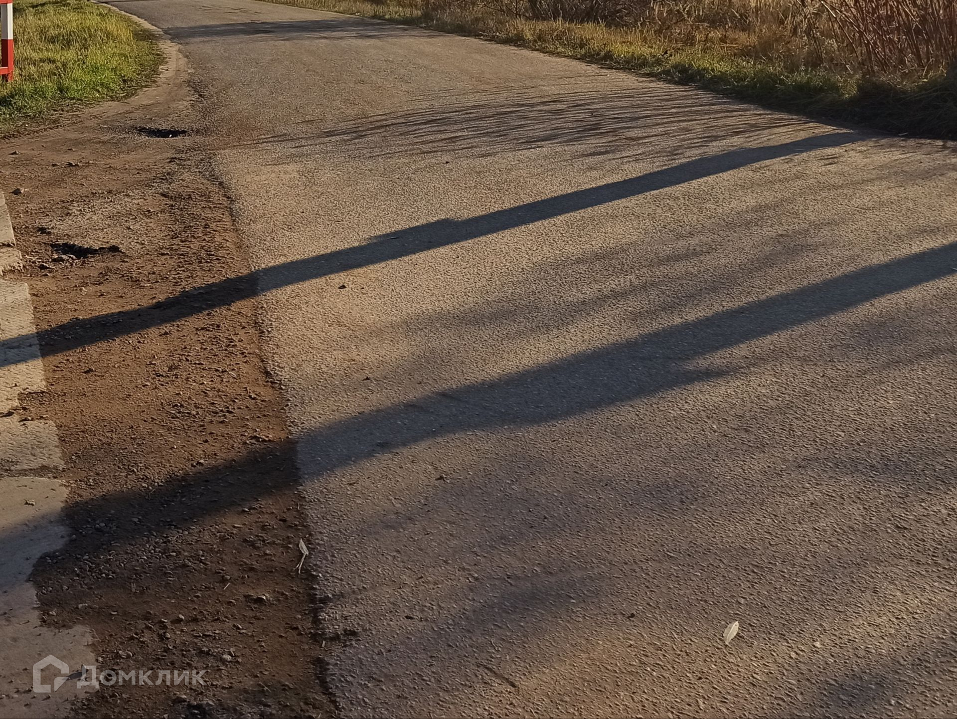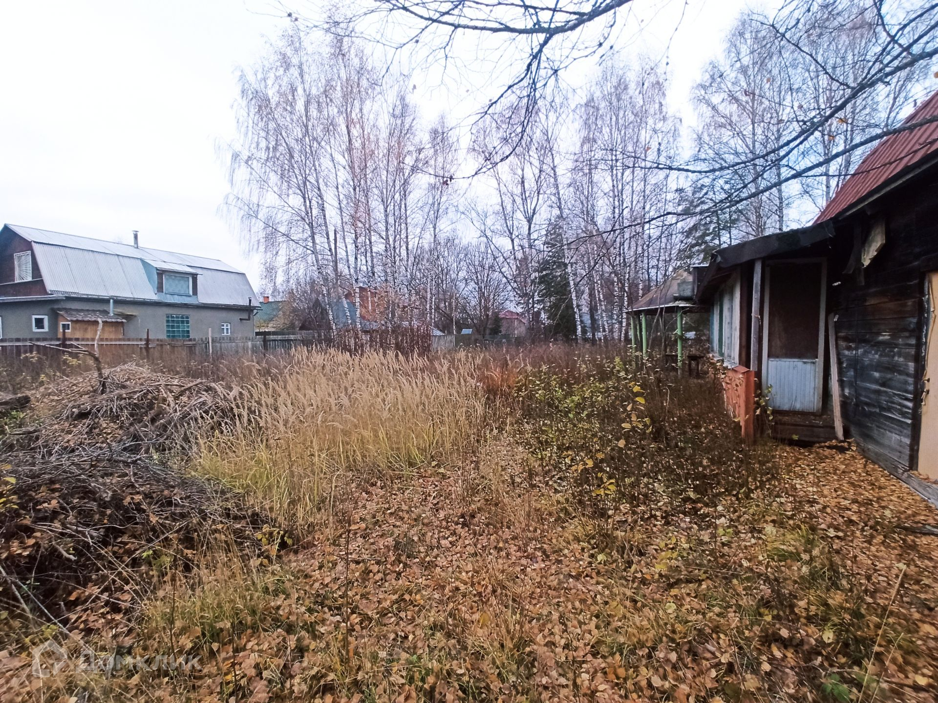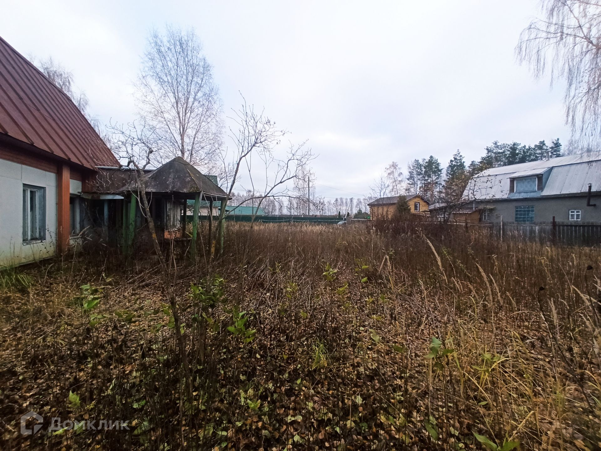 Участок правильной формы огорожен забором, на участке много деревьев и кустарников, расположен в глубине от дороги. Дорога до участка асфальтирована.