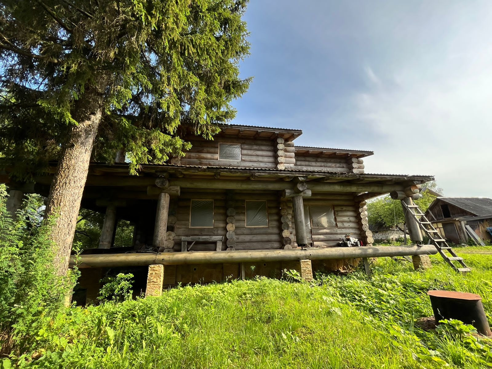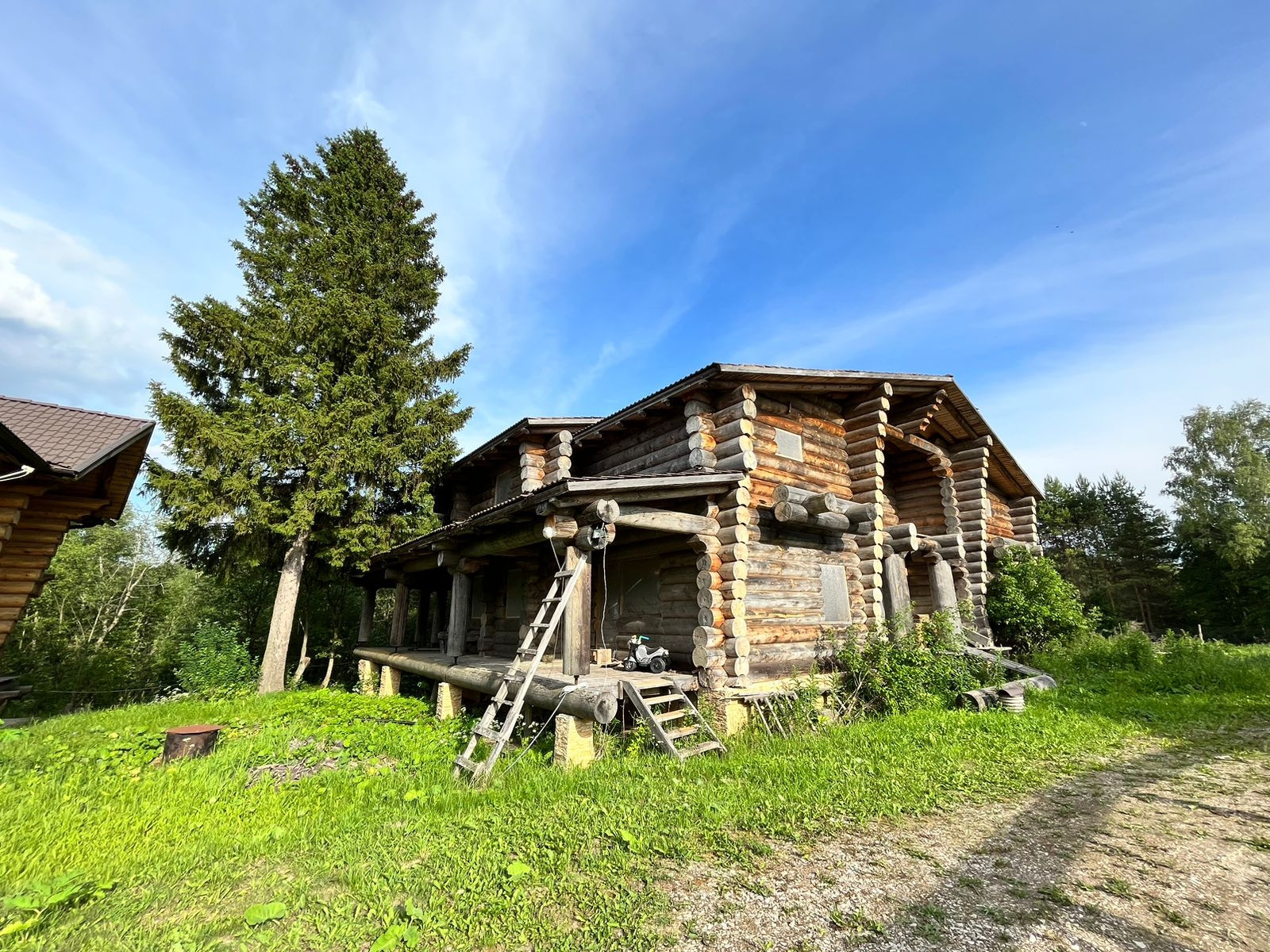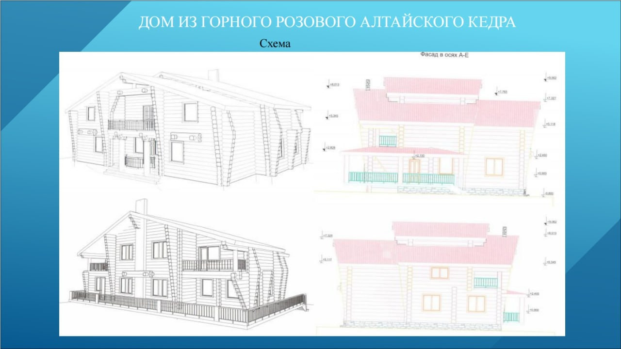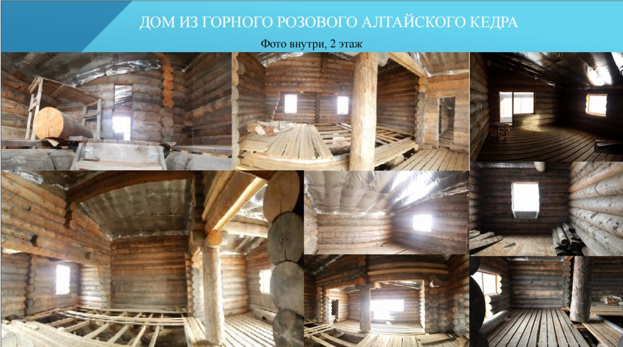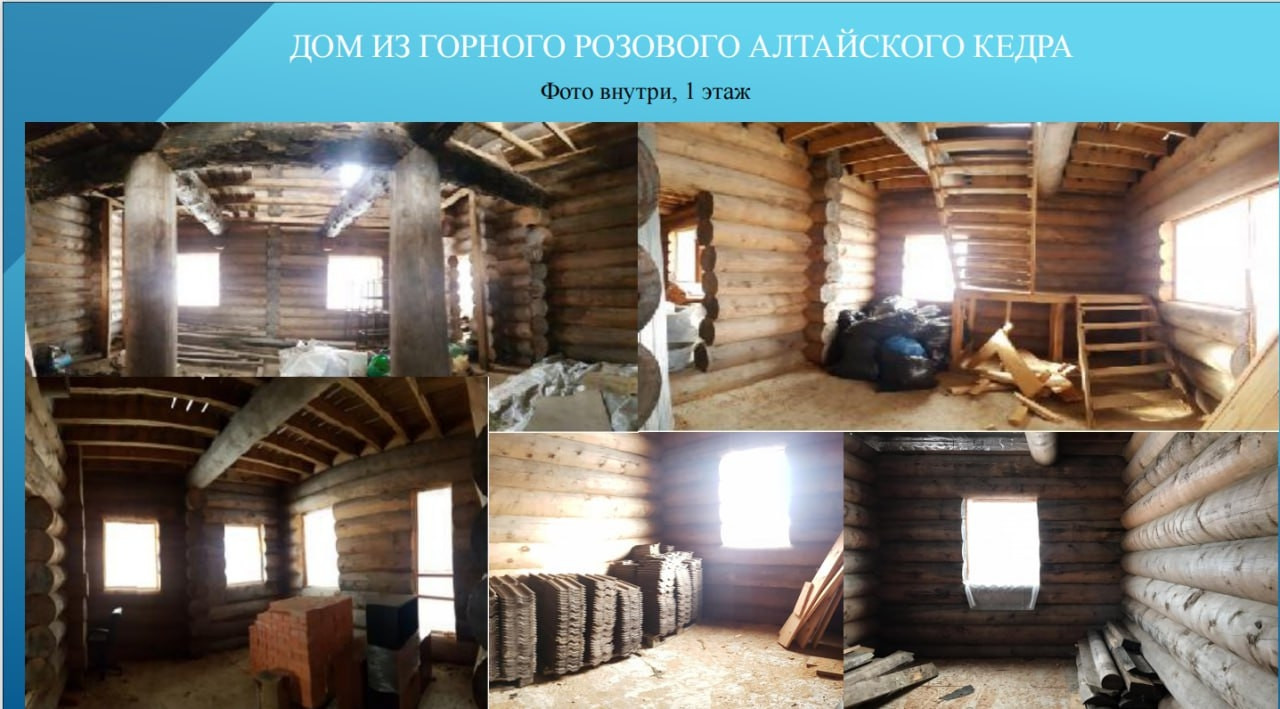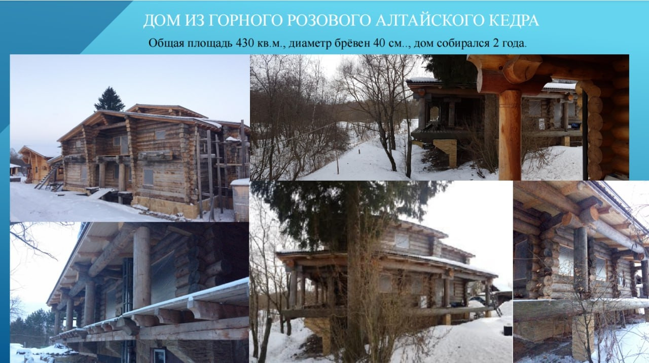При постройке сруба использовалось  оцилиндрованное кедровое бревно диаметром 40 см в общем объеме 450 кбм, такой диаметр кедра достигает  к возрасту около 200 лет. Бревна сруба содержались в собранном виде под черепичной крышей, полностью высушено, что исключает его последующее деформирование при переносе и монтаже дома на новом месте. Готовый сруб из розового кедра общей площадью 450 кв.м. (500 куб.м.) покрыт черепицей (стоимость кровельного покрытия 3 млн.руб.), произведенной в Белоруссии по немецкой технологии "брасс"- технология сборки гарантирует  сохранность черепицы при ее демонтаже и транспортировке.