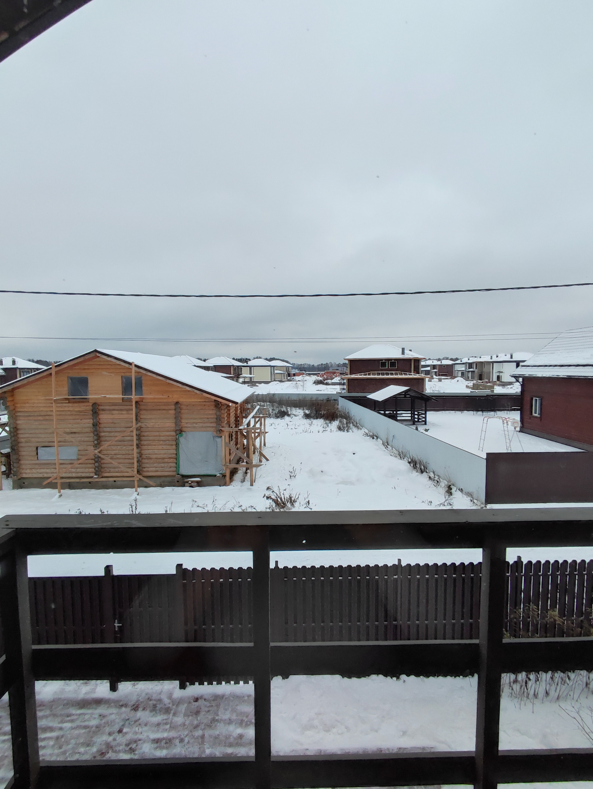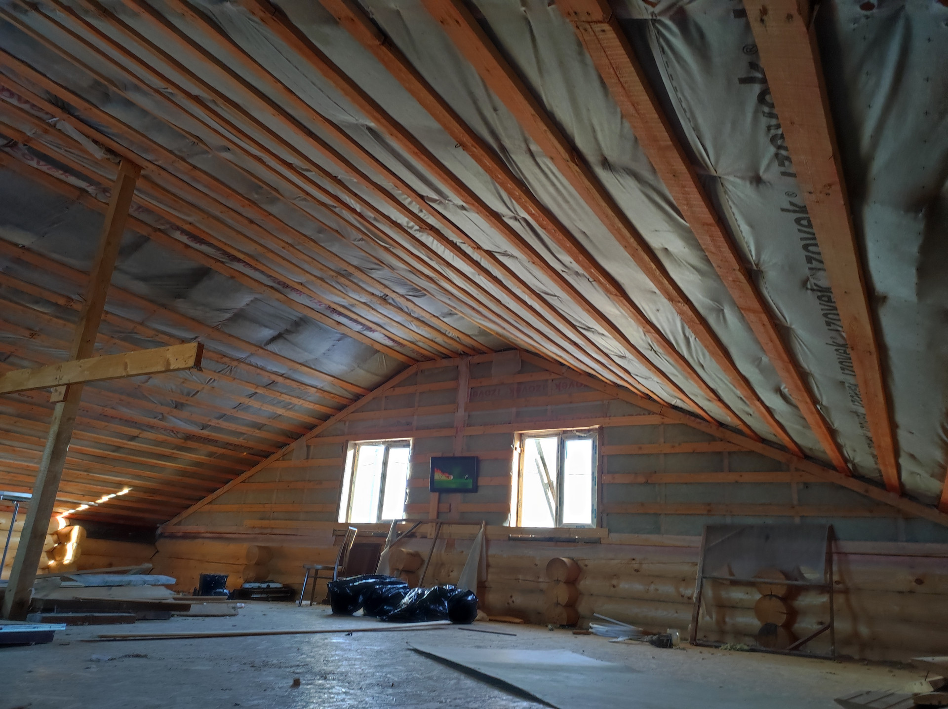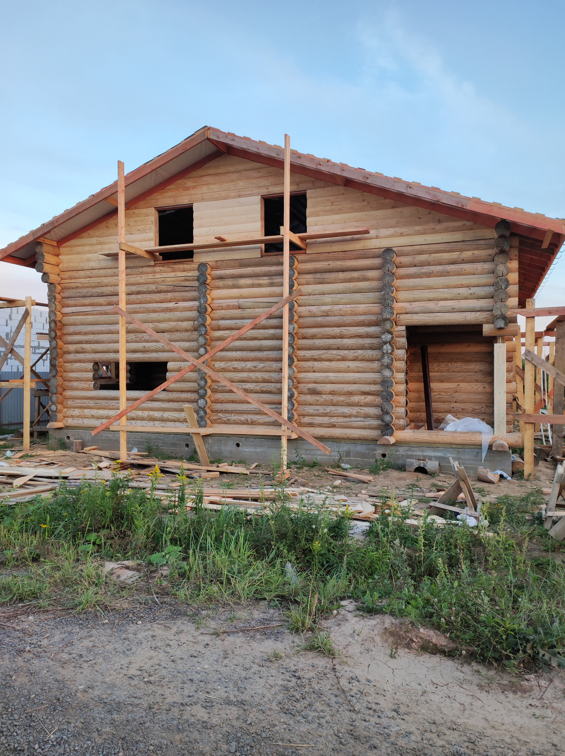Проект выполнен из оцилиндрованного бревна, 2 этаж - мансардный. На крыше установлены снегозадержатели. Дом свободной планировки.