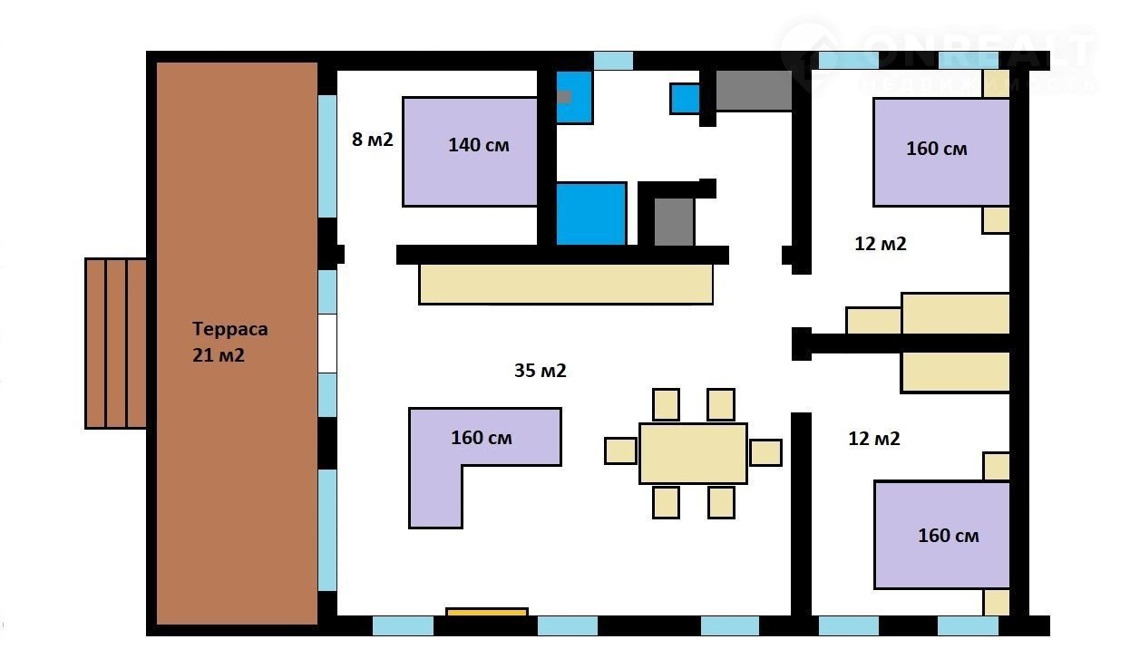 Спальные места: две кровати 160 см, диван-кровать 140 см, диван-кровать 160 см