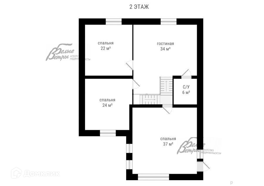 2-ой этаж: гостиная 34 кв.м, спальня 22 кв.м, спальня 24 кв.м, санузел с душем 6 кв.м, спальня 37 кв.м.