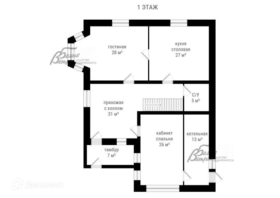 1-ый этаж: тамбур 7 кв.м, прихожая с холлом 31 кв.м, гостиная с камином 28 кв.м, кухня-столовая 27 кв.м, спальня-кабинет 26 кв.м, санузел с ванной 5 кв.м, котельная 12.6 кв.м.