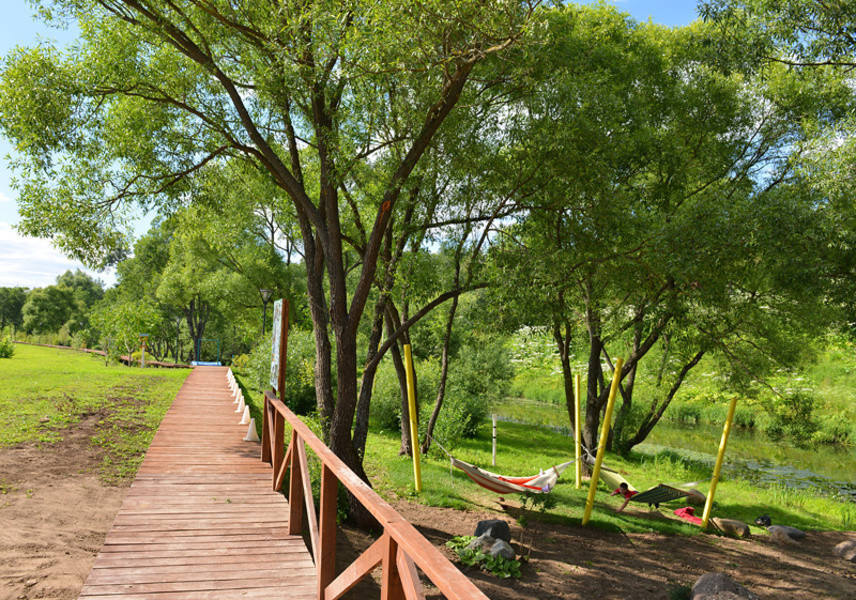 Территория жилого комплекса огорожена и находится под охраной. На территории имеются прогулочные зоны, спортивные площадки, беседки и собственная набережная вдоль реки Пахра. Очень красивое и спокойное место.