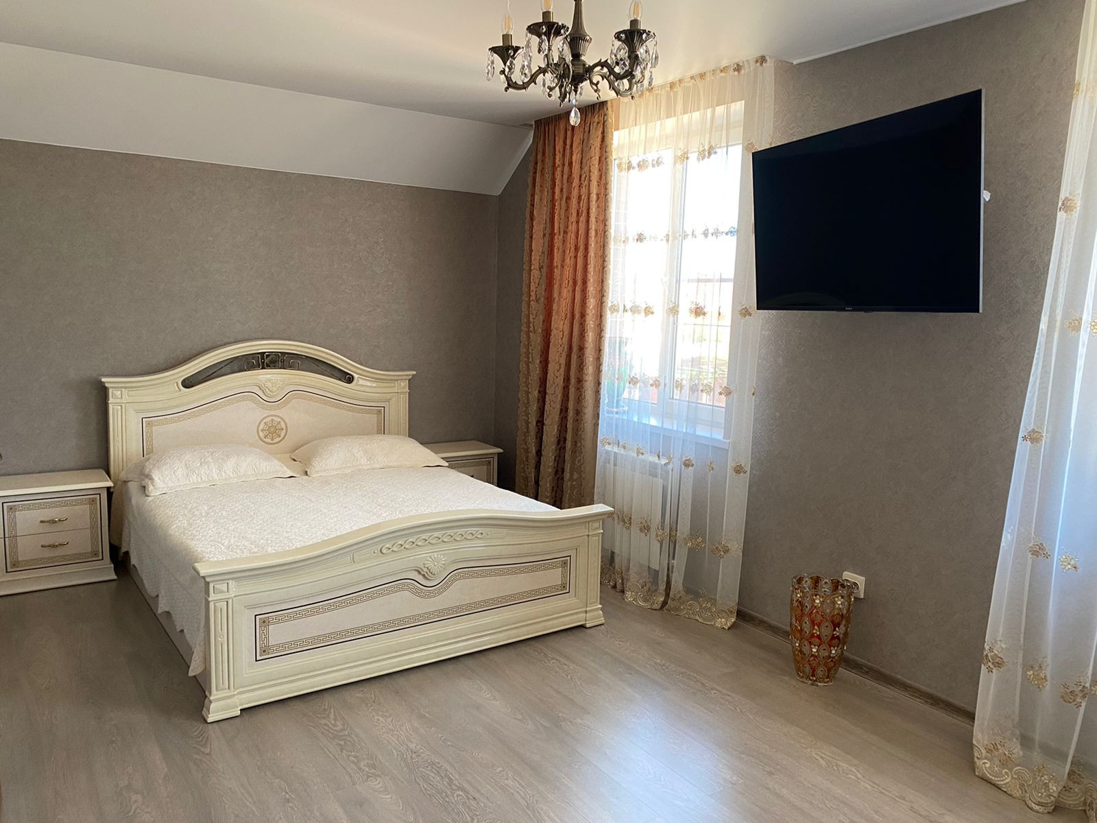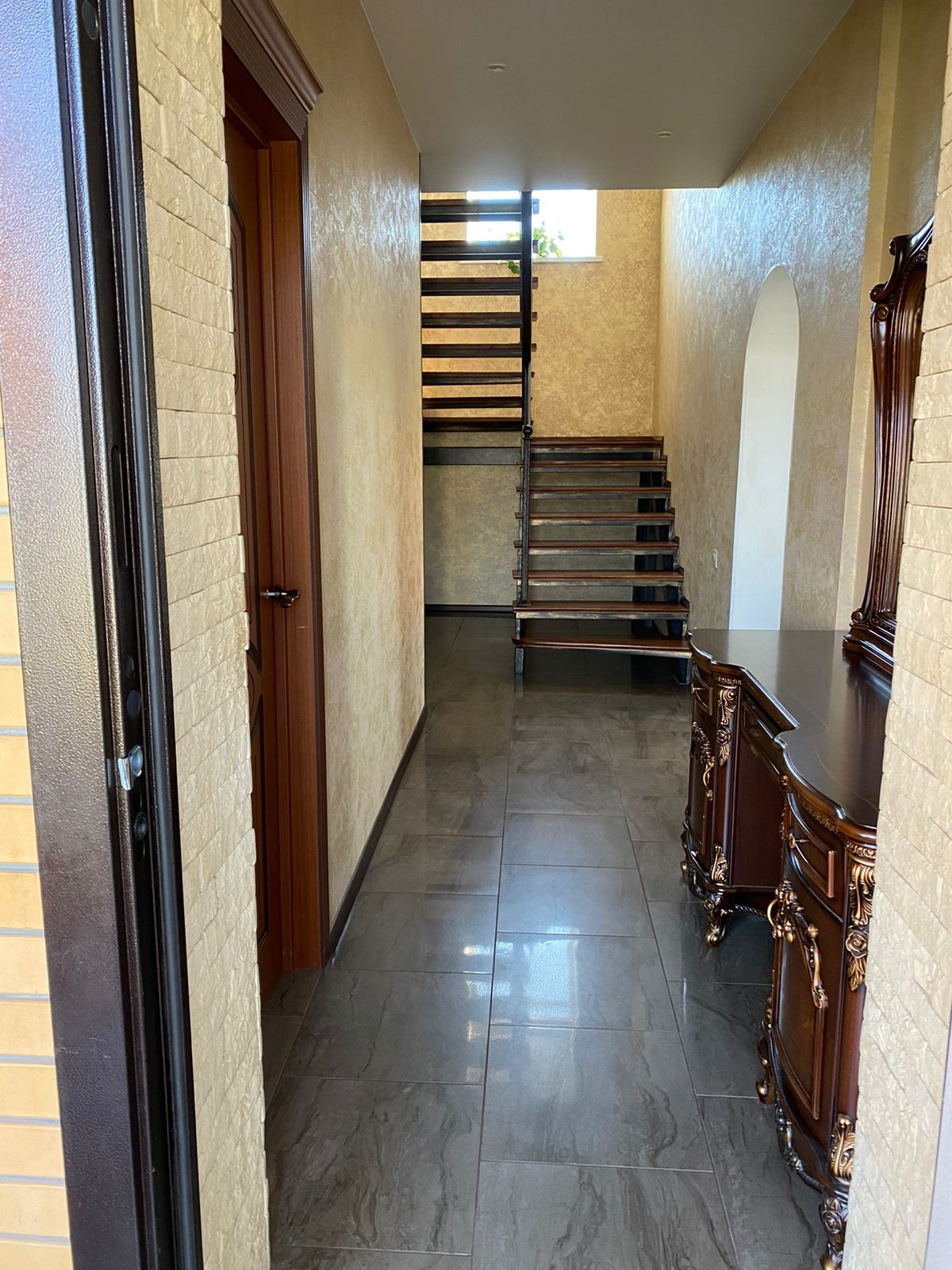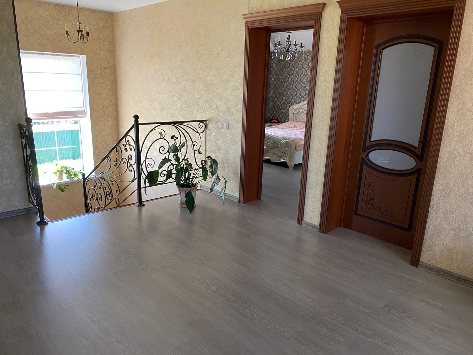 На первом этаже расположены: просторная кухня-столовая, гостевая спальня, санузел, бойлерная, гардеробная. Высота потолков 2м70см.
