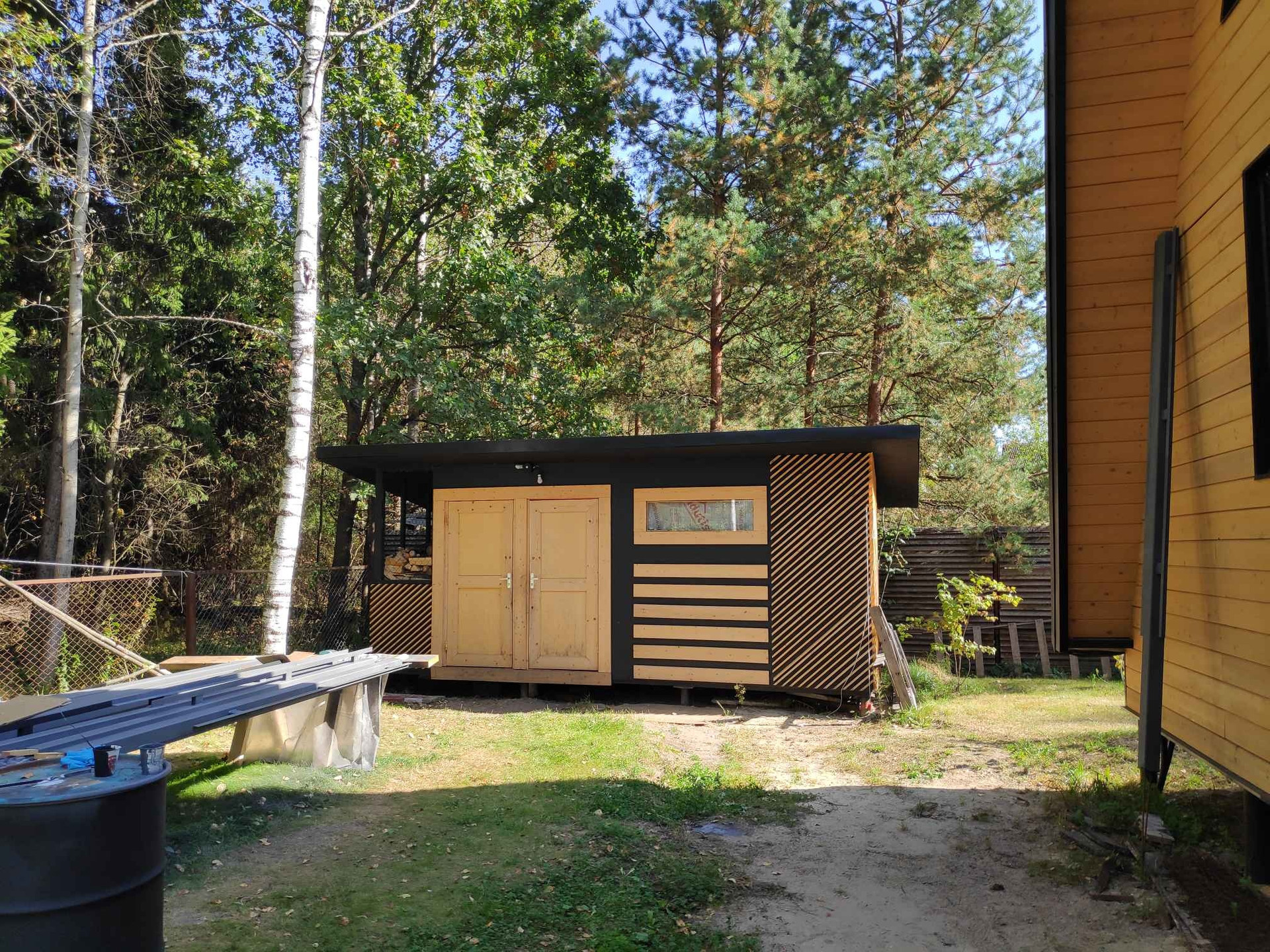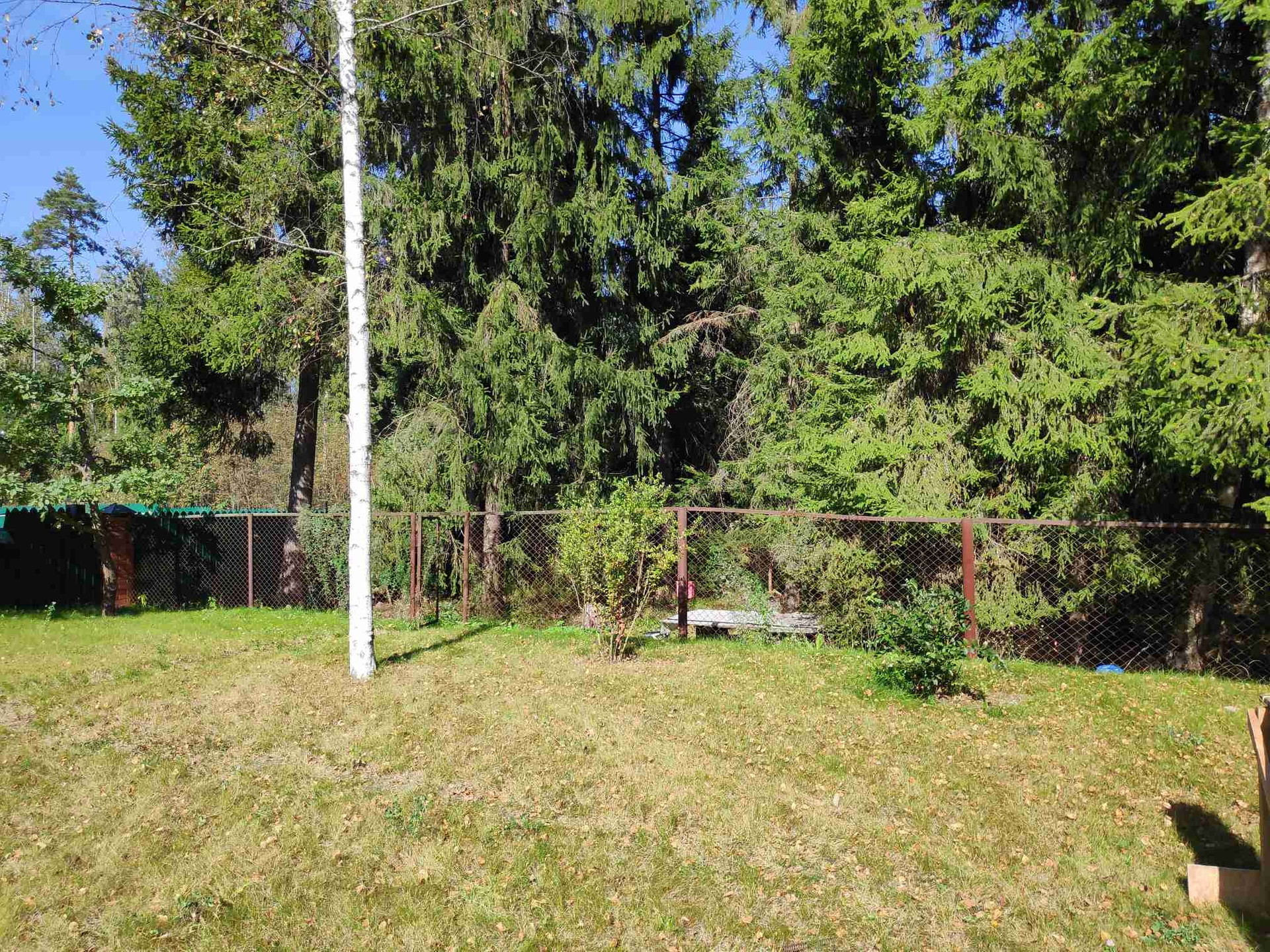 На участке хоз блок + дровница. В одной части участка посажены плодовые деревья и кусты. Свой выход в лес, забор рабица. По бокам отличные соседи. С лицевой части подъездная дорога за которой тоже лес. Забор установить не успели из-за появившейся необходимости продать. Столбы куплены и загрунтованы.