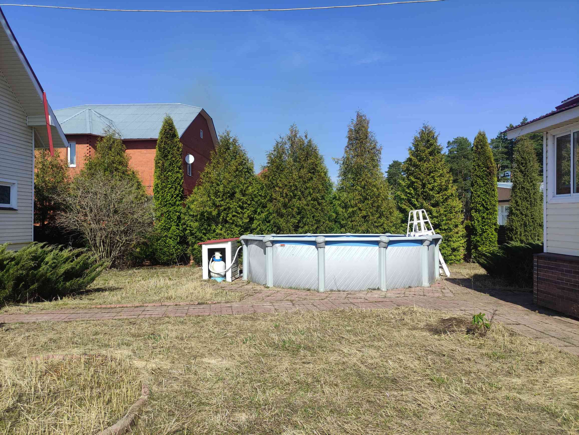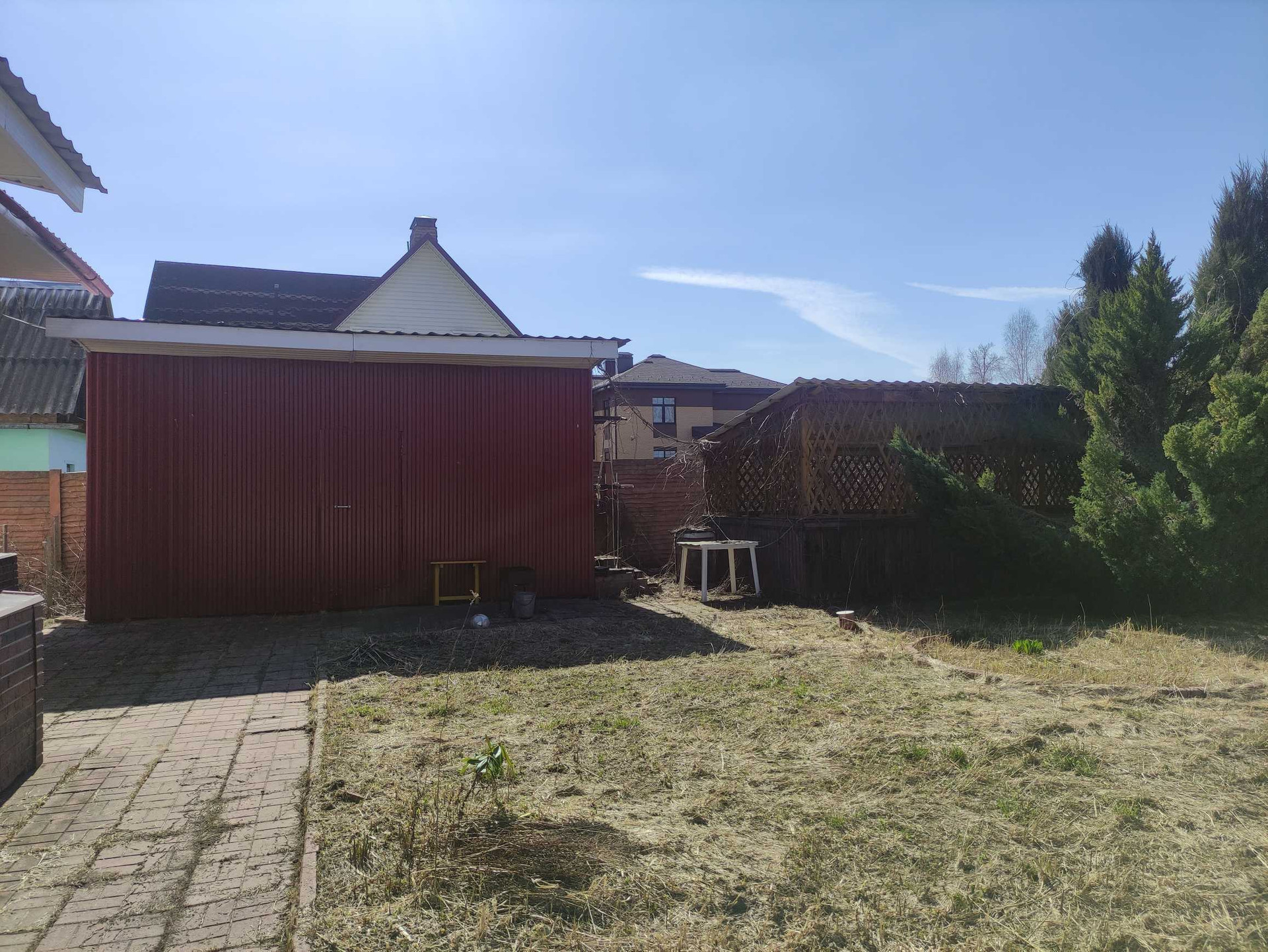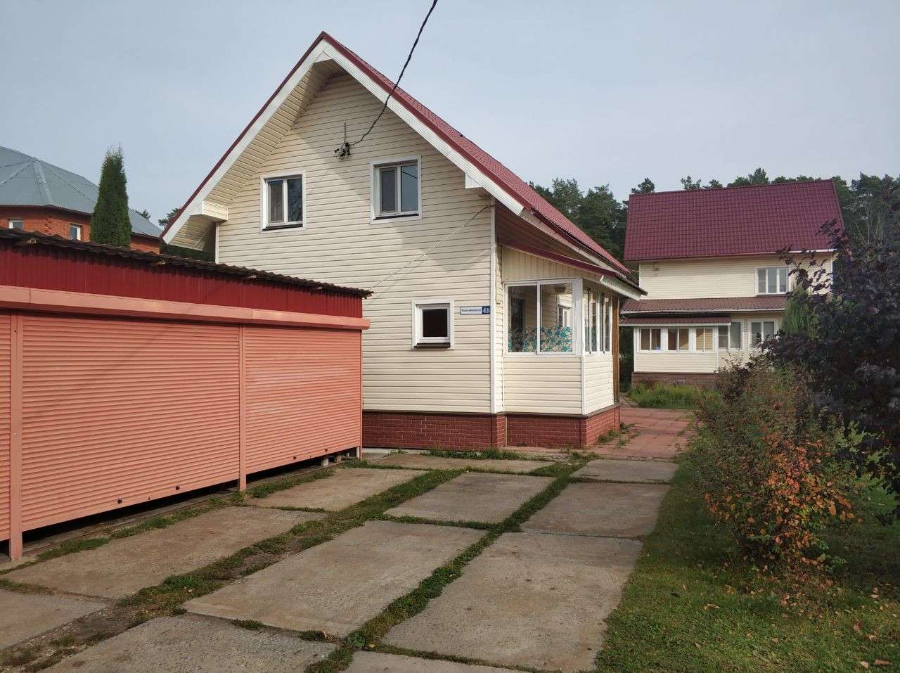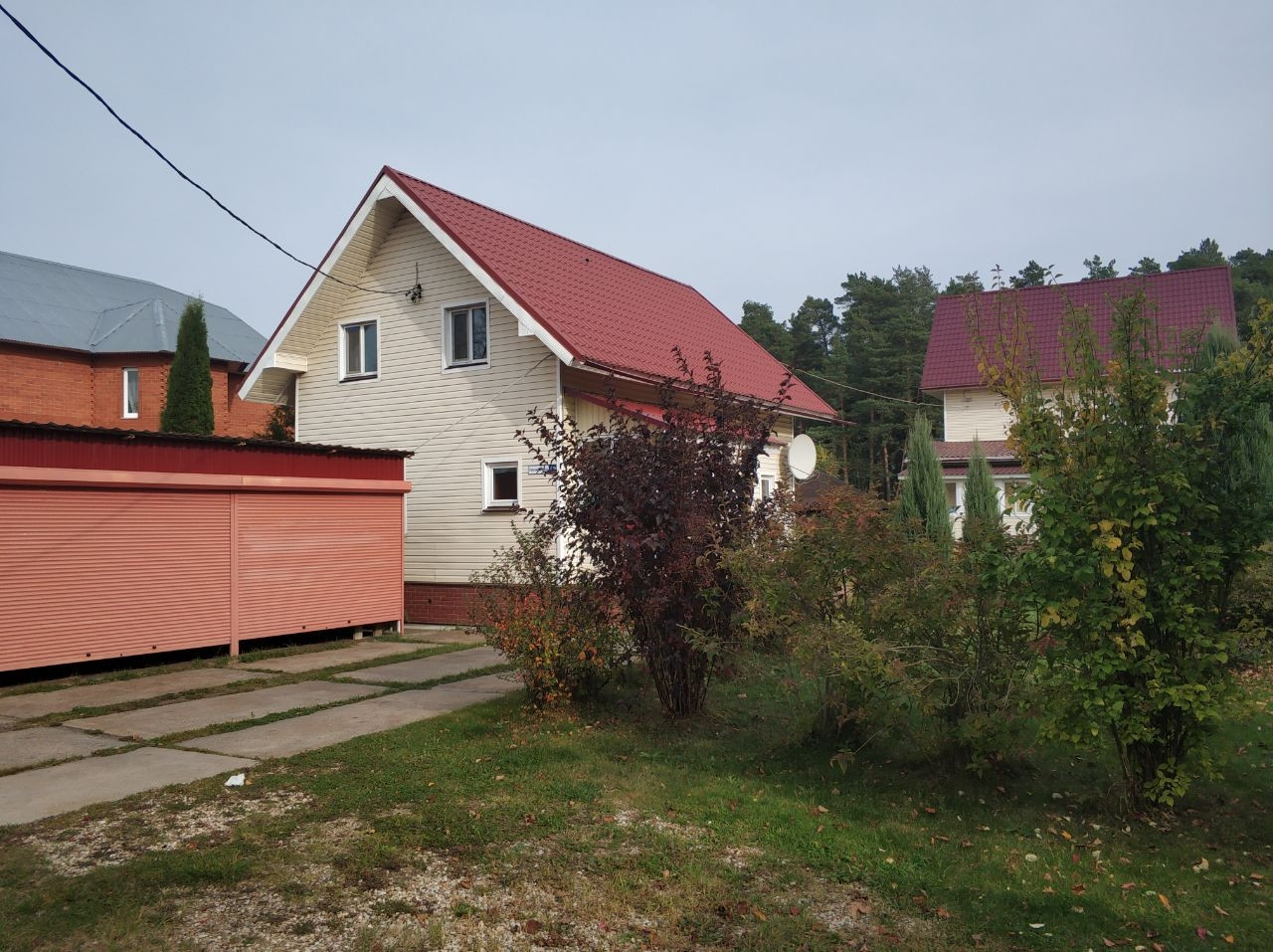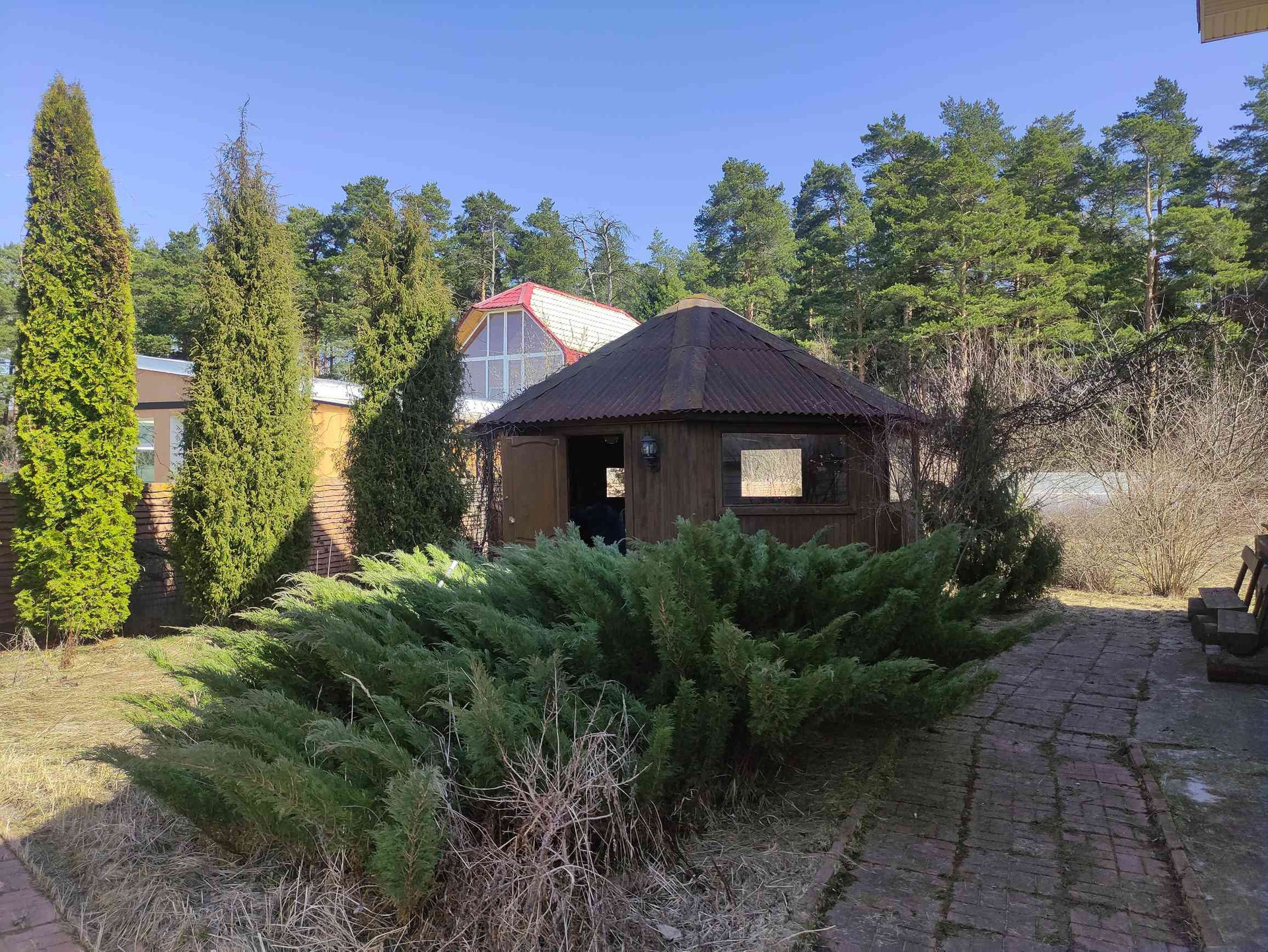 На участке есть беседка, летняя кухня, бассейн, гараж на 3 машины, хозблок, зелёные плодово-ягодные и хвойные насаждения. Участок имеет свой выход в лес.