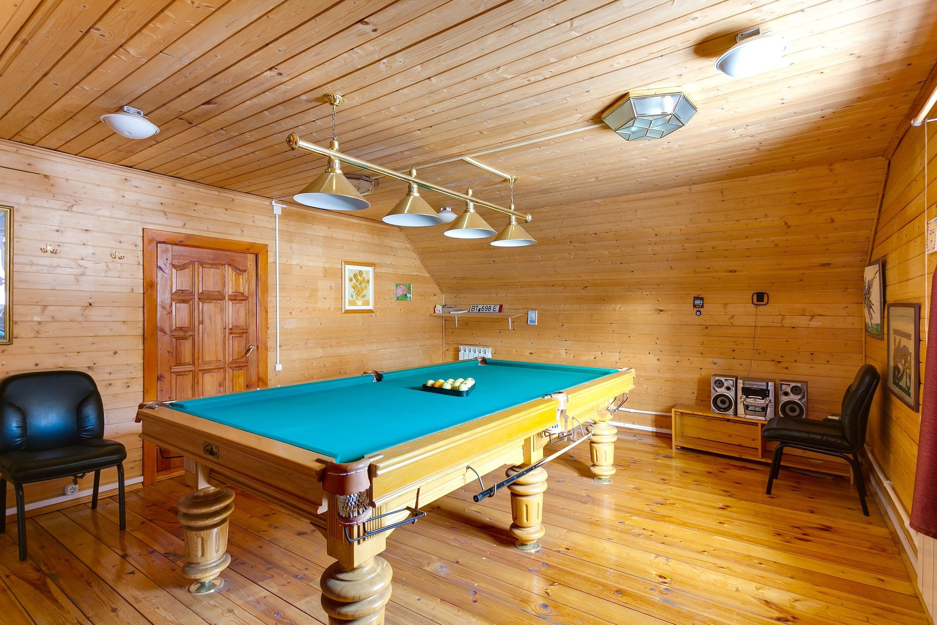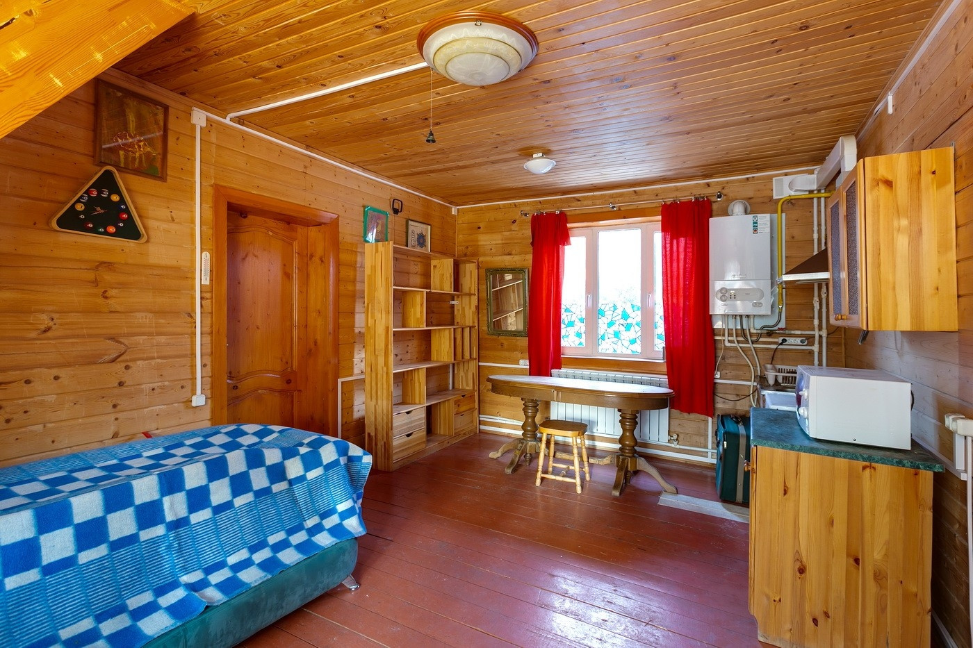 В малом доме: на 1 этаже - прихожая, кухня-столовая, сауна, санузел, на 2 этаже - спальня, холл и бильярдная комната.