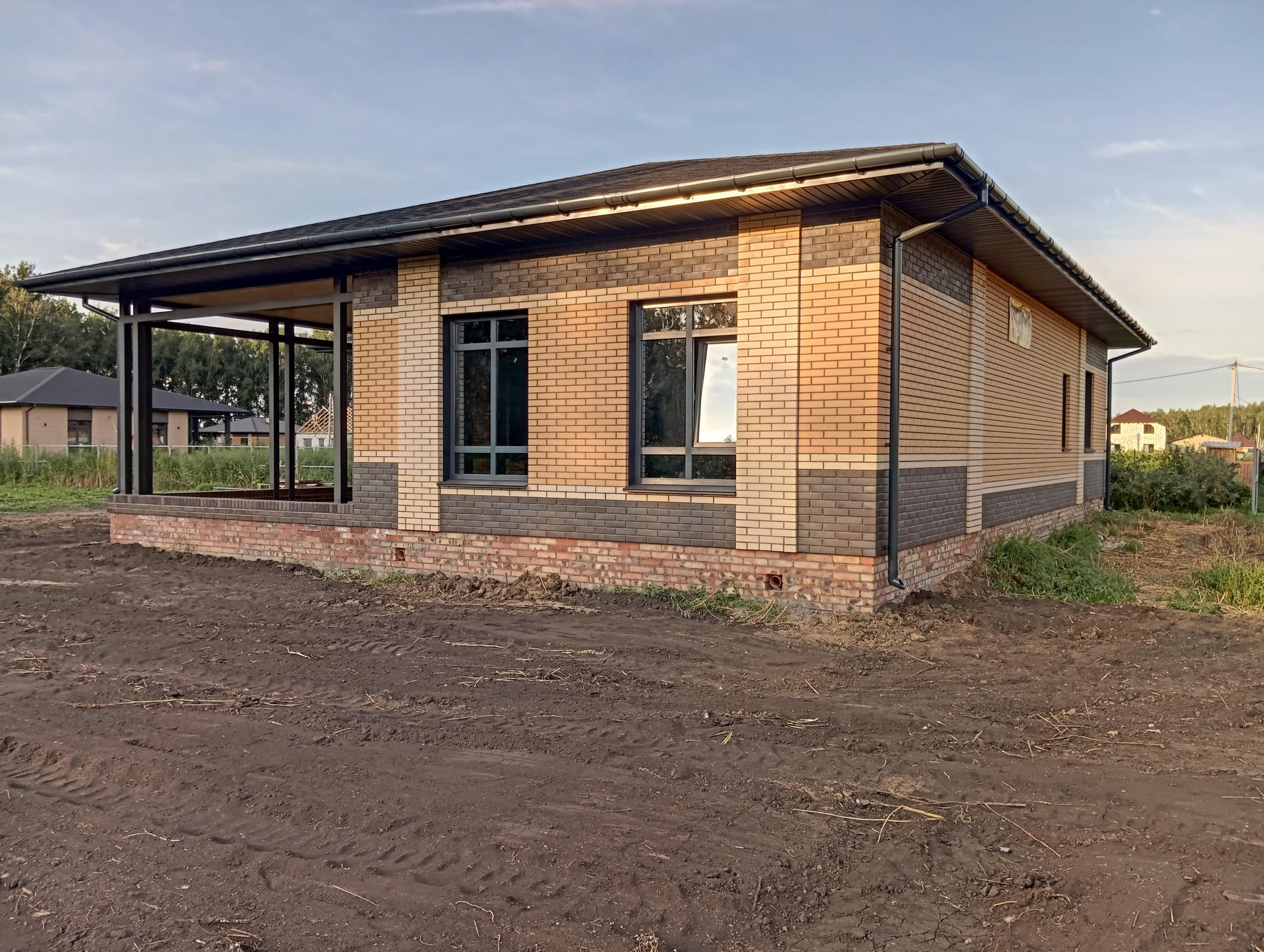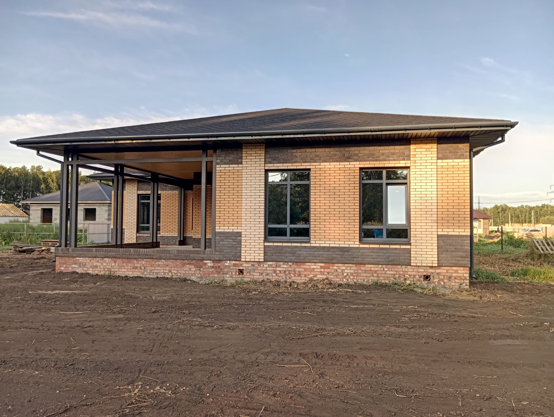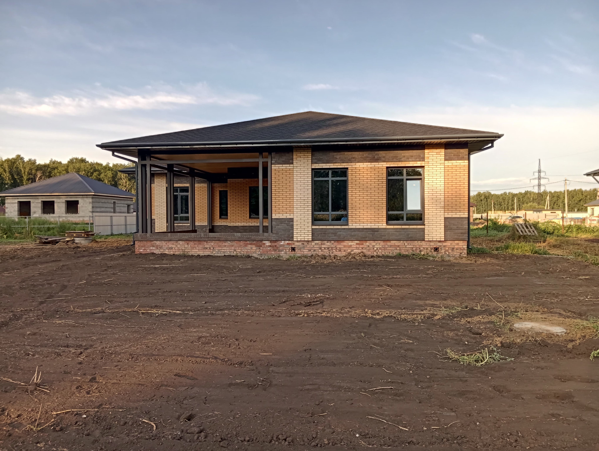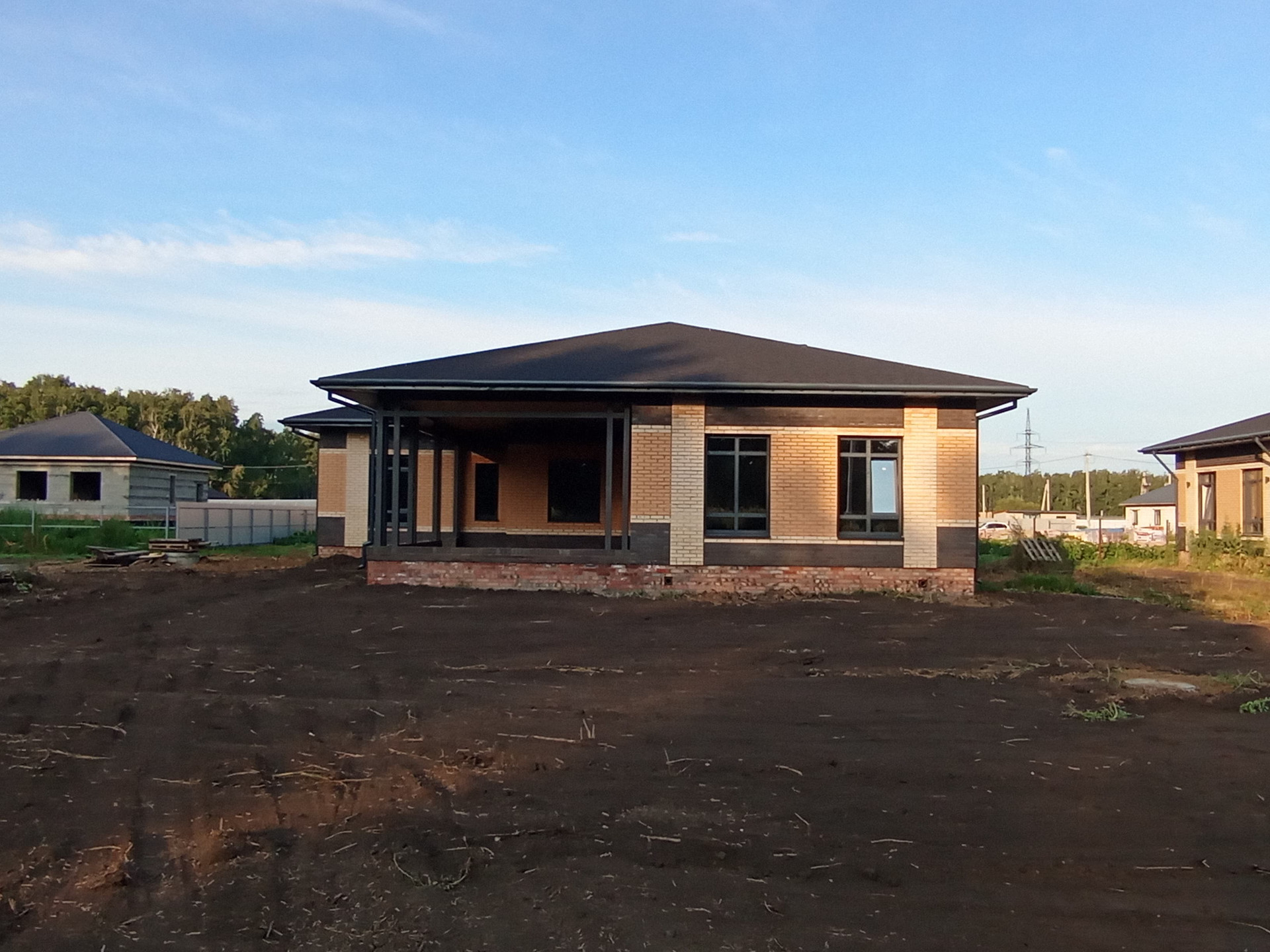 -стены дома выполнены из сибита плотностью D400( гораздо ниже теплопроводность по сравнению с керамзитоблоками, соответственно экономия на отоплении) плюс облицовочный кирпич( "Ликолор" г.Новосибирск)