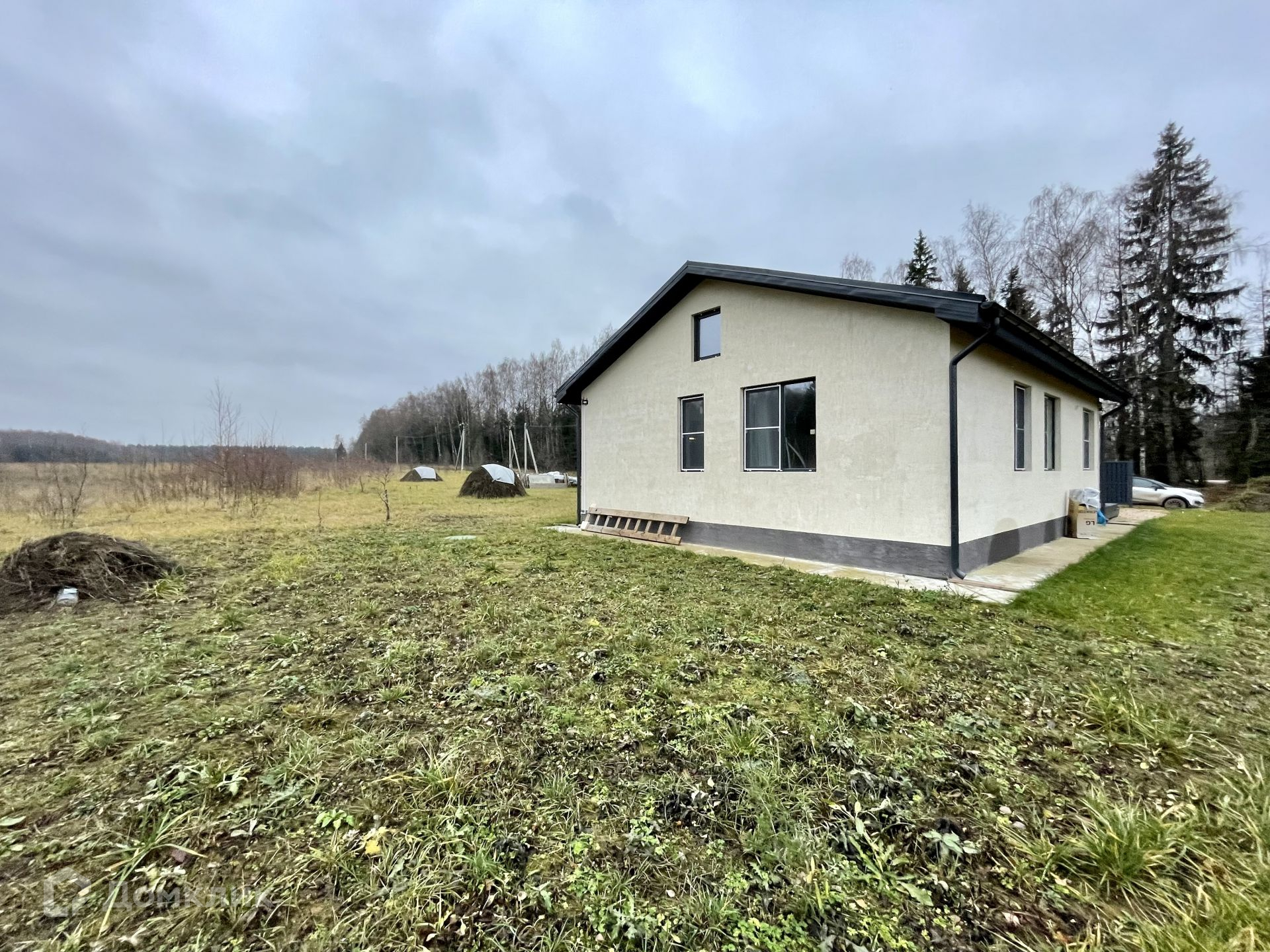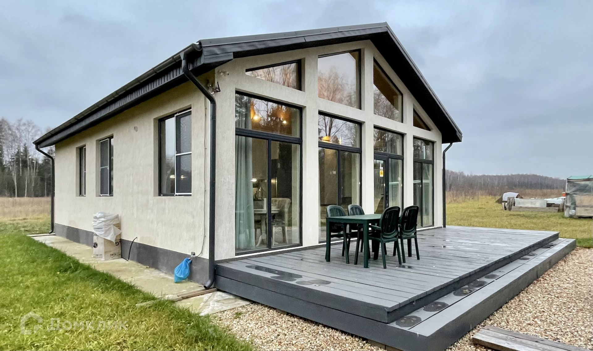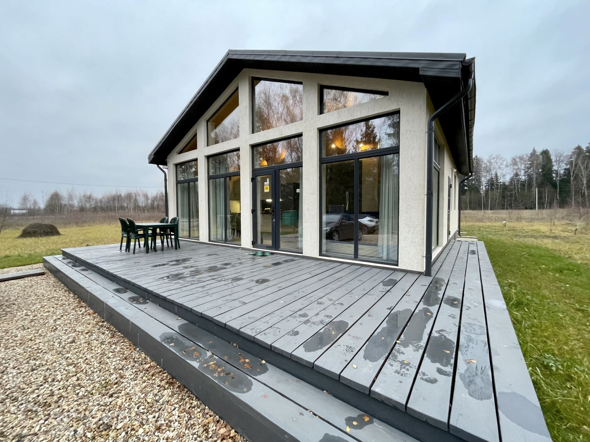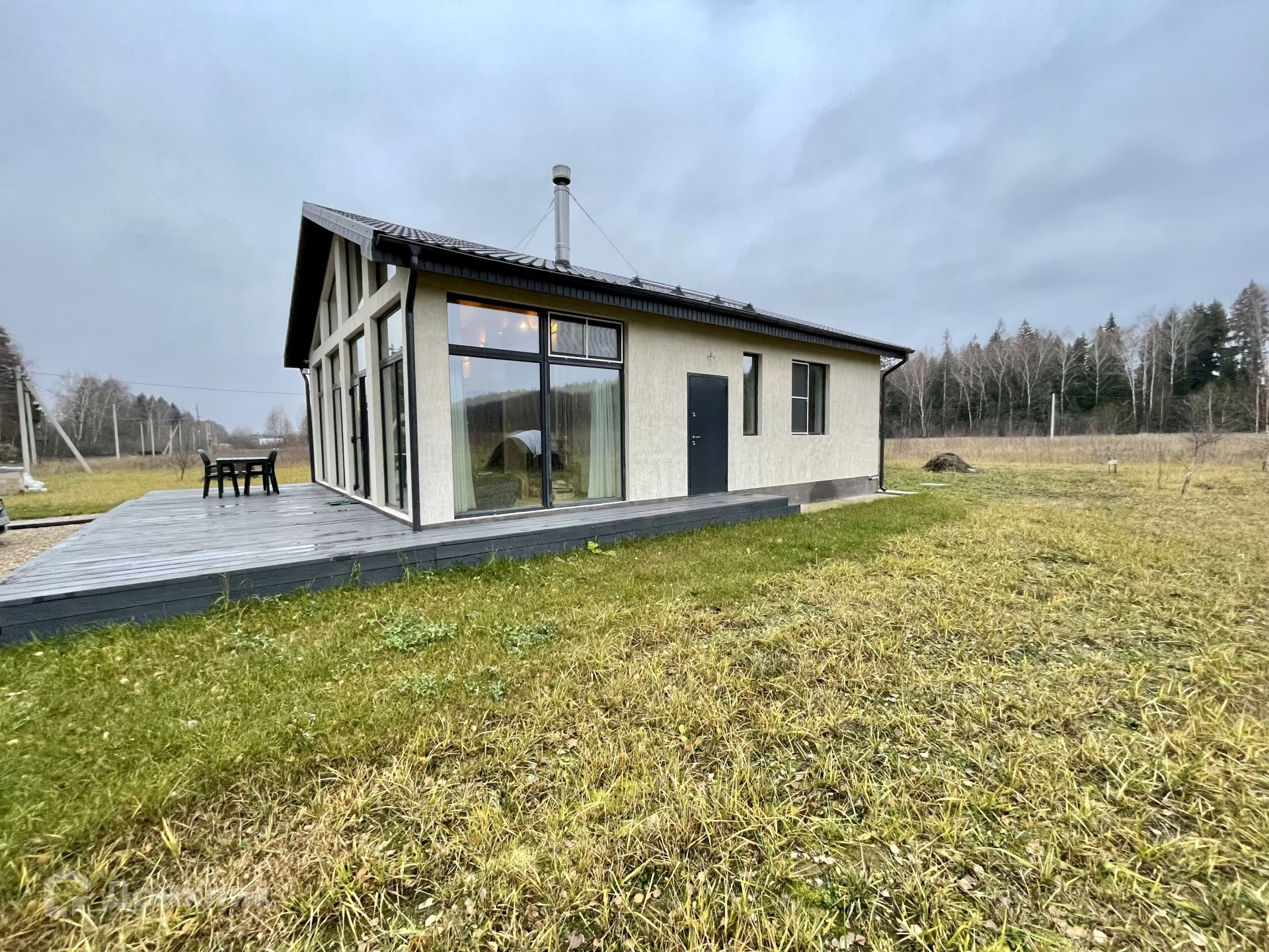 Планировка дома очень уютная и комфортная: вход в дом расположен с правой стороны дома, бойлерная+санузел, просторный холл с переходом с гостиную + кухня с панорамными окнами с выходом на террасу (30 кв.м), 2 просторные спальни, санузел.