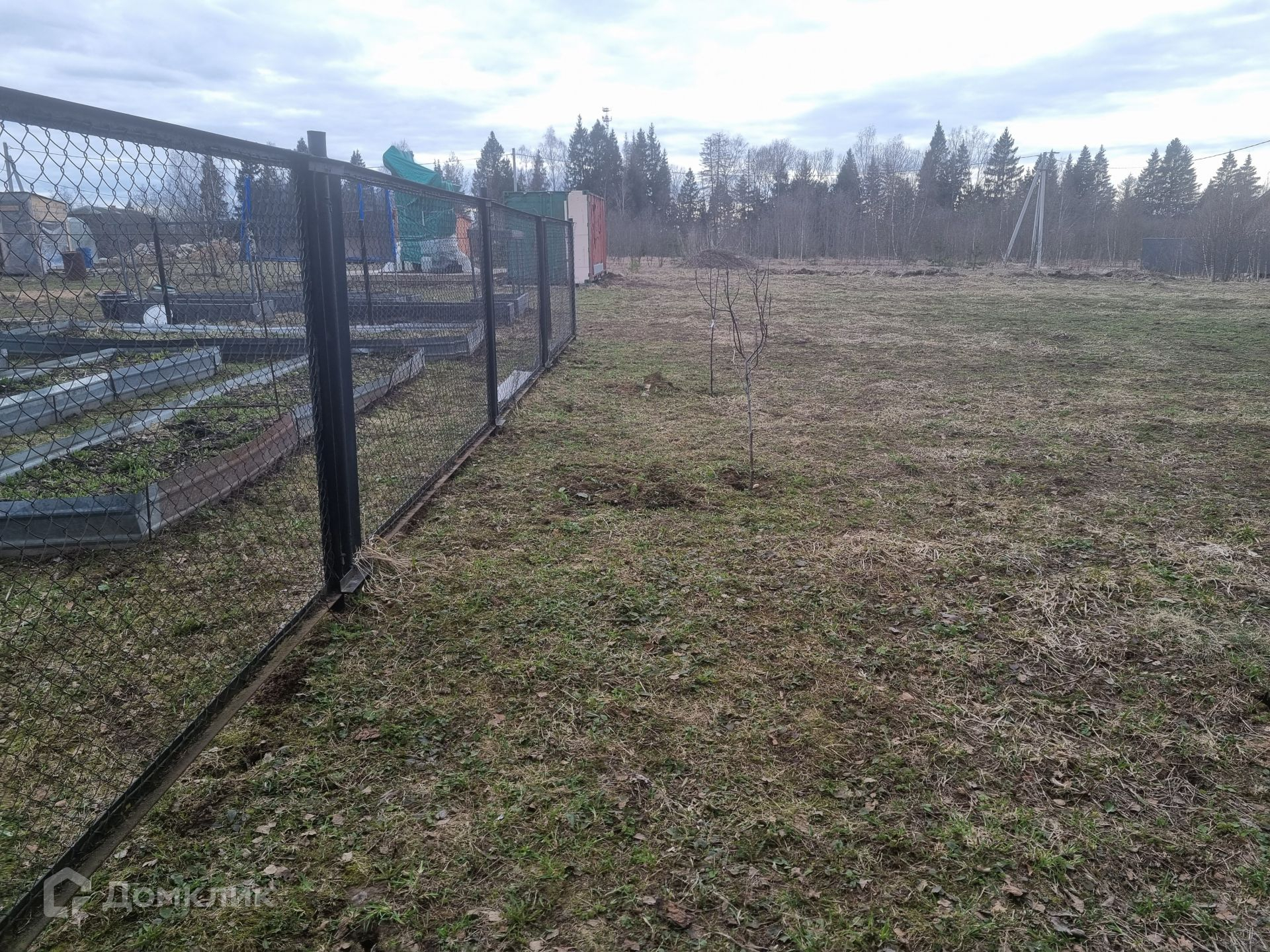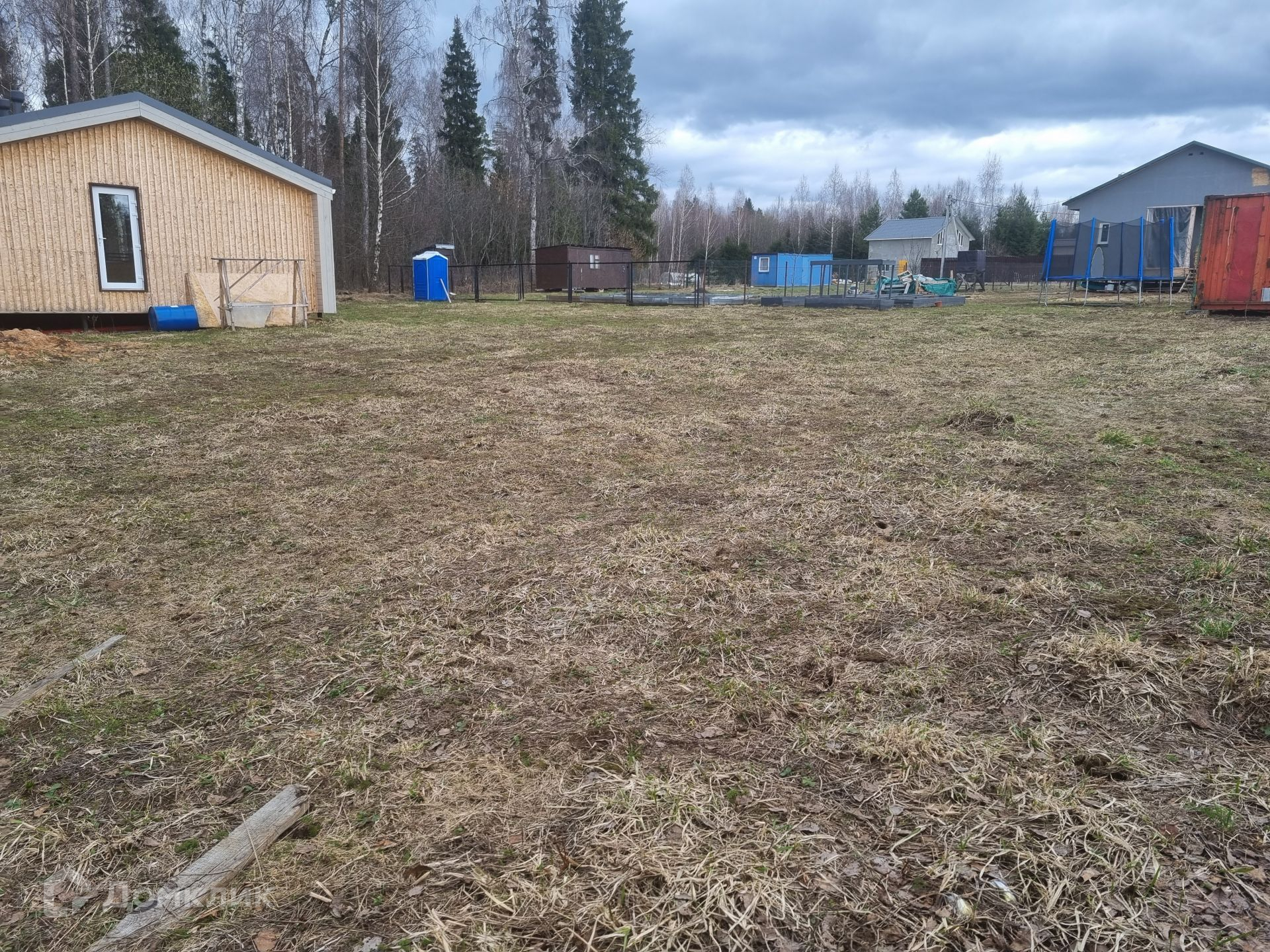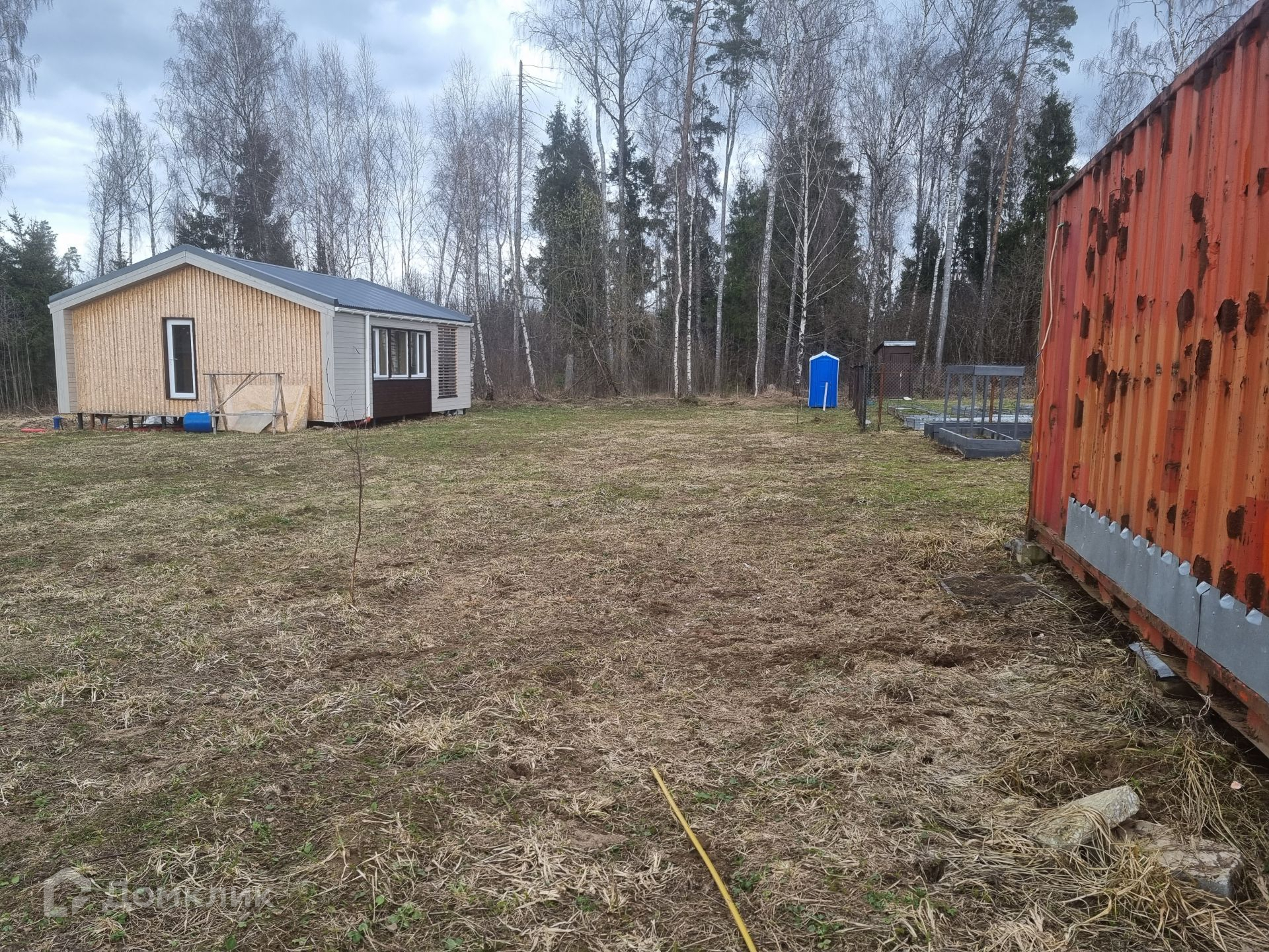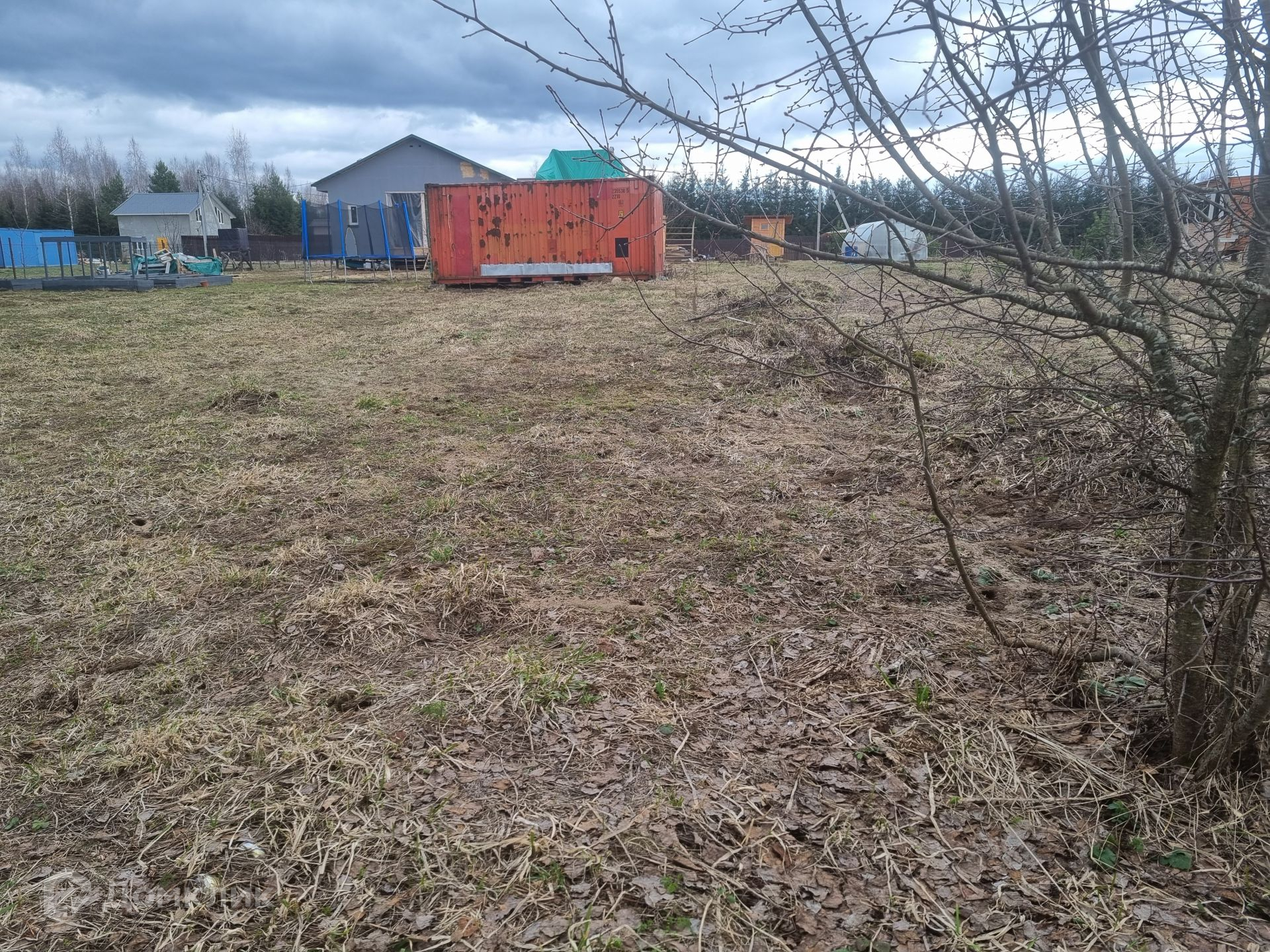Участок правильной прямоугольной формы, ровный, сухой. Уже посажены плодовые деревья и кустарники: яблоня, груша, малина, смородина. Расположение дома на участке позволяет возвести еще одну постройку или пристроить к имеющемуся дому дополнительную комнату (опция предусмотрена у застройщика дома).
