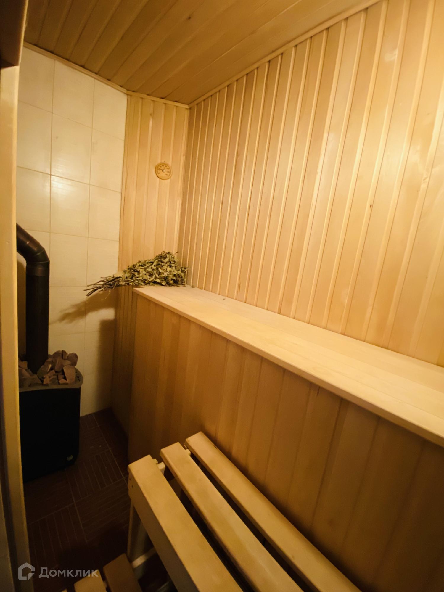На первом этаже расположена кухня, гостинная, спальня, санузел, дровяная сауна.