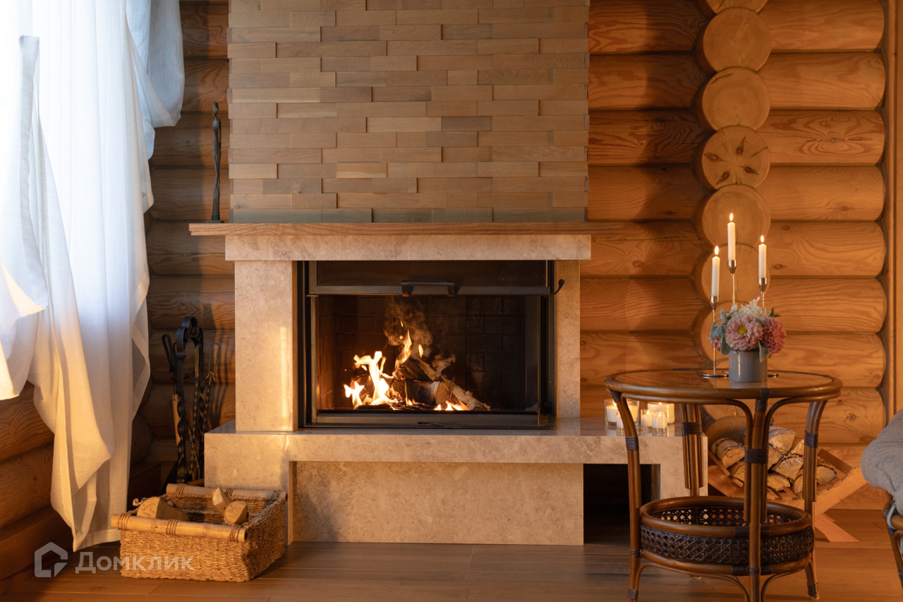 Гостиная с дровяным камином создаёт уютную атмосферу для вечеров в кругу семьи.