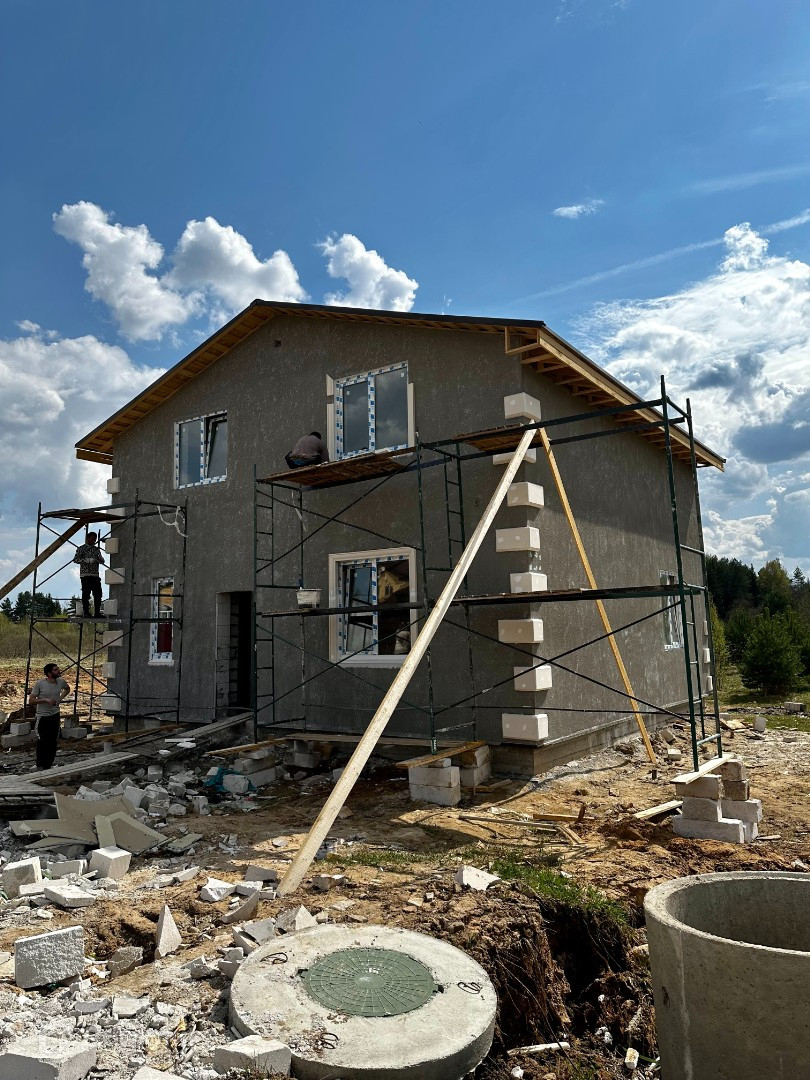 Материал стен -Газобетонный блок 300 мм, утеплитель 50 мм, фасад -декоративная штукатурка, декор, контурная подсветка.
