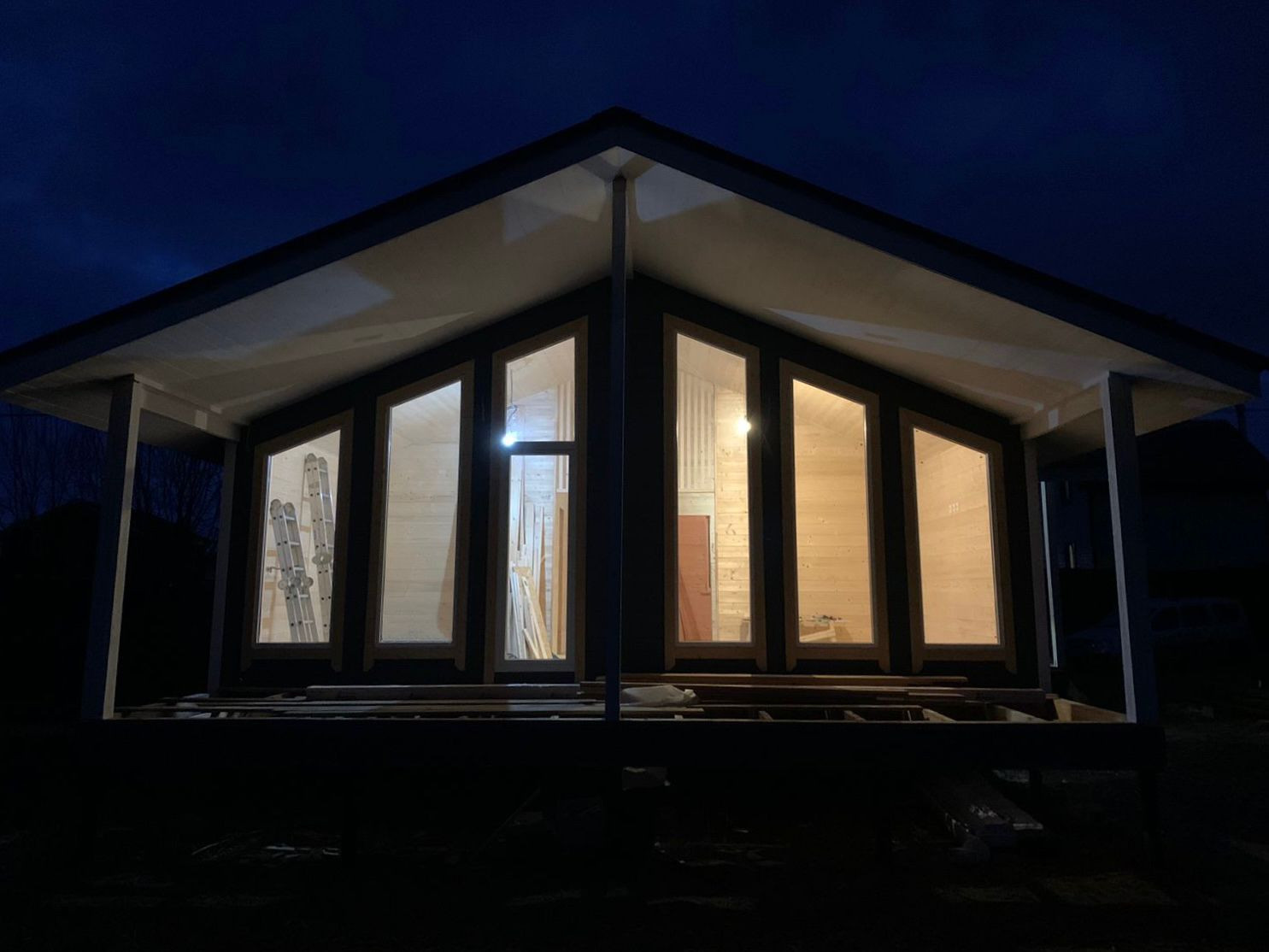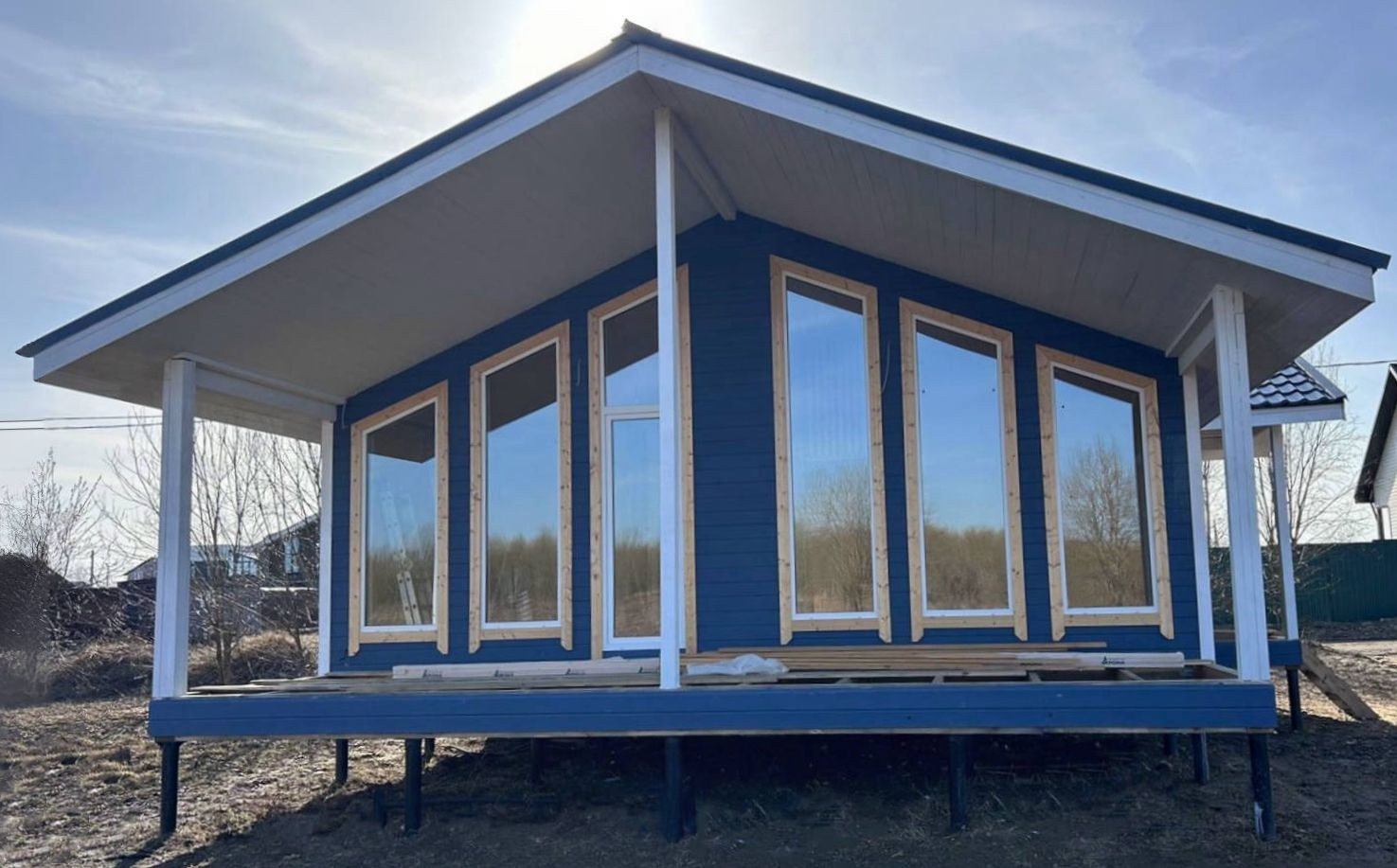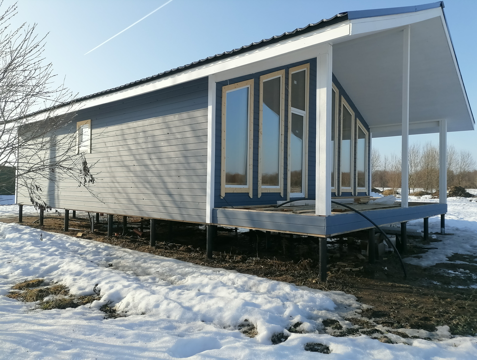 - Дом построен по каркасной технологии,который имеет в основе деревянный каркас, где все несущие элементы связаны между собой. Каркас заполнен утеплителем(каменная вата 150мм), пароизоляцией и другими изоляционными материалами.Внутренняя и внешняя отделка - имитация бруса(140мм).Крыша - металлочерепица(Grand Line 7024).Фундамент - металлические сваи(125мм).