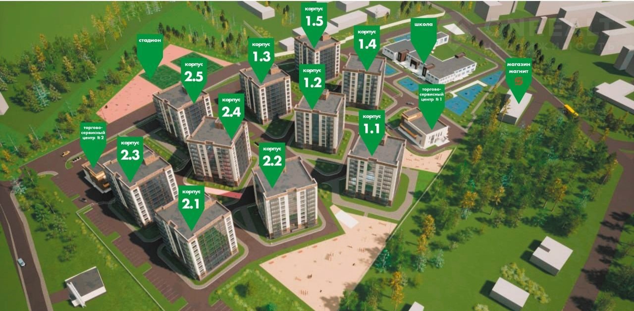 В состав комплекса входит десять жилых 9-ти этажных домов, по 8 квартир на этаже, с одной парадной и одним грузопассажирским лифтом, два торгово-сервисных центра, школа для начальных классов, обустроенные парки и сады, спортивные и детские площадки, парковочные места как на территории самого ЖК, так и за его периметром. Всего в комплексе запланировано 846 квартир.