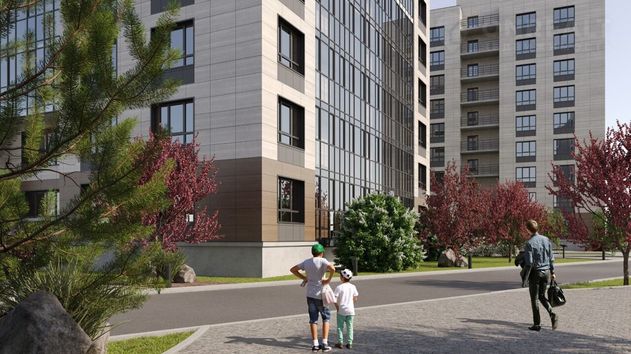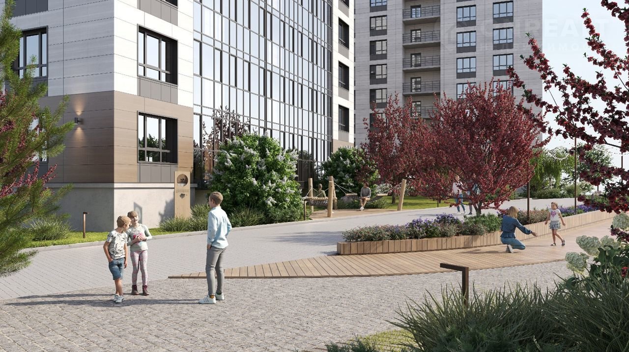 Благоустройство прилегающей территории предусматривает монтаж детской и спортивной площадок, парковочные места и озеленение.