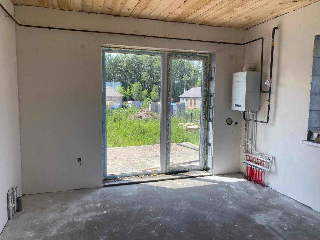 Фундамент ленточный свайный. Стены - газоблок с утеплителем, облицованный кирпичом. Крыша профнастил, утепленный опилкой. Дверь железная, с терморазрывом. Котёл Daesung, двухконтурный. Тёплые полы. Предчистовая отделка. Газ, свет, вода, канализация.