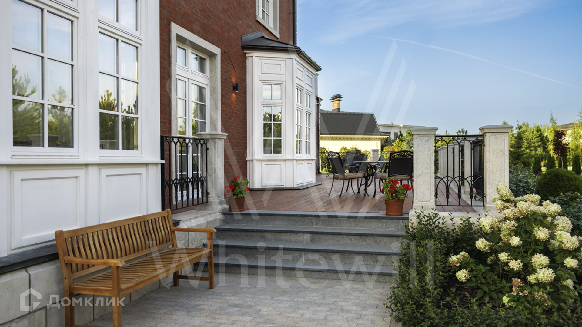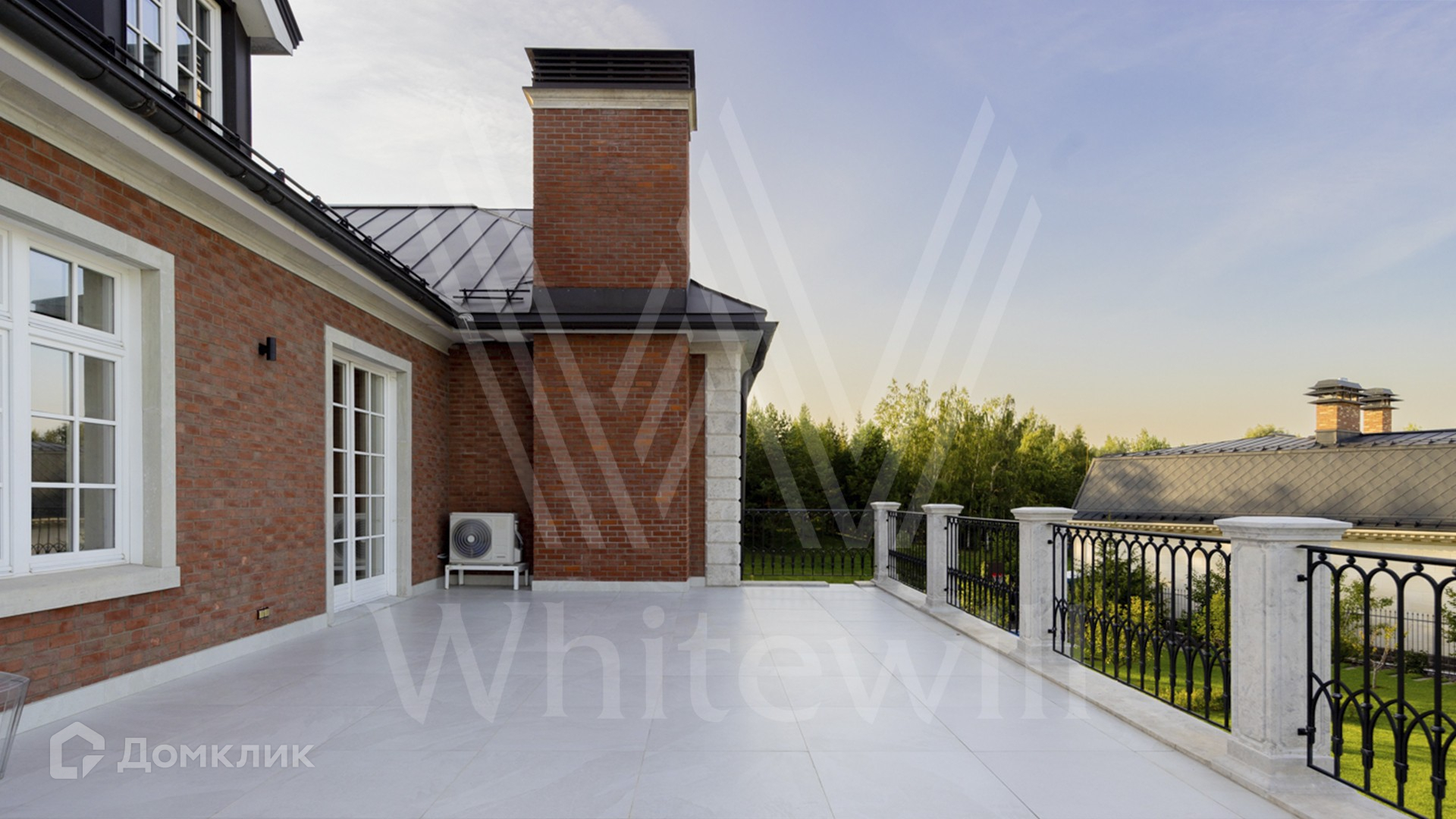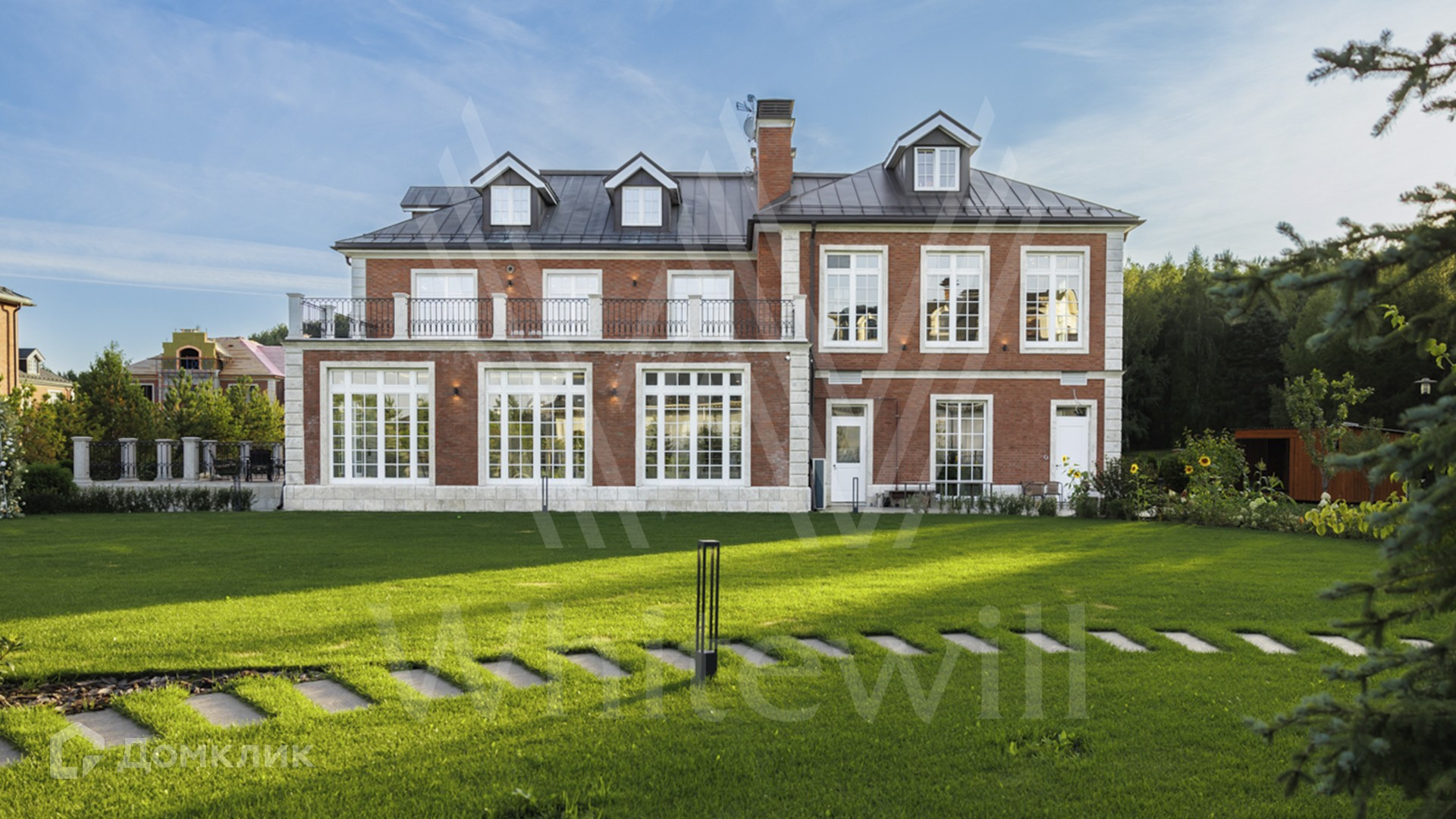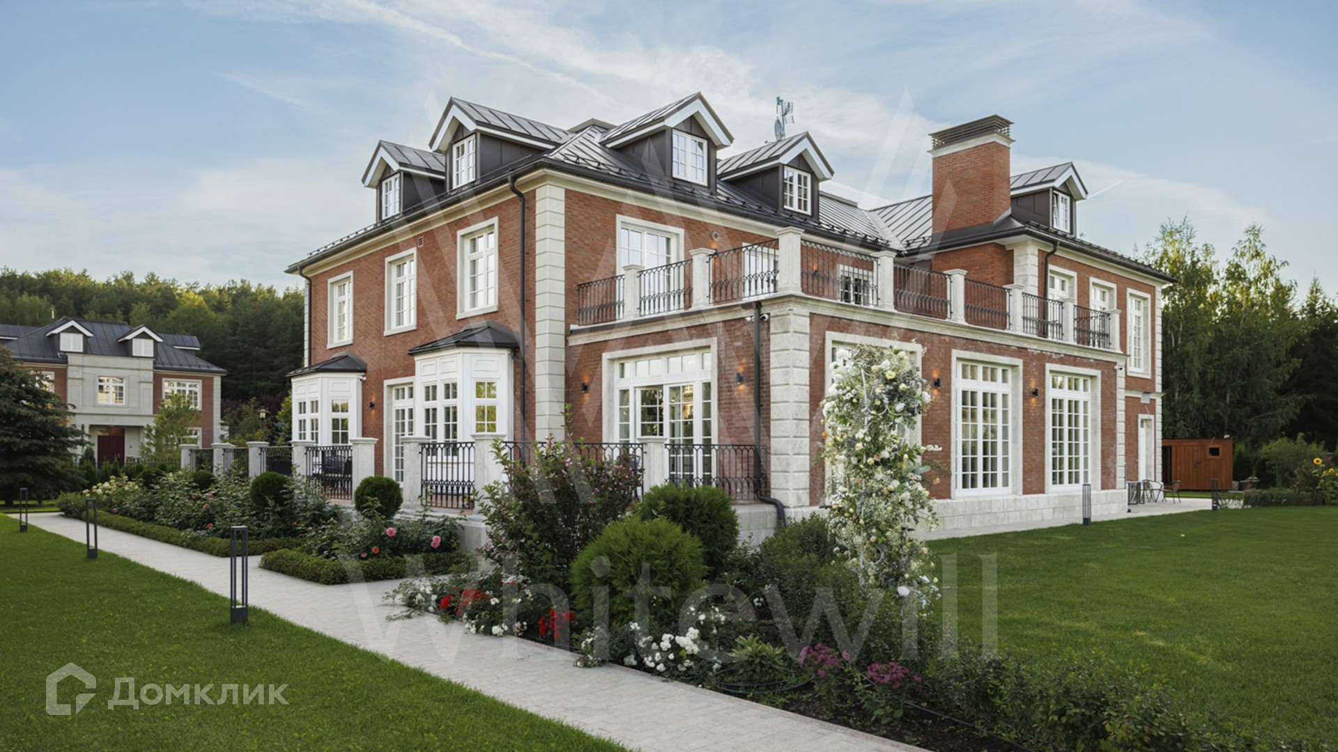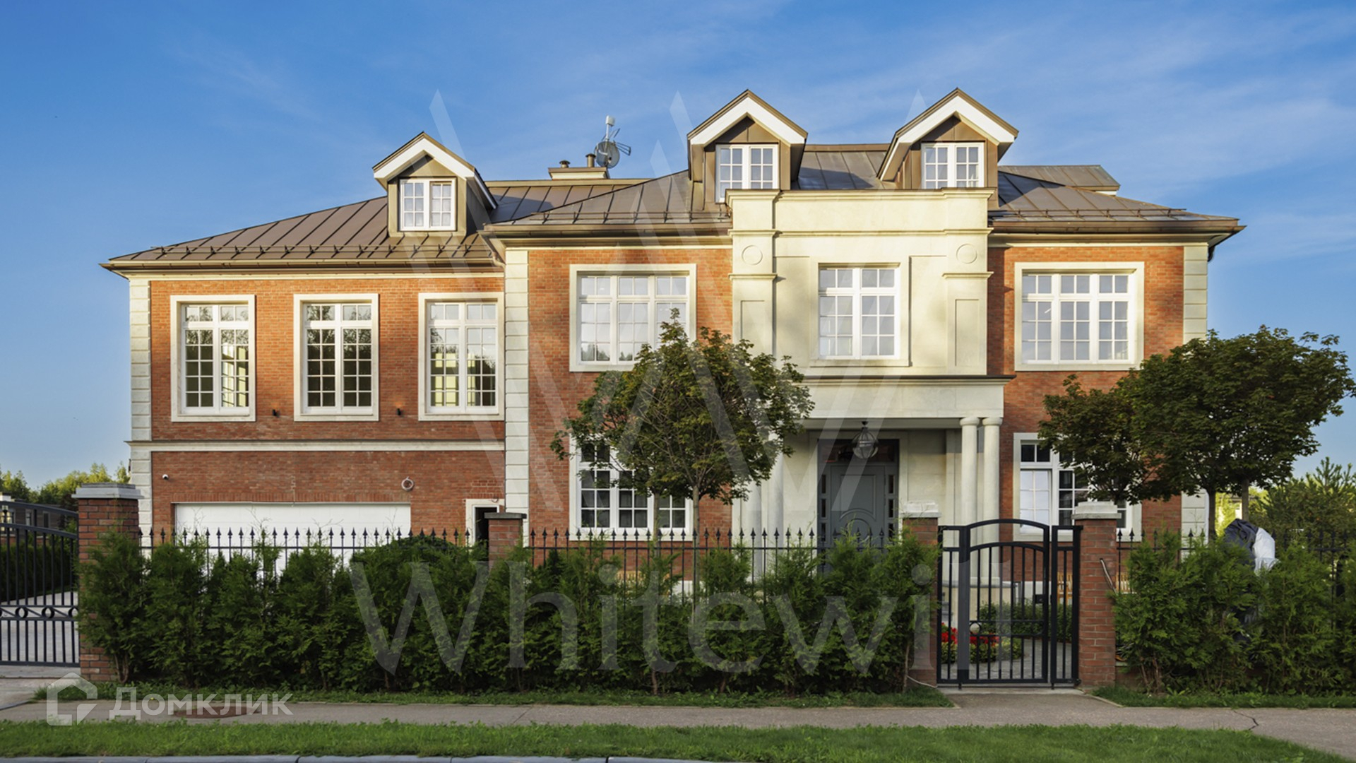 ID 11 501. Раздоры-2. Загородный особняк площадью 1000 м² построен на участке 27 соток. Кирпичный фасад с белыми наличниками выполнен в европейском стиле. Благодаря большой площади остекления внутреннее пространство наполнено воздухом и светом. Интерьер в теплых тонах сочетает элементы классики и современности. В доме разместили 6 спален, просторную гостиную с камином, кухню-столовую, кабинет и бильярдную. На цокольном этаже находятся тренажерный зал и сауна. Предусмотрены квартира для персонала и гараж.