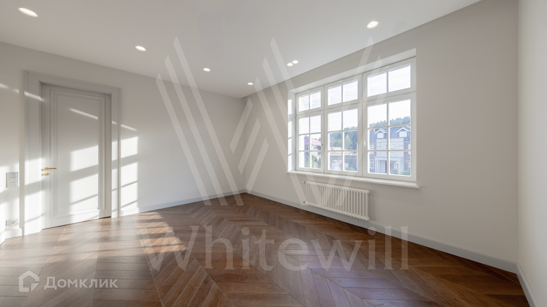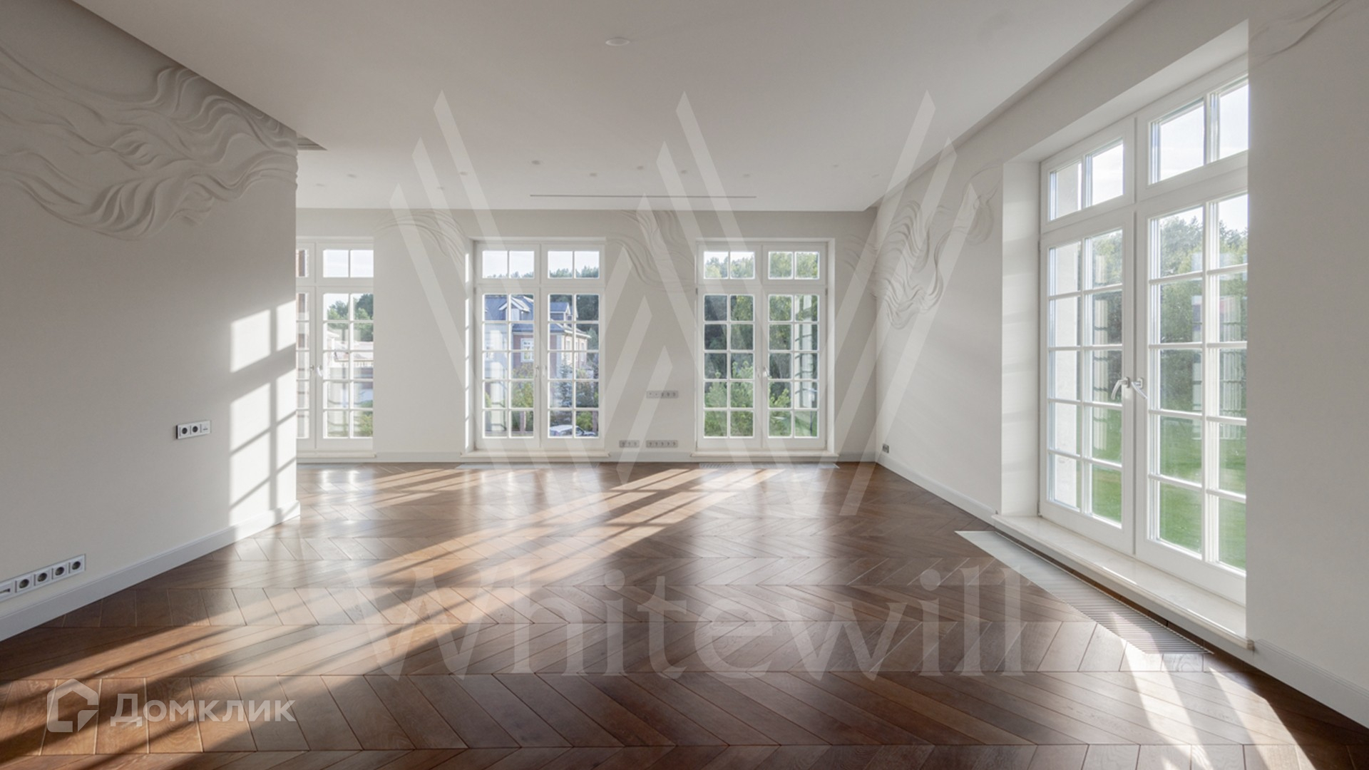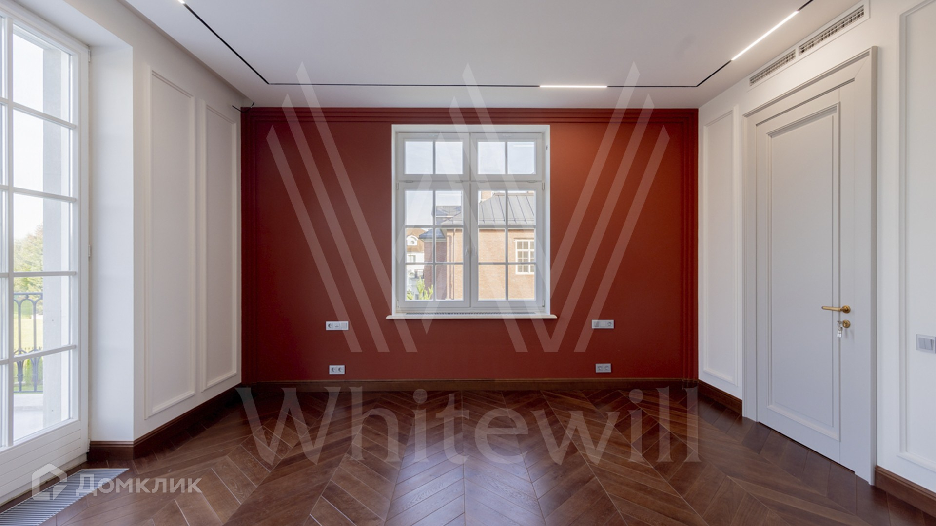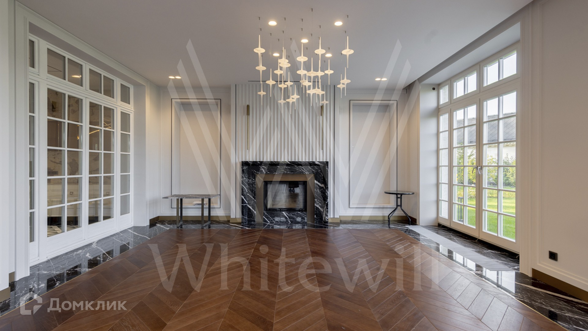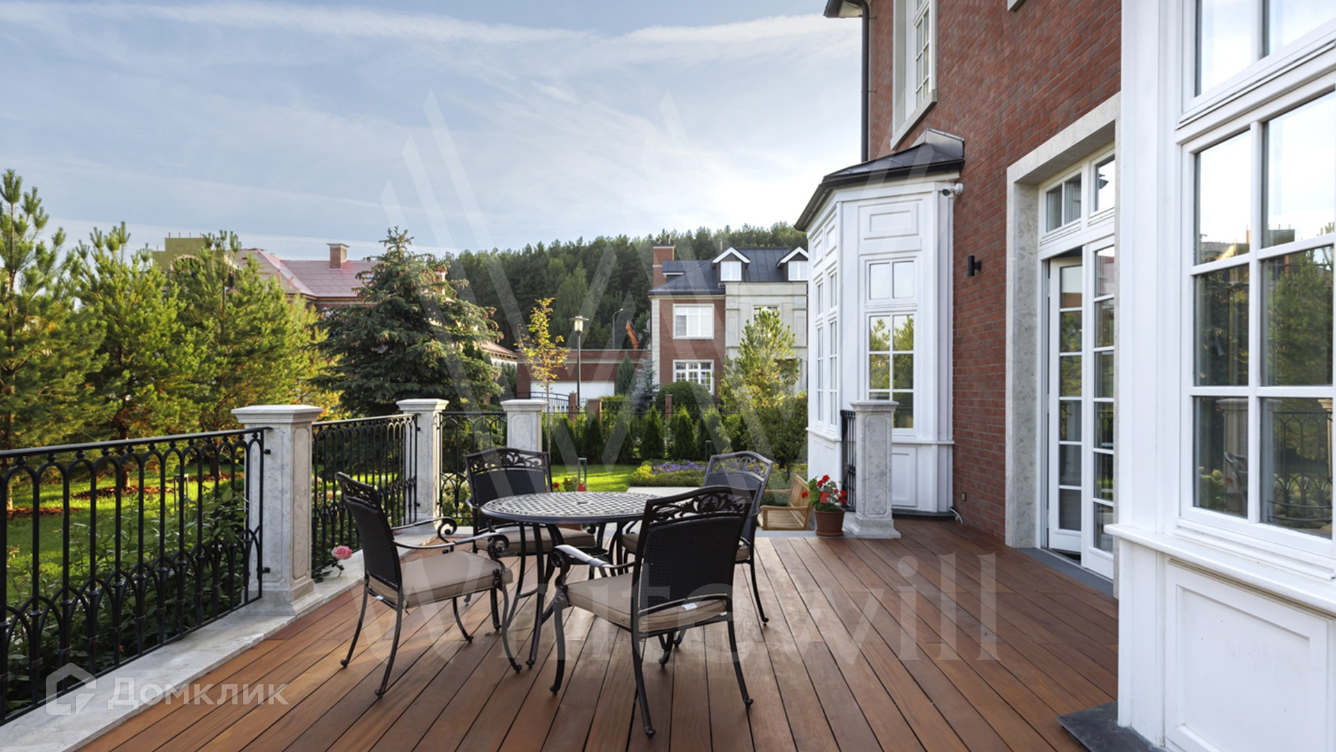 ID 11 501. Раздоры-2. Загородный особняк площадью 1000 м² построен на участке 27 соток. Кирпичный фасад с белыми наличниками выполнен в европейском стиле. Благодаря большой площади остекления внутреннее пространство наполнено воздухом и светом. Интерьер в теплых тонах сочетает элементы классики и современности. В доме разместили 6 спален, просторную гостиную с камином, кухню-столовую, кабинет и бильярдную. На цокольном этаже находятся тренажерный зал и сауна. Предусмотрены квартира для персонала и гараж.