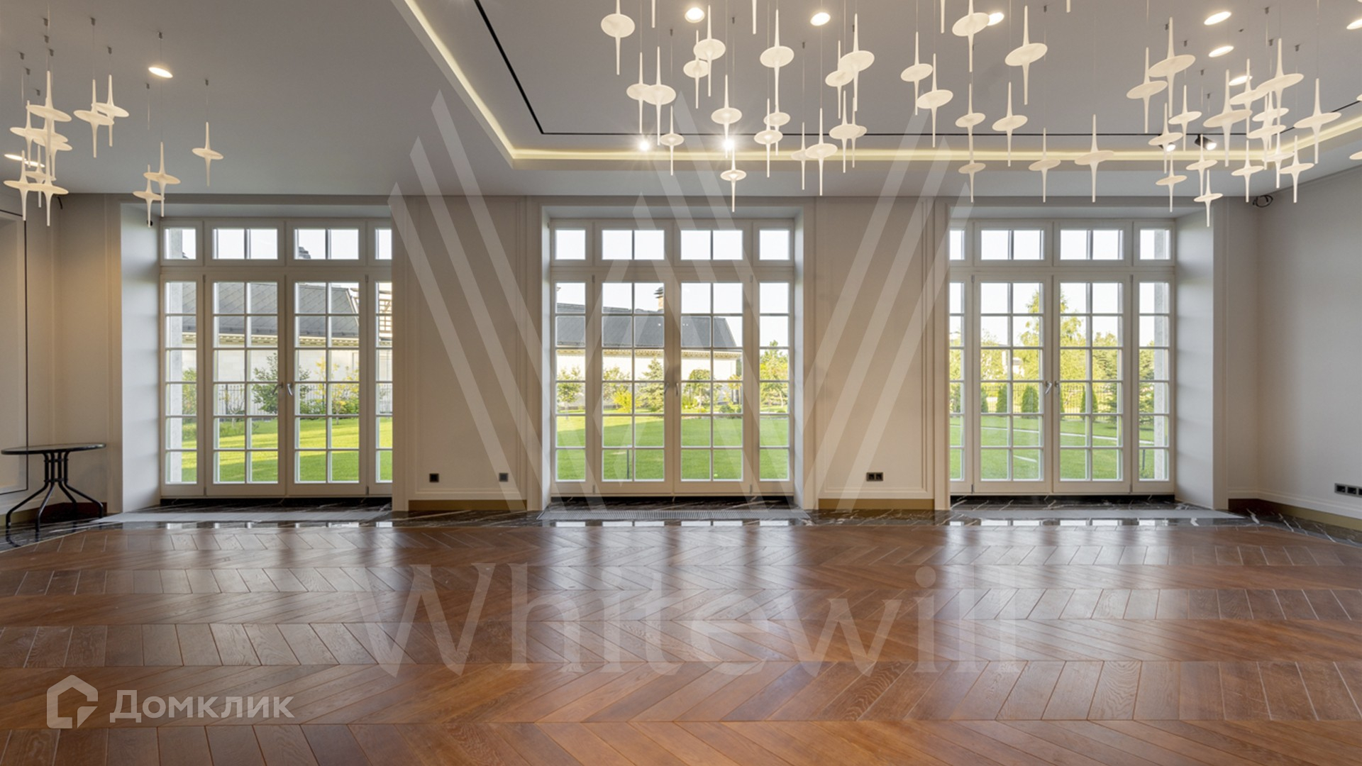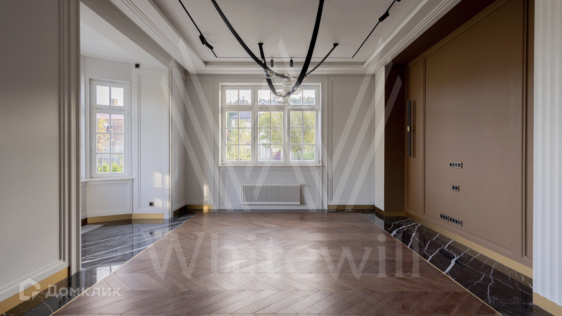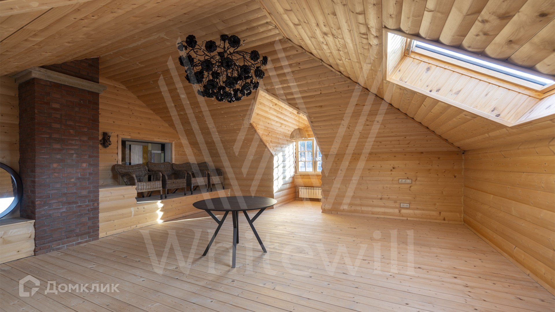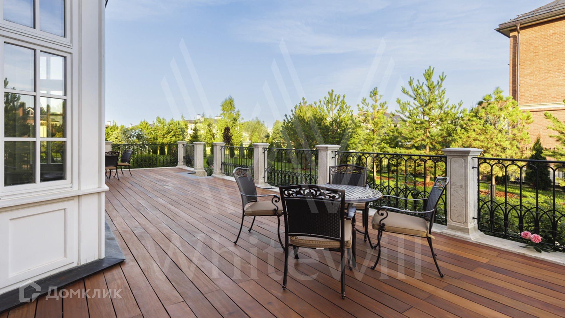 ID 11 501. Раздоры-2. Загородный особняк площадью 1000 м² построен на участке 27 соток. Кирпичный фасад с белыми наличниками выполнен в европейском стиле. Благодаря большой площади остекления внутреннее пространство наполнено воздухом и светом. Интерьер в теплых тонах сочетает элементы классики и современности. В доме разместили 6 спален, просторную гостиную с камином, кухню-столовую, кабинет и бильярдную. На цокольном этаже находятся тренажерный зал и сауна. Предусмотрены квартира для персонала и гараж.