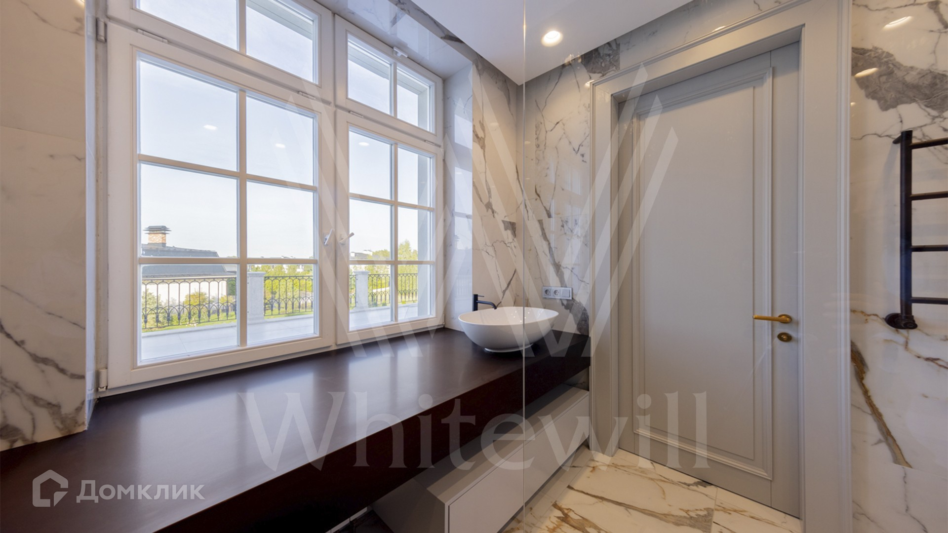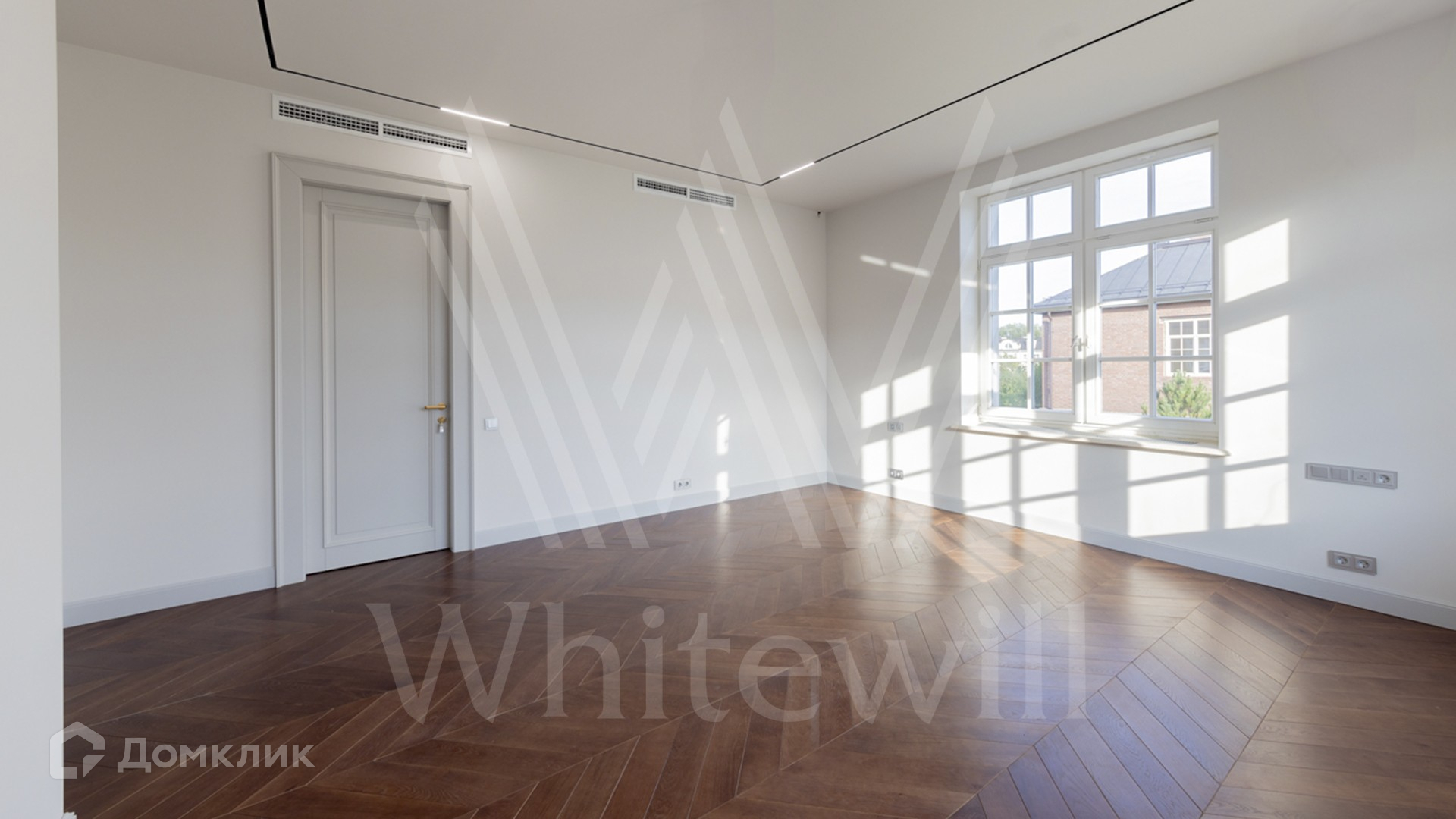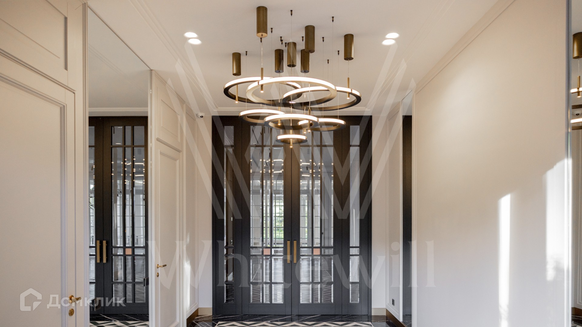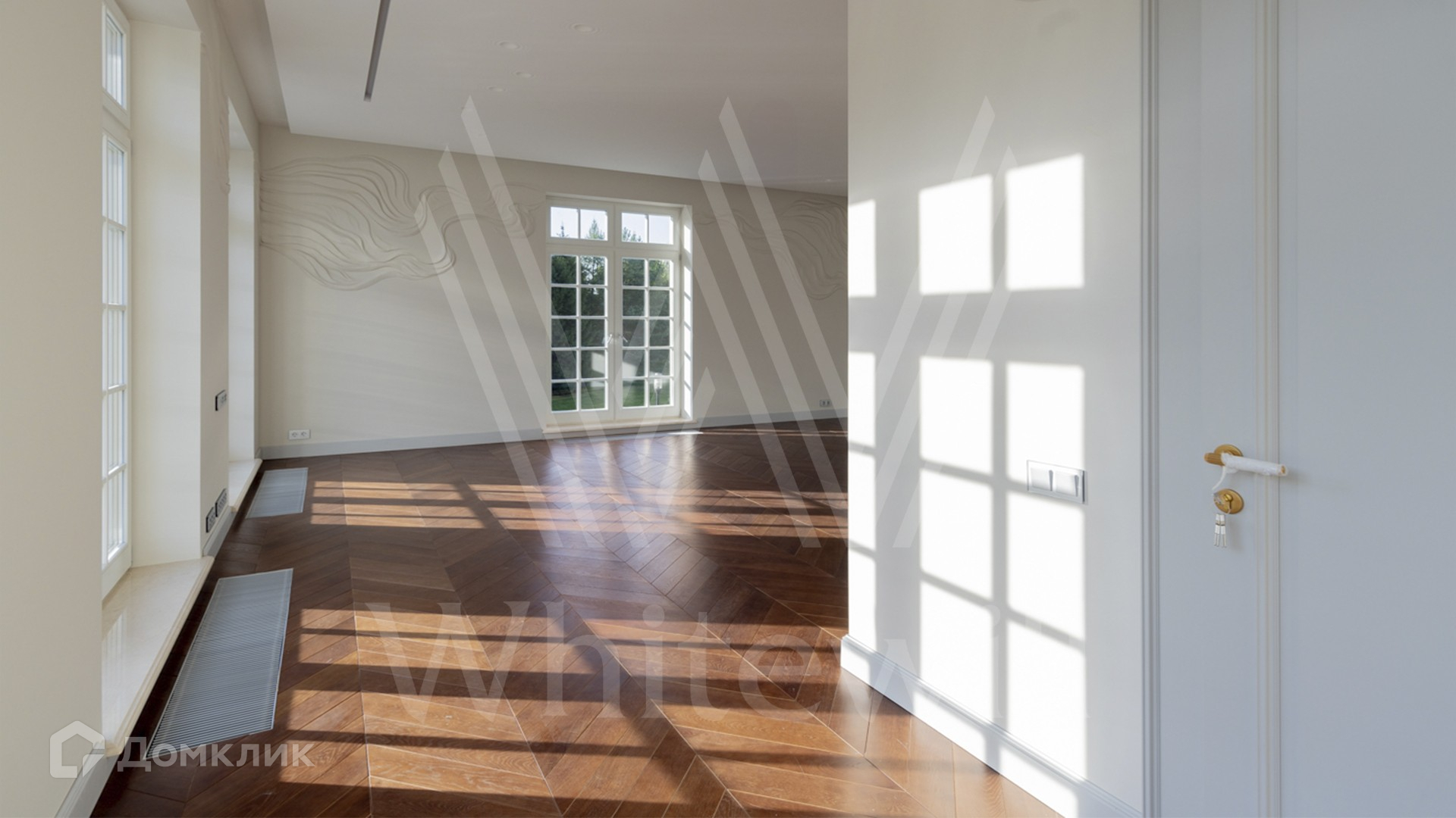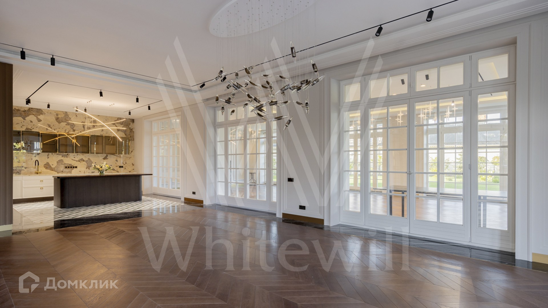 ID 11 501. Раздоры-2. Загородный особняк площадью 1000 м² построен на участке 27 соток. Кирпичный фасад с белыми наличниками выполнен в европейском стиле. Благодаря большой площади остекления внутреннее пространство наполнено воздухом и светом. Интерьер в теплых тонах сочетает элементы классики и современности. В доме разместили 6 спален, просторную гостиную с камином, кухню-столовую, кабинет и бильярдную. На цокольном этаже находятся тренажерный зал и сауна. Предусмотрены квартира для персонала и гараж.