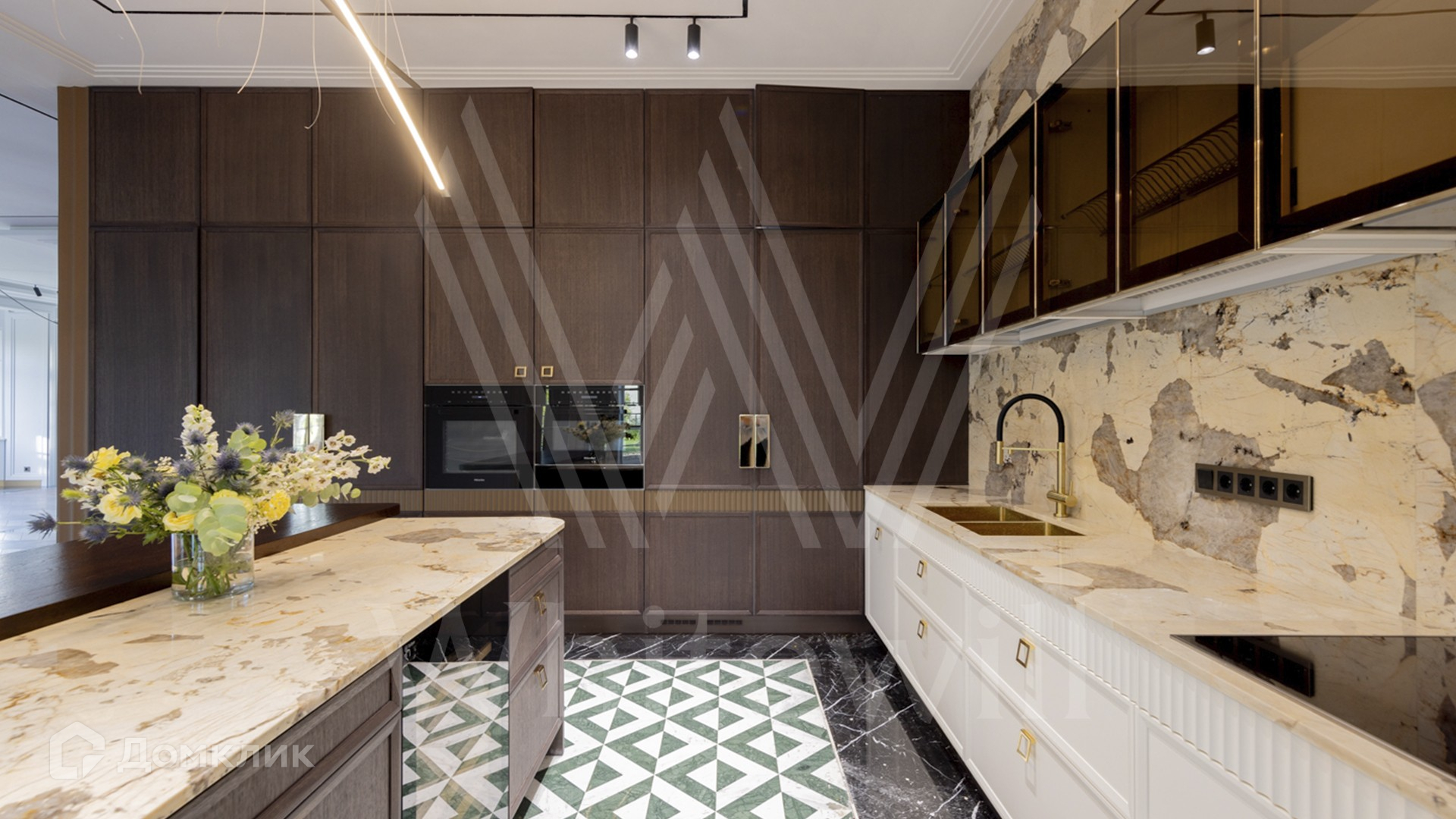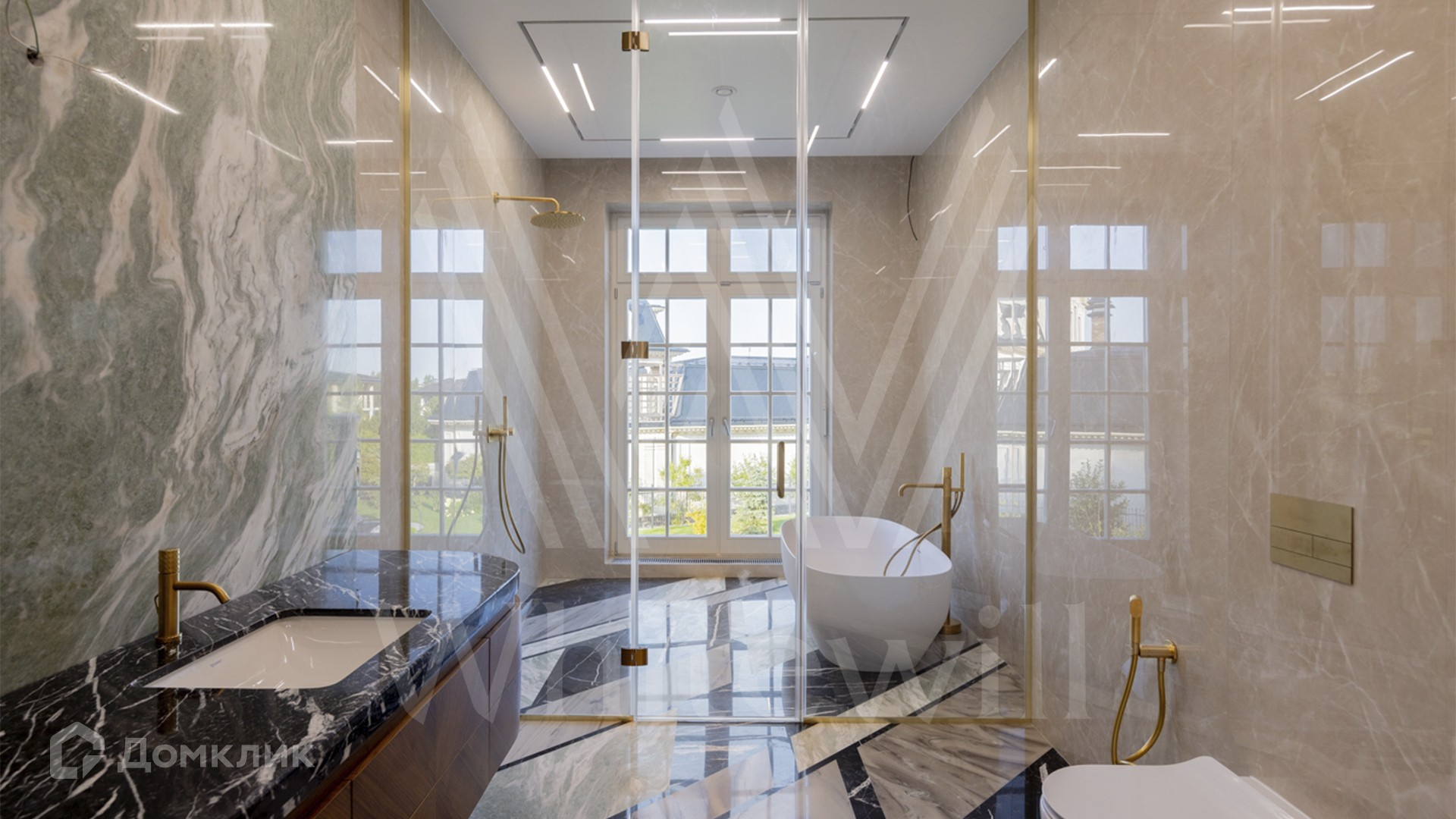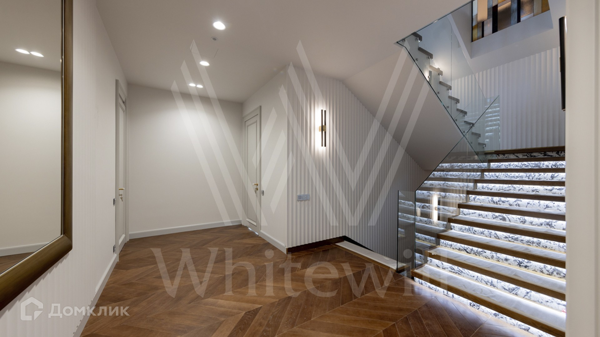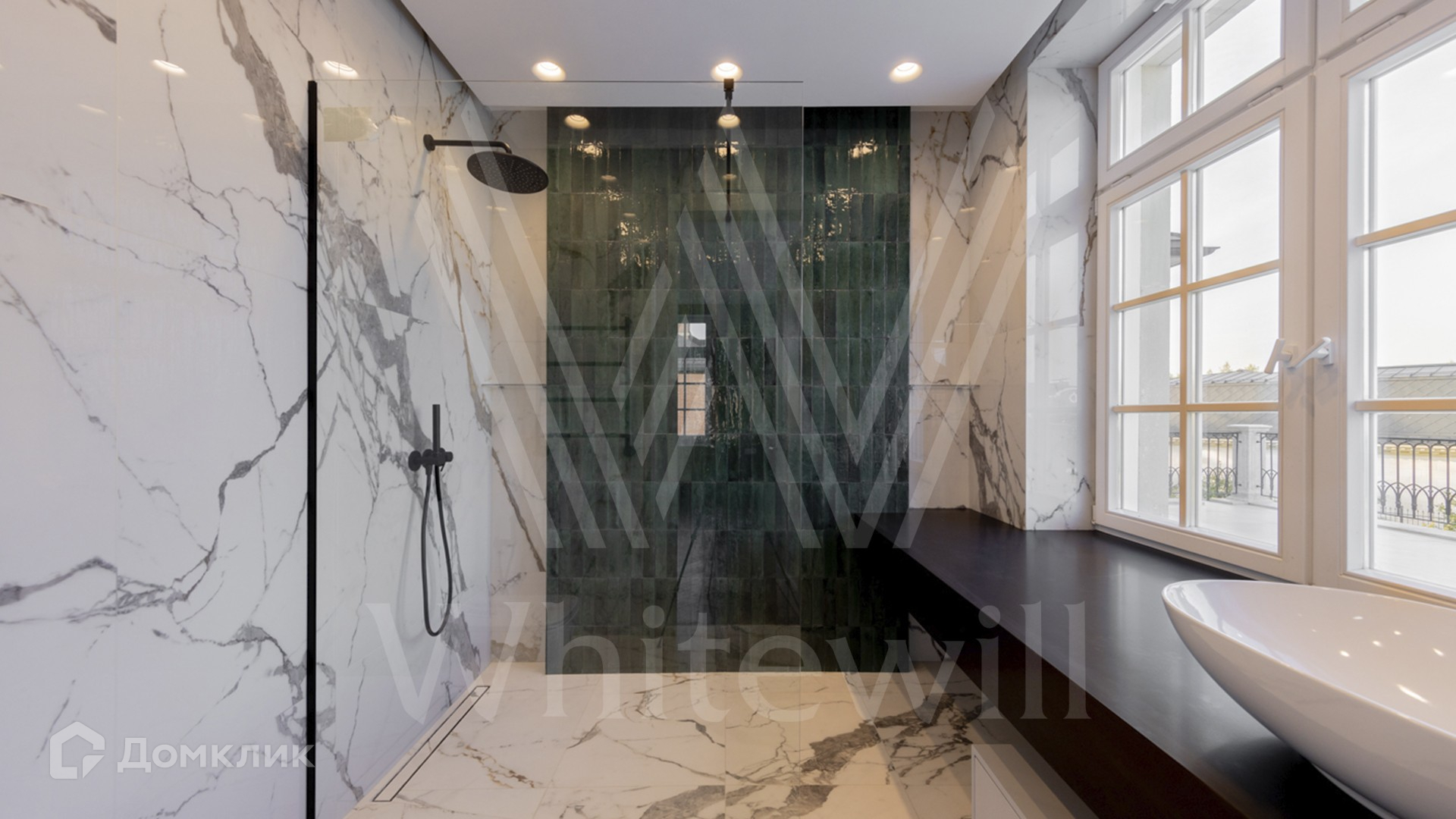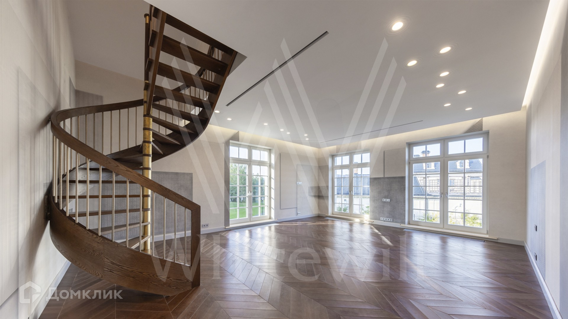 ID 11 501. Раздоры-2. Загородный особняк площадью 1000 м² построен на участке 27 соток. Кирпичный фасад с белыми наличниками выполнен в европейском стиле. Благодаря большой площади остекления внутреннее пространство наполнено воздухом и светом. Интерьер в теплых тонах сочетает элементы классики и современности. В доме разместили 6 спален, просторную гостиную с камином, кухню-столовую, кабинет и бильярдную. На цокольном этаже находятся тренажерный зал и сауна. Предусмотрены квартира для персонала и гараж.