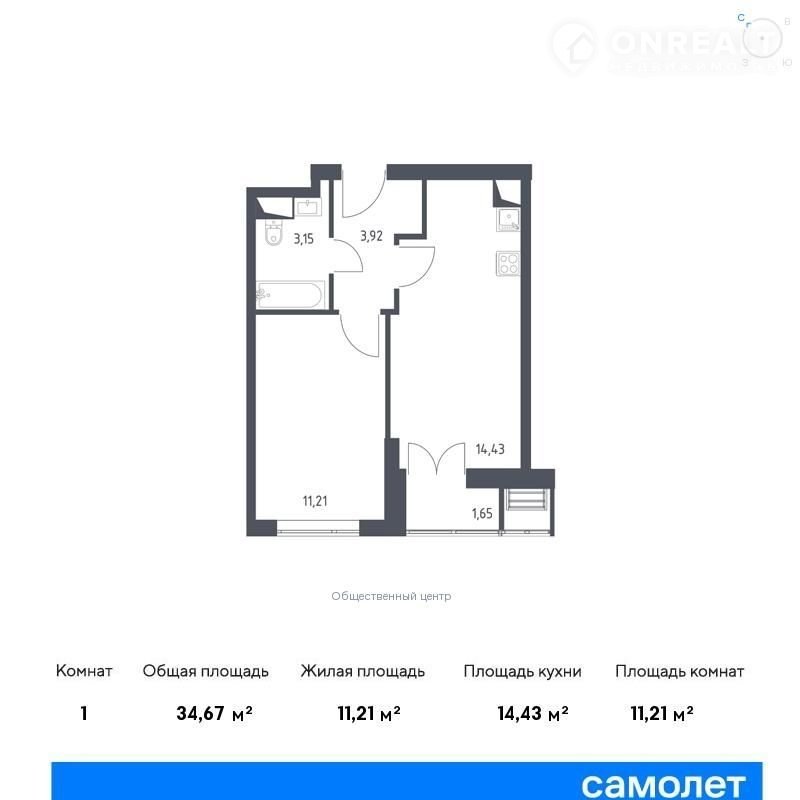 Общая площадь 34.7 м2