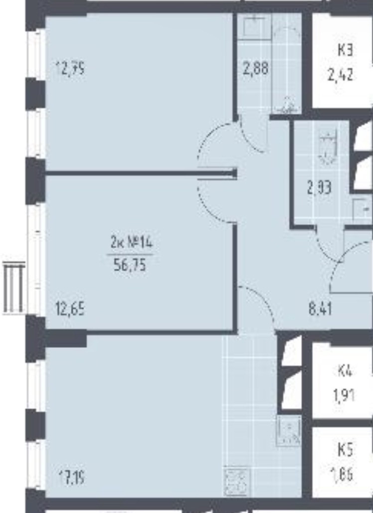 Две изолированные комнаты 12,79 кв.м., 12,65 кв.м., кухня- гостиная 17,19 кв.м.,