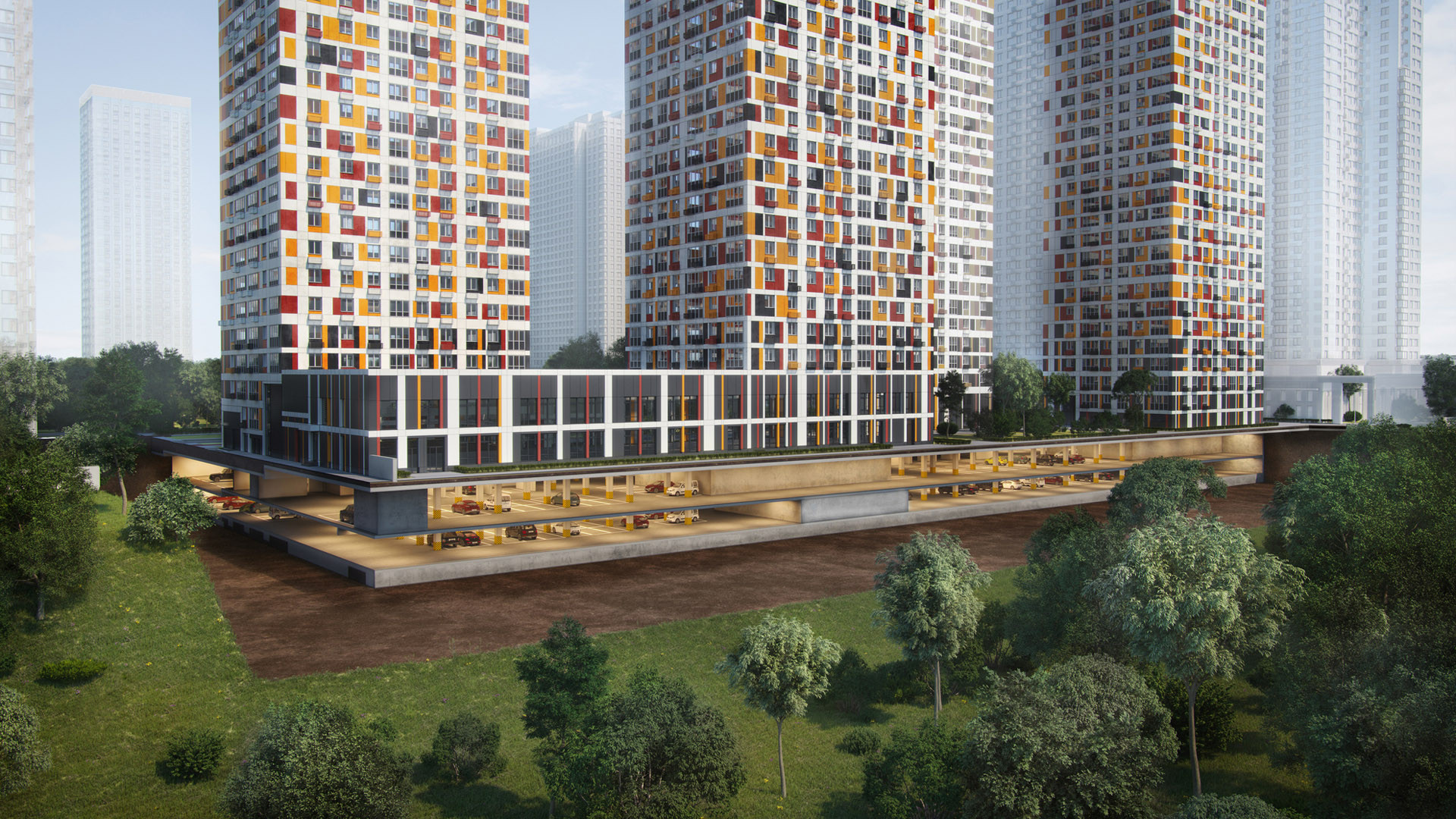 Для автовладельцев в комплексе предусмотрена двухуровневая подземная парковка с возможностью помесячной аренды, а для людей, предпочитающих общественный транспорт, в тридцати метрах от подъезда находится автобусная остановка, с которой можно доехать до станций метро Строгино, Мякинино, Крылатское.