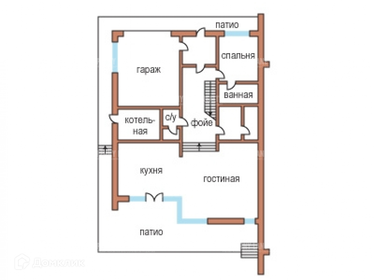 1 этаж: тамбур, фойе, кухня, гостиная, спальня, котельная, постирочная-гладильная, кладовая, электрощитовая, 2 с/у, гараж на 2 м/м, 2 патио.