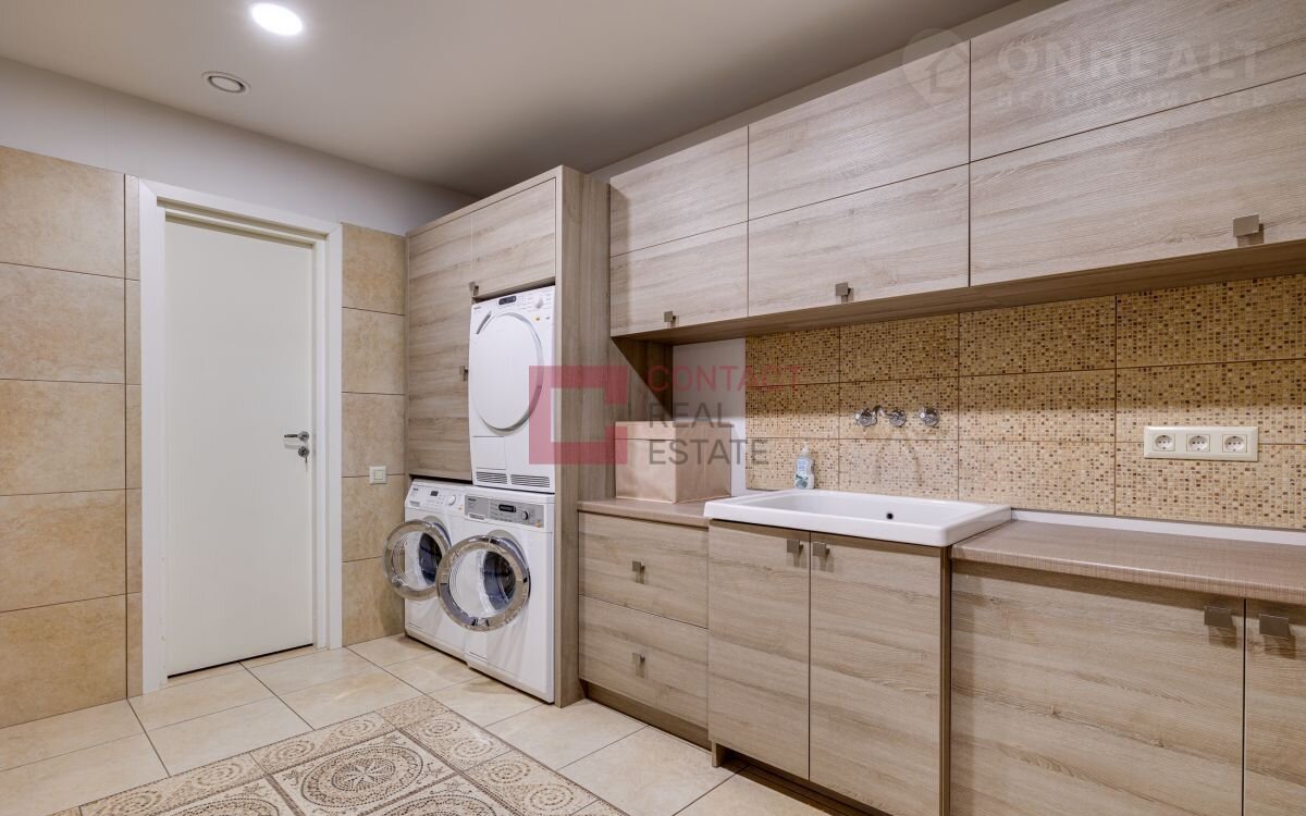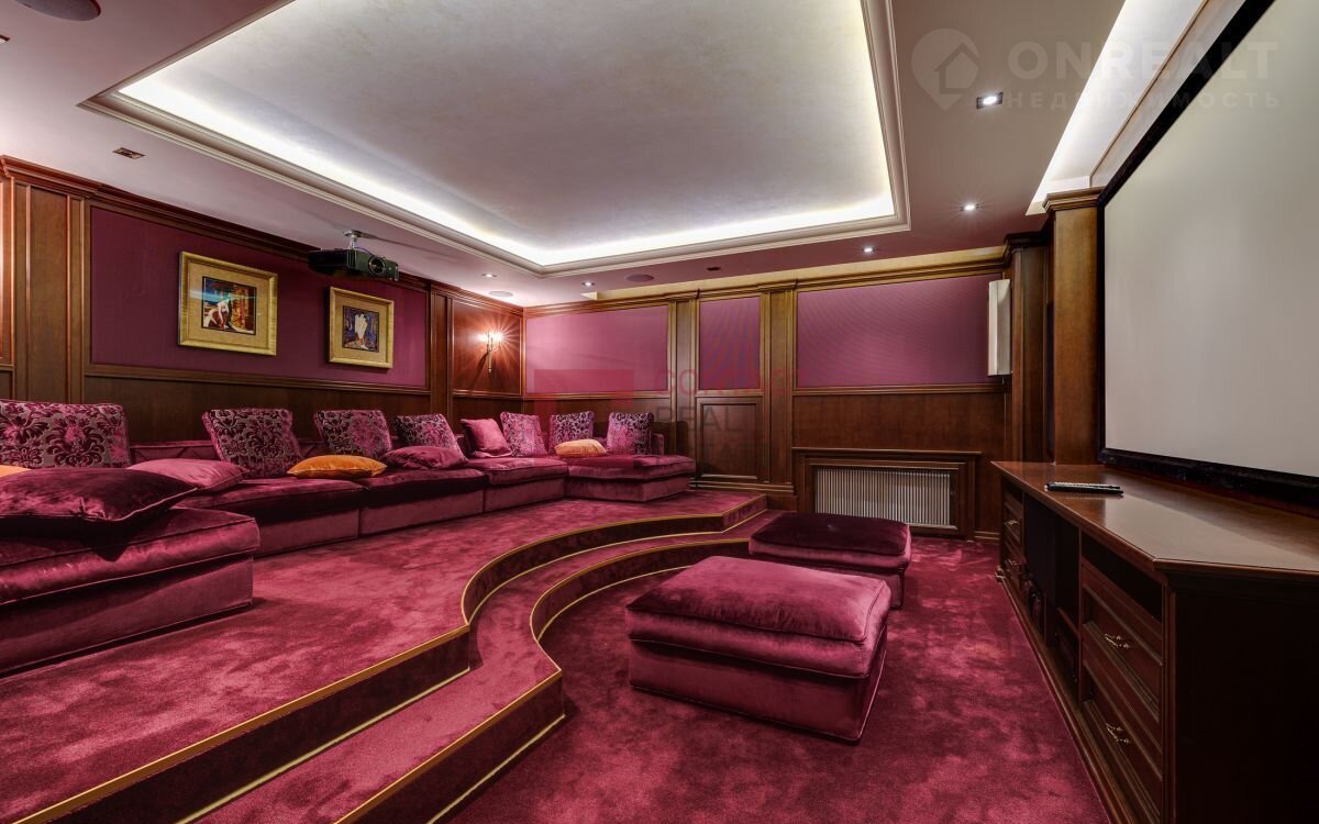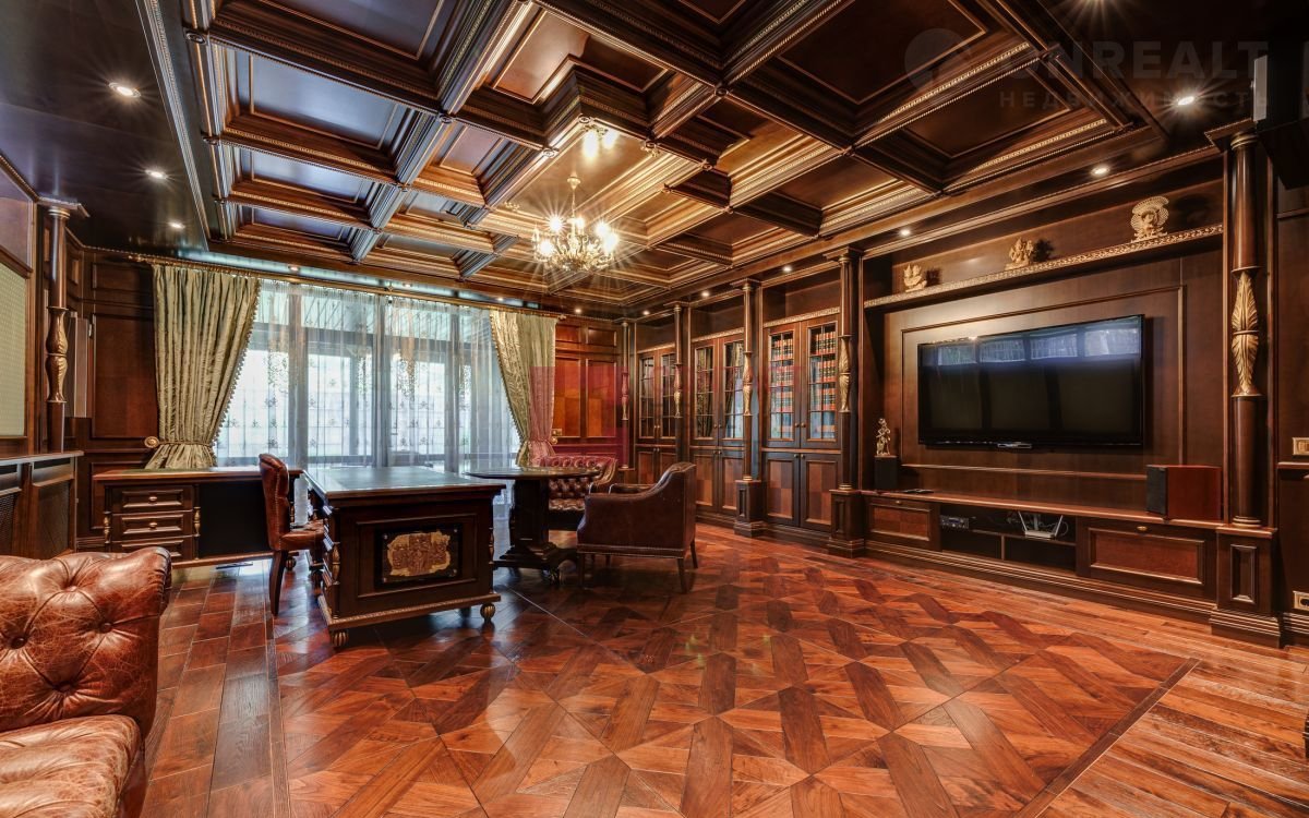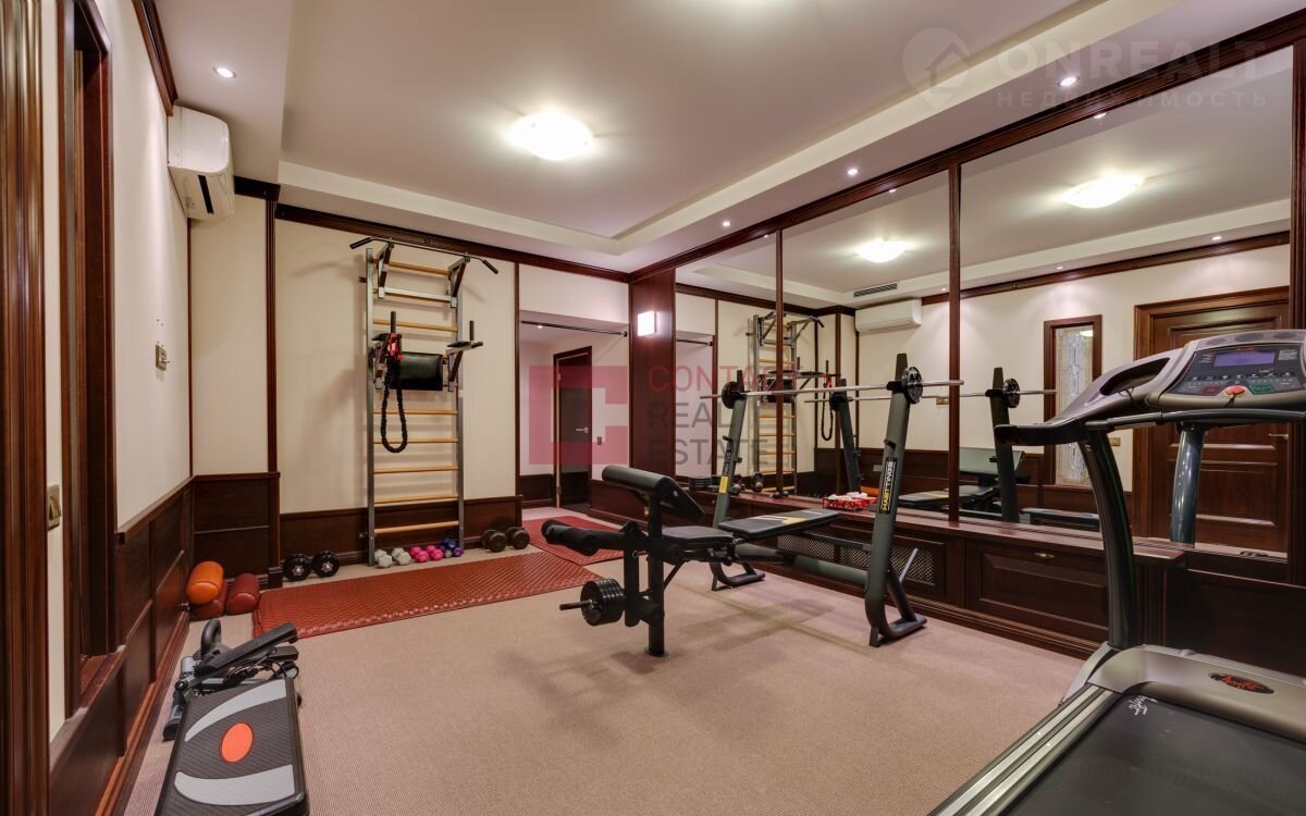 Цоколь: кухня-столовая с выходом на открытую террасу, каминный зал, кабинет, СПА-зона (сауна, комната отдыха, с/у), спорт-зал, кинотеатр, постирочная с хозяйственной комнатой, гардеробная.