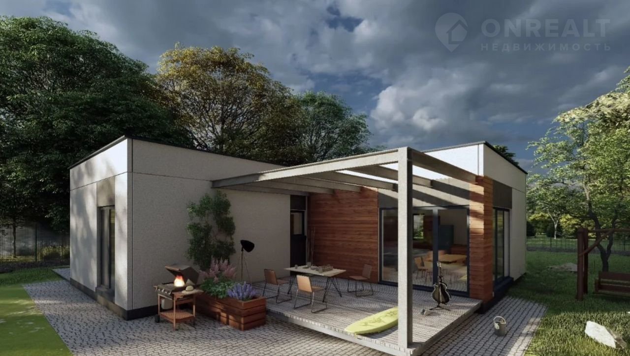 С террасы дома открывается прекрасный вид на закат (юго-западная сторона), так как участок расположен на возвышенности и соседние участки ниже его.