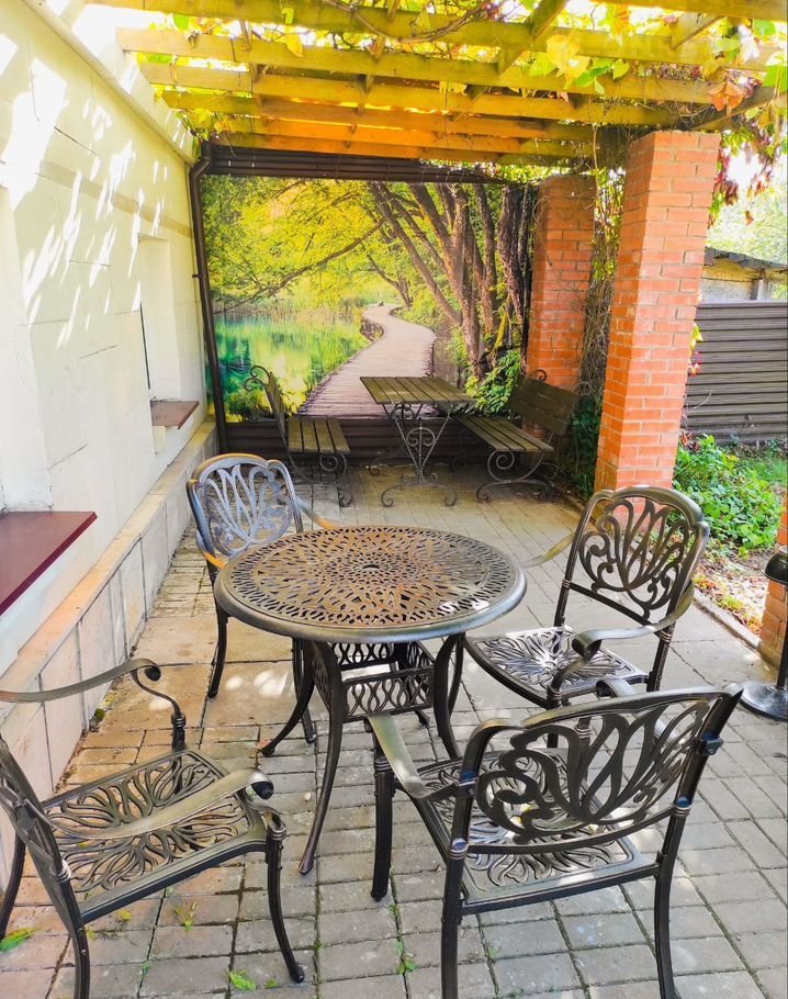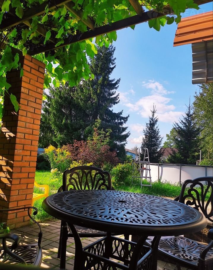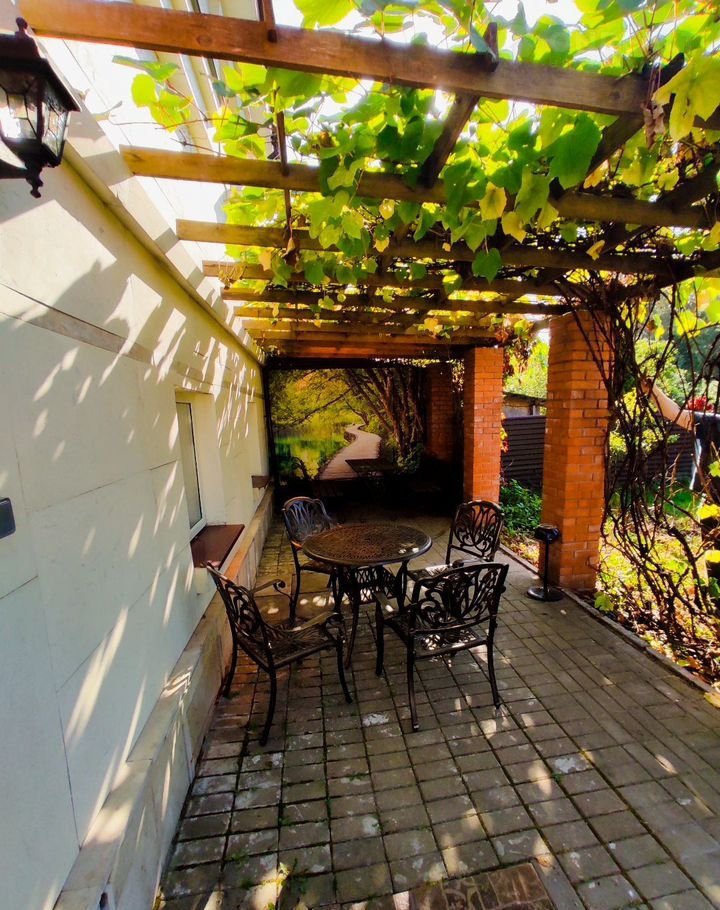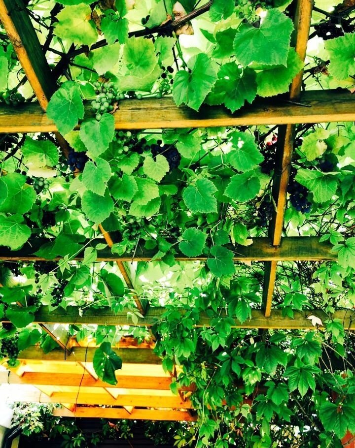 Патио укрыто перголой с сортовым виноградом, создаёт тень и прохладу летом.