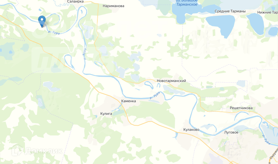 Участок огорожен забором. С двух сторон от участка проходит асфальтированная дорога, можно доехать до р.Тура и до озера.